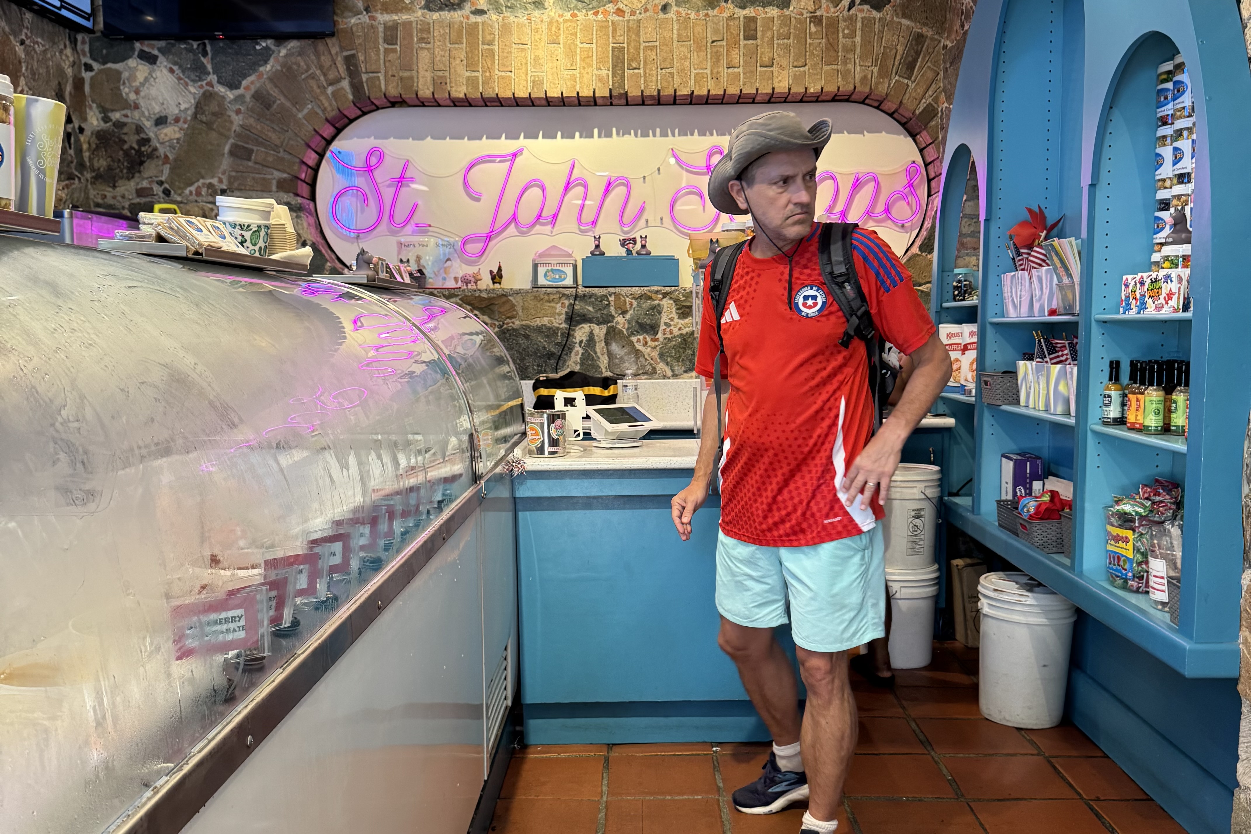The family decided to walk back via Mongoose Junction. The “bio”  for Mongoose Junction claims to be St .John’s premier shopping and dining destination “with a collection of fashionable shops and restaurants in a unique architectural and tropical setting unmatched in the entire Caribbean.” Miriam had had ice cream on her mind and had been hinting at it for several days now, so we happened upon St. John Scoops of Mongoose Junction and that was the moment when her fondest wishes were realized. As the family walked back with ice cream dripping from the cones, of more interest to me were its chickens, roosters  and other colorful buildings in this historic neighborhood Enighed.