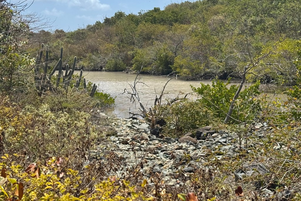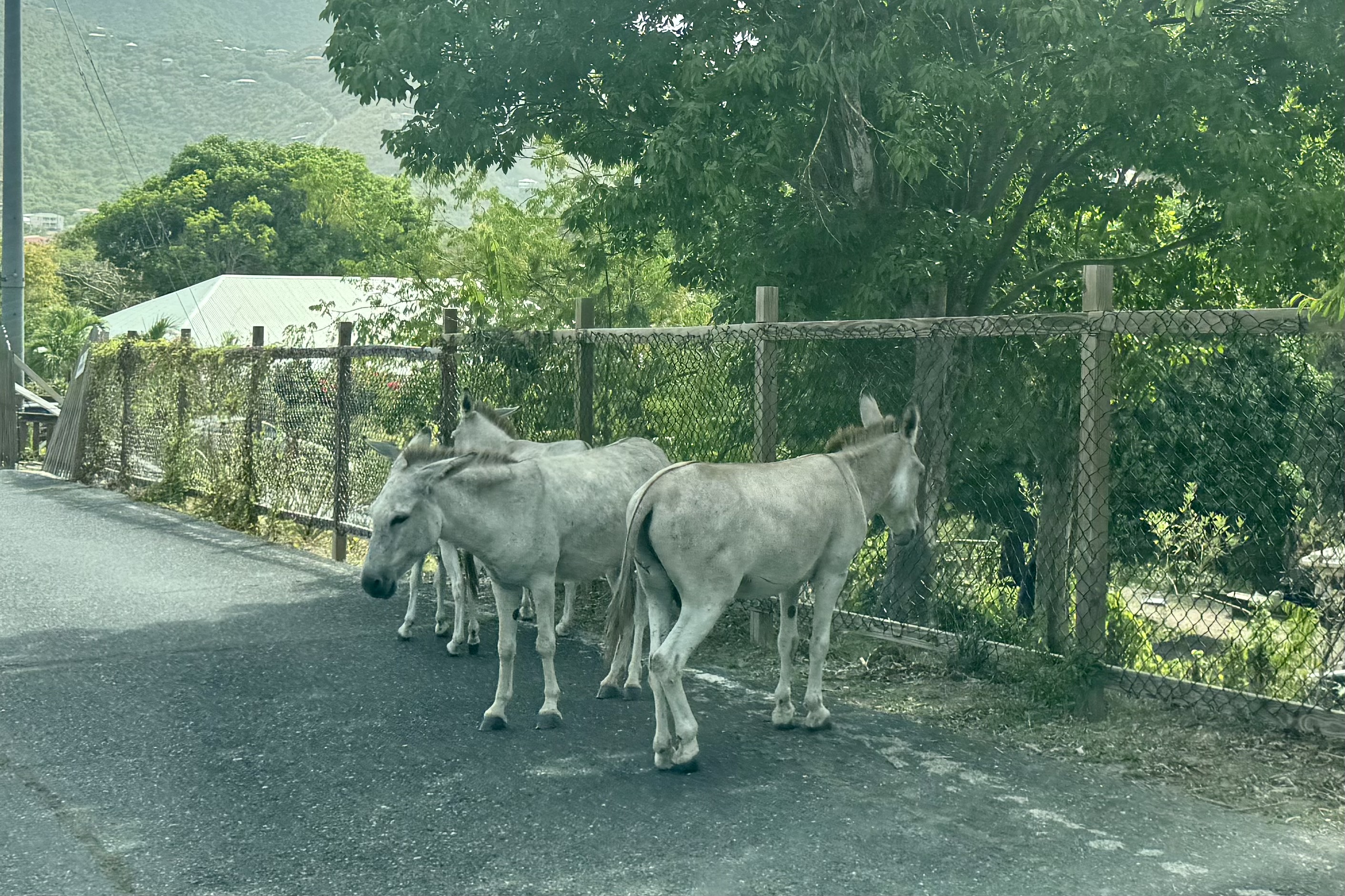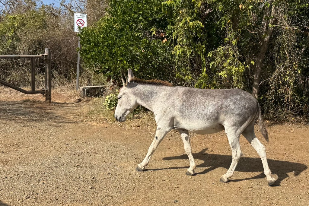 We were greeted at the trail head by a couple of the permanent  wild residents of St. John’s. –  a couple of stubborn and unpredictable domesticated equines (aka burros and donkeys) sauntering down the trail to Salt Pond Bay. Eventually they veered off into the scrub along the trail but I kept my eye out unsure of where they might pop up again. We made our way down the full sun, rocky, dusty half mile trail to Salt Pond Beach.  We came upon Salt Pond just before we approached the shoreline with a sandy strip separating the salt pond from the bay itself. Historically residents would harvest salt from ponds like this .