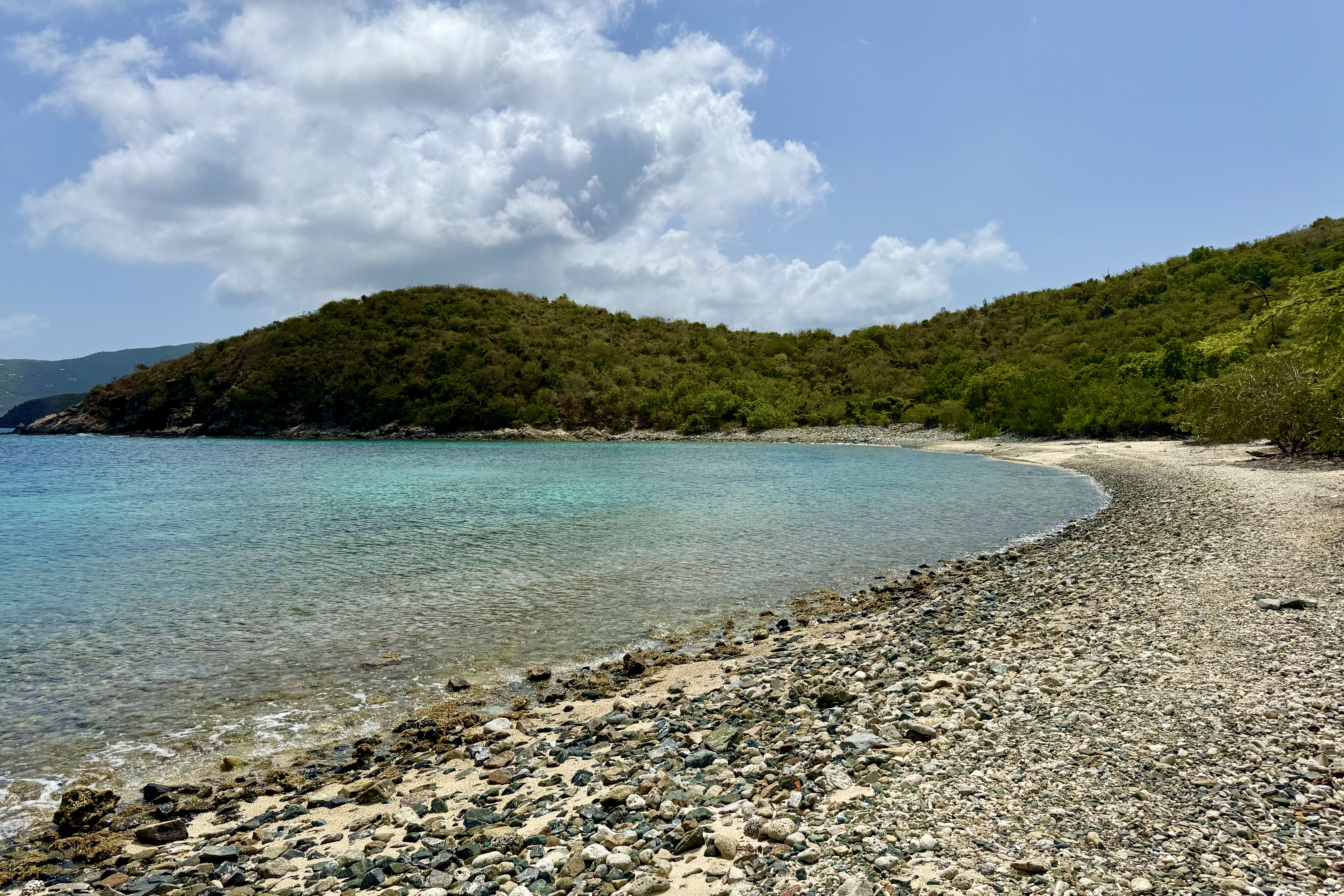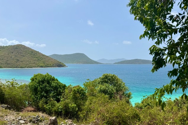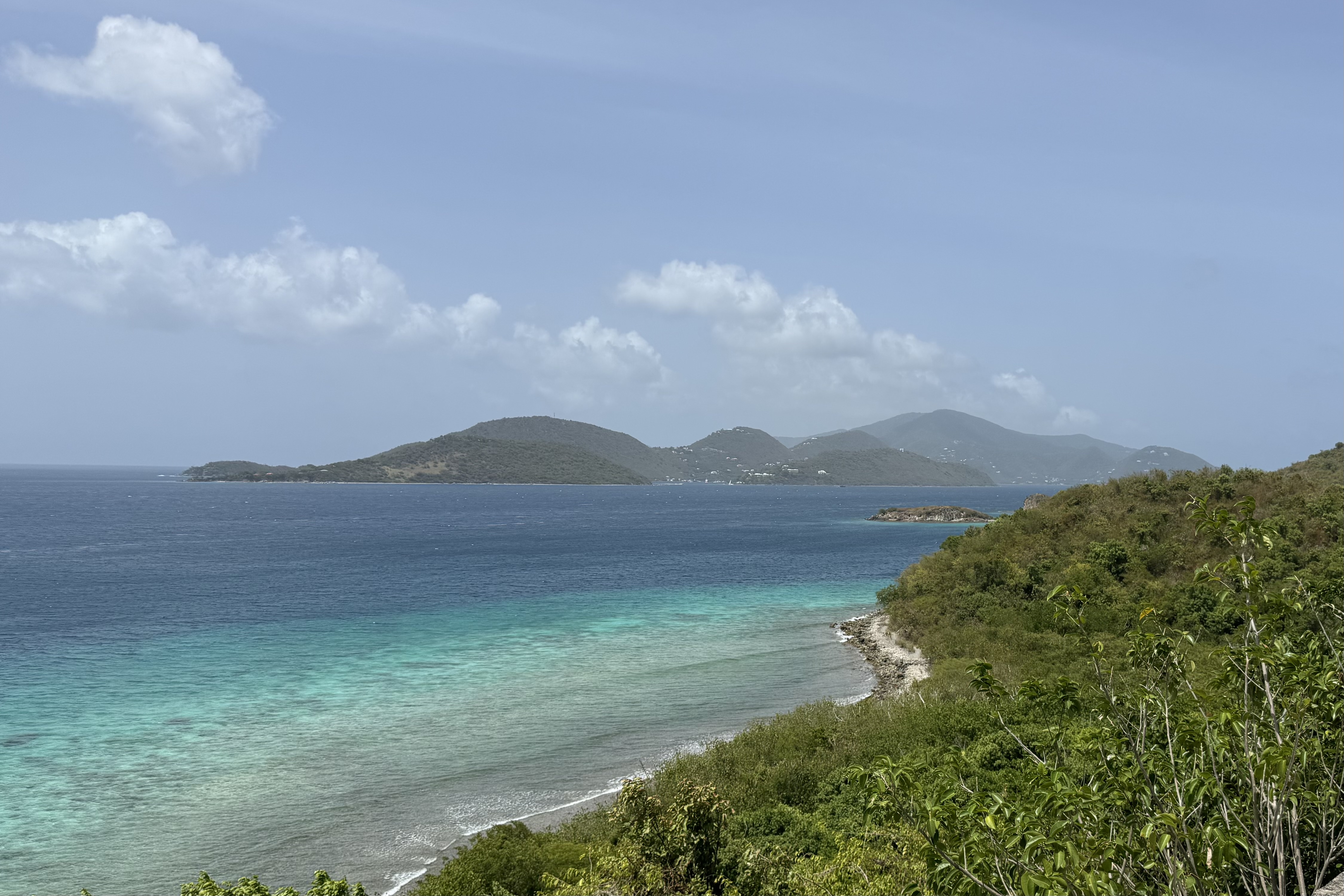 We awoke on the tenth to another beautiful Virgin day and after easing into the day via coffee poolside our adventure was to Watermelon Cay. Parking was by the Annaberg Plantation and to reach the Cay Beach there was an an .8 mile coastal walk on the Leinster Bay Trail- a more leisurely walk compared to the our more strenuous hikes. It was bordered with sea grape trees and mangroves instead of cacti and scrub vegetation.