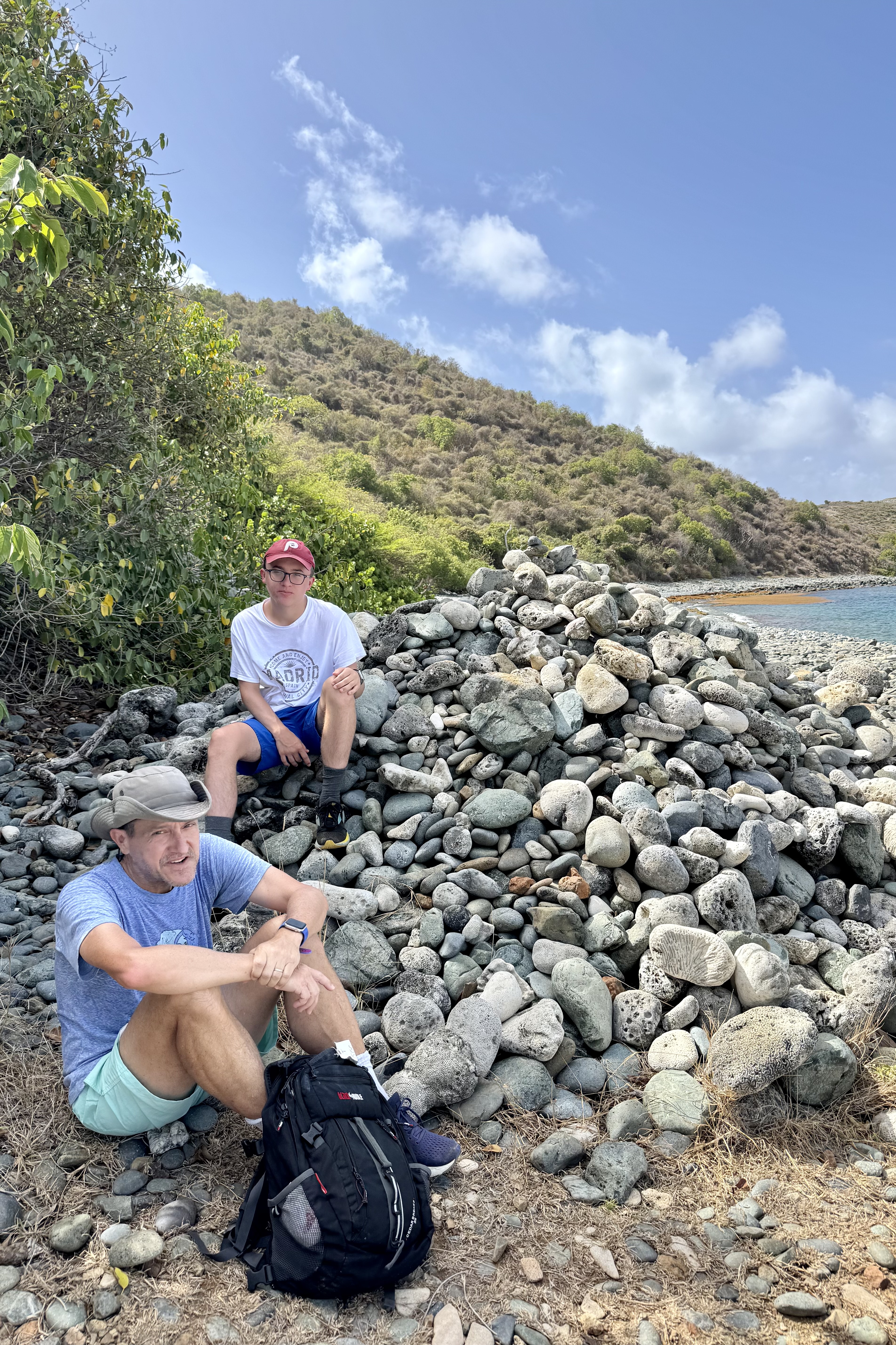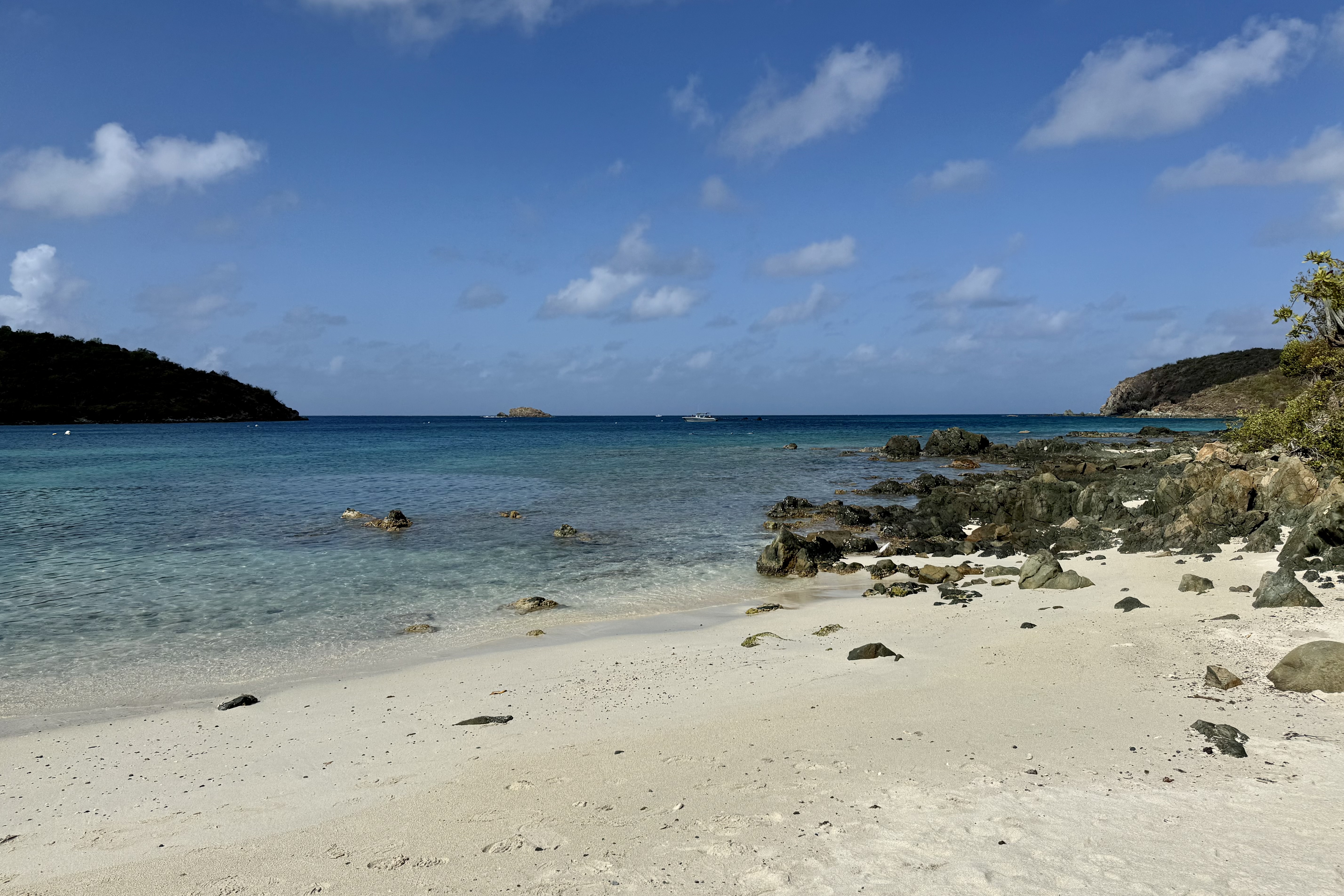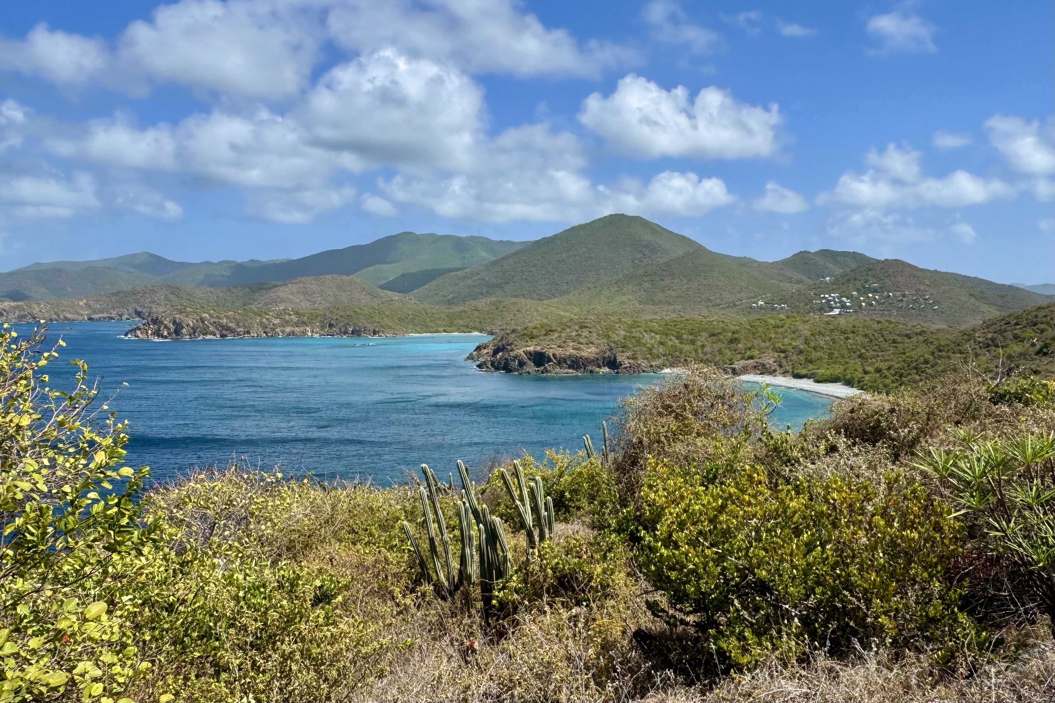 We awoke on the tenth to another beautiful Virgin day and after easing into the day via coffee poolside our adventure was to Watermelon Cay. Parking was by the Annaberg Plantation and to reach the Cay Beach there was an an .8 mile coastal walk on the Leinster Bay Trail- a more leisurely walk compared to the our more strenuous hikes. It was bordered with sea grape trees and mangroves instead of cacti and scrub vegetation.