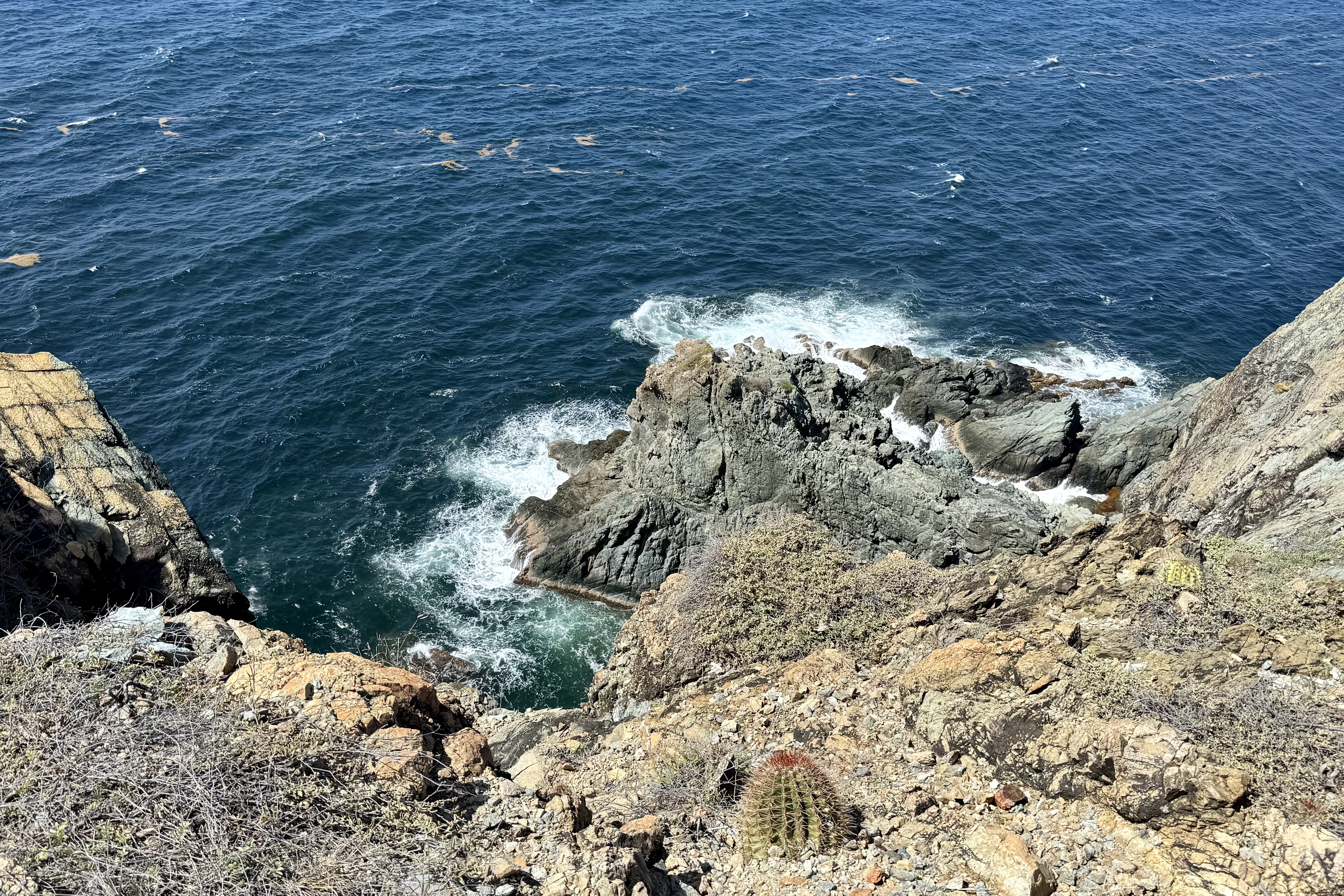 In  that the day was heating up and it was already 9:15am, we opted to make our way east and across Salt Pond Bay and the sand beach.  This section was easy until I reached “blue cobblestone beach, ” the nickname for the shoreline here of volcanic stones that have  a bluish-gray tint. Now it was slow careful steps so as not to roll an ankle on these rolling shifting stones with each  step a bit of a wobble and a clatter. But once back on firmer ground the trail began to climb up,  mostly in full sun, through dry coastal scrub, a plethora of the very  phallic Turk’s Cap Barrel Cacti, and views of the Caribbean’s turquoise waters.