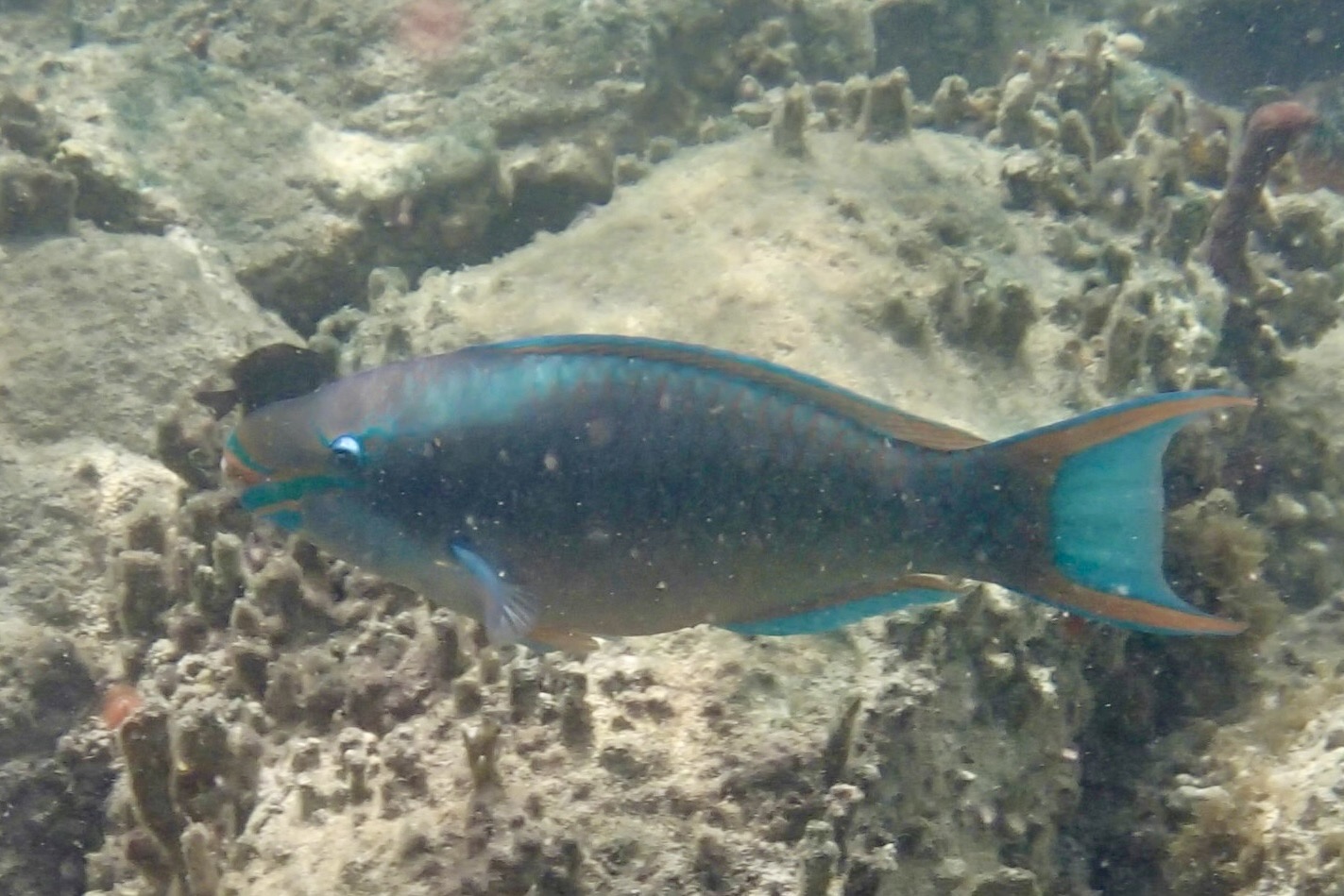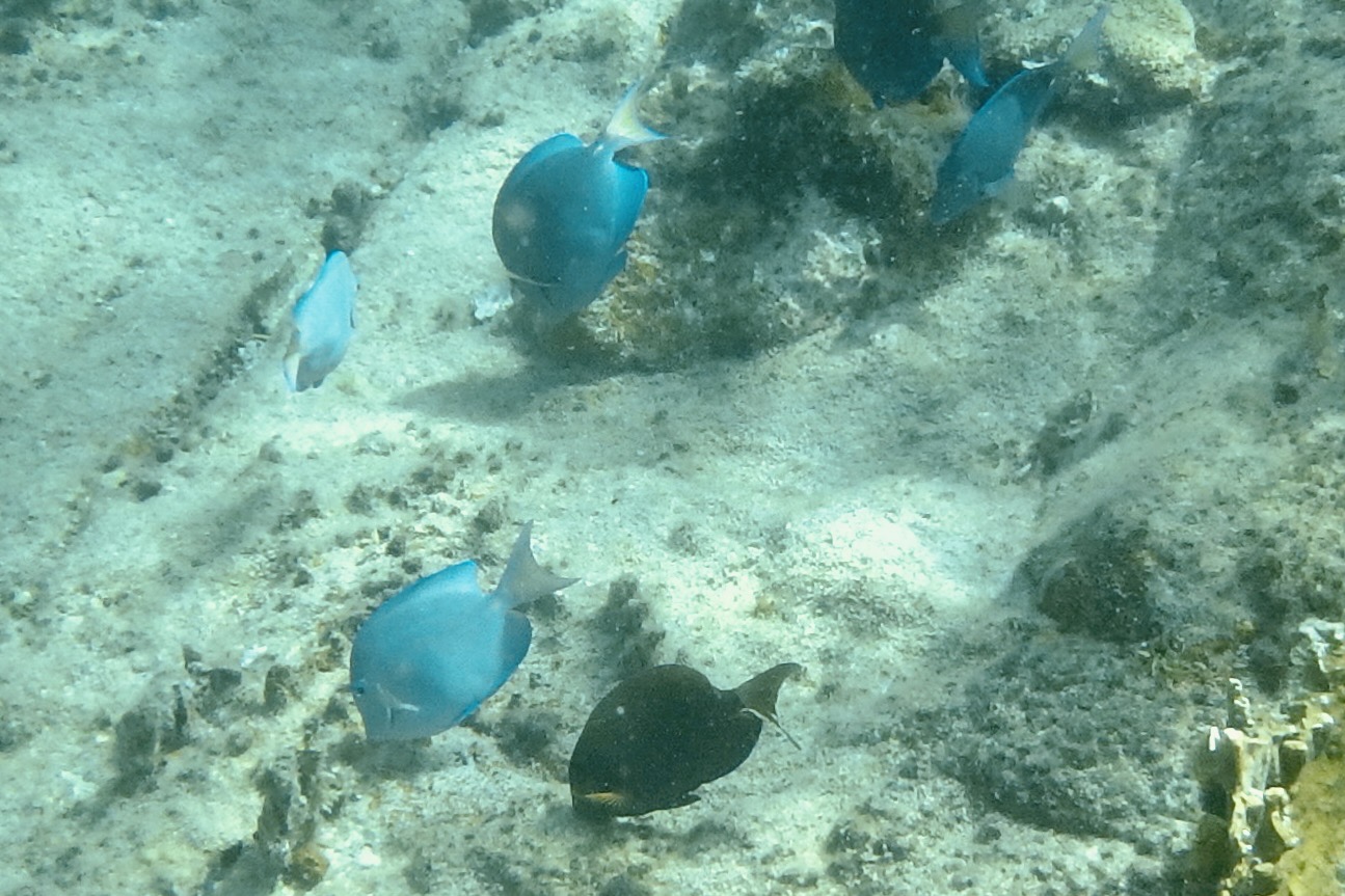 Our hunch was right and we were fortunate that we didn’t have to share this  bay with an overdose of other snorkelers.  It was now time for snorkeling and time to face the awkward task of entry into this underwater world. It  should  be easy from this  sandy beach but donning the gear was not without its comedic side. Do I sit on the beach and don the fins?  But I recollect that when walking in them previously, I waddled like a penguin. So I waded out into shallow water at the beach midpoint and plunked myself down. It seemed to be going well as I  struggled to put on penguin shoe #1 until a small  wave arrived and not only moved me around but swept the other one towards shore. I somehow eventually managed to secure both flippers on to my feet,  secure the mask to my face, and get the snorkel into my mouth.  I  quite ungracefully tried a dolphin dive into the water resulting in getting a snorkel full of water and a mask that became an indoor pool for my face. Seems I forgot to push up the forehead hairs thus breaking the seal. But eventually success!  I was cruising along toward the rocky ledges of shoreline and its  coral gardens and reef fish. Parrot fish and blue tang abounded  and I was enjoying the metronome of sea fans. It was exhilarating.