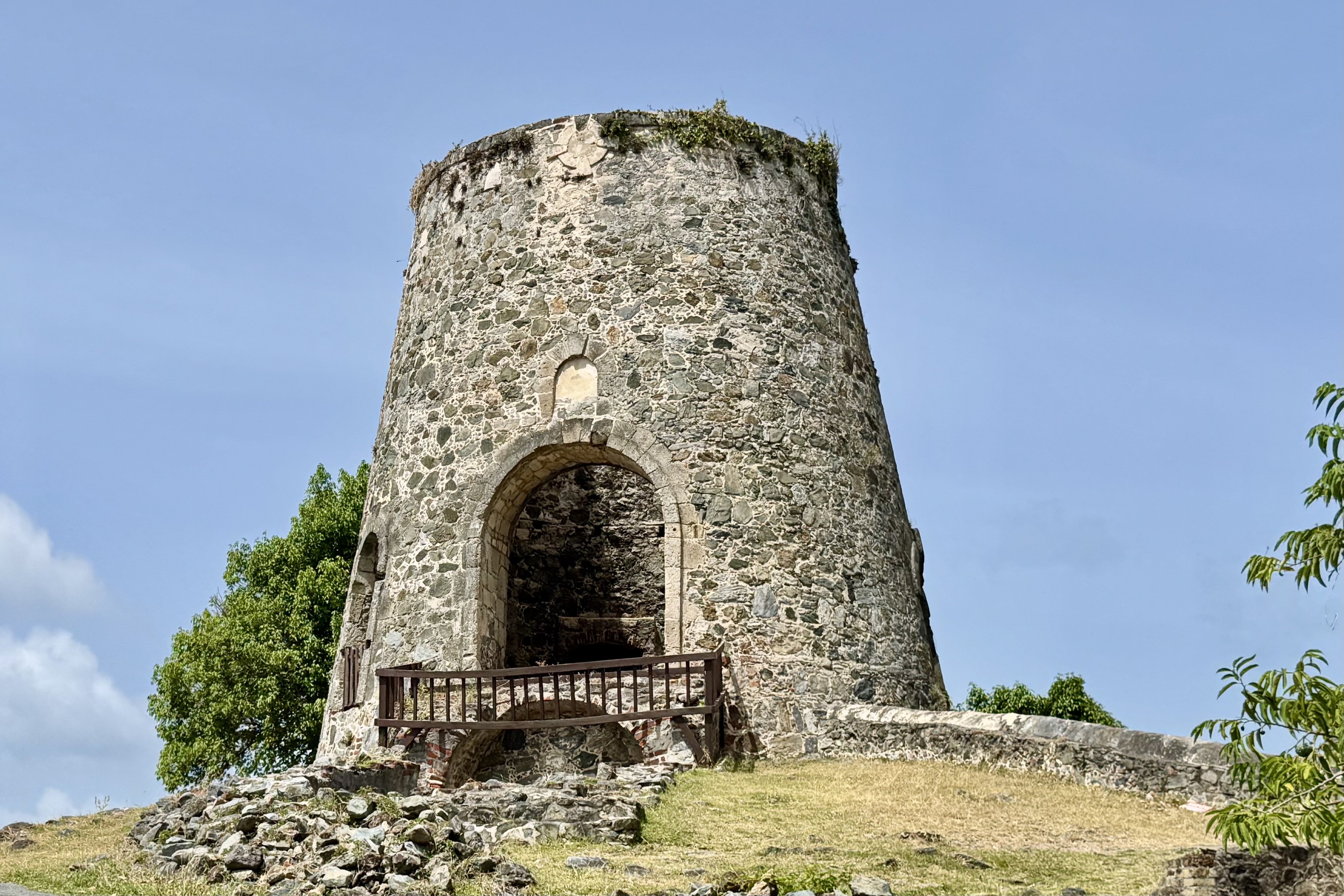 Having had an extremely satisfying snorkel, it was time to retrace our step back to the car and tour the Annaberg Sugar Plantation (Anna’s Hill in Danish). This decayed ruin of a once thriving producer of sugar, molasses, and RUM relied on slave labor to grow cane, crush the stalks, boil and export sugar. With the leftover molasses, fermentation, (probably know since Adam and Eve ate that fermented apple) magically turned the molasses into rum and thus these plantation became large Caribbean cocktail factories and the planters got rich, the slaves got exhausted and many a sailor got drunk. Annaberg thrived until the mid-1800’s until hurricanes, droughts, depleted soil, emancipation of slaves and competition resulted. By the end of the 19th century Annaberg was just ruins, the ruins we see today over looking Leinster Bay.