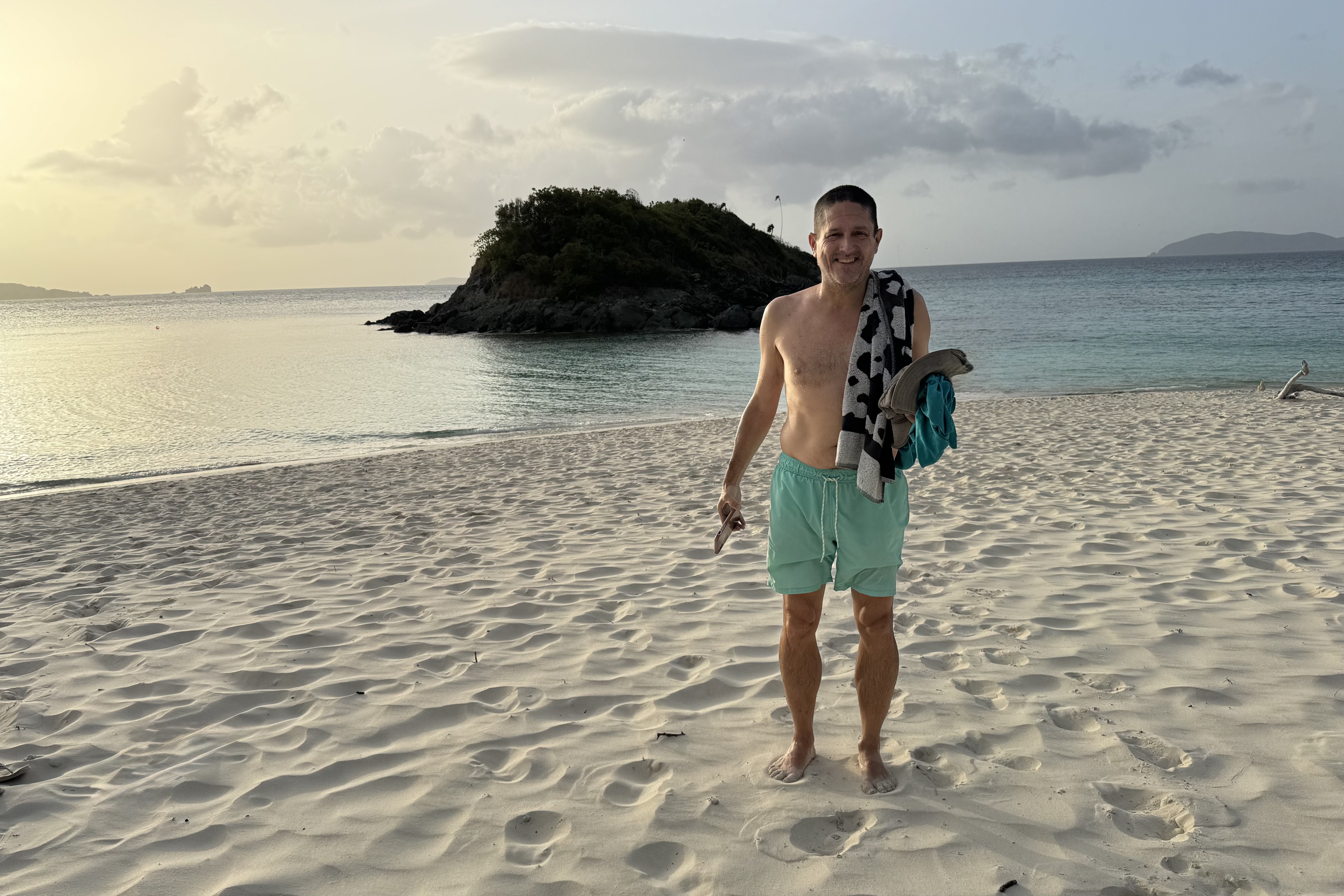After one of our express meals Nick and I opted to discover Trunk Bay, one of the closer reefs to Cruz Bay, popular with tourists, and and well developed beaches with food stalls, restrooms, showers, and an entrance fee. It is often ranked among the world’s most beautiful beaches etc. This evening, without a swarm of sunbathers, cruise ship crowds,  snorkelers and any other variety of tourists,  it was indeed beautiful.  I had not intended to snorkel and just went along for the ride to keep Nick company but I did transport my gear down to the beach.  And even though it was not on my agenda, it took only minutes to respond to the alluring vibrations of the turquoise water and decide to don the gear and the enter the calm bluish-green shallows and follow the underwater snorkeling trail. After a few minutes I determine this trail was designed for brand-newbies  and most likely a more gimmick than a “real”  snorkeling experience. It  was underwhelming and  in no way comparable to the one on St. Croix.  So I ditched the trail and headed over towards the rocky outcropping just east of the trail, Trunk Cay. The upside of being here was the sun was beginning to set illuminating the sky to a pale yellow,  the bay was calm, we were on a gorgeous beach and there were very few people.  We enjoyed a leisurely snorkel admiring the giant boulders of brain coral along with the regular population of blue tangs, parrot fish, damselfish, angelfish, sea fans and corals.
