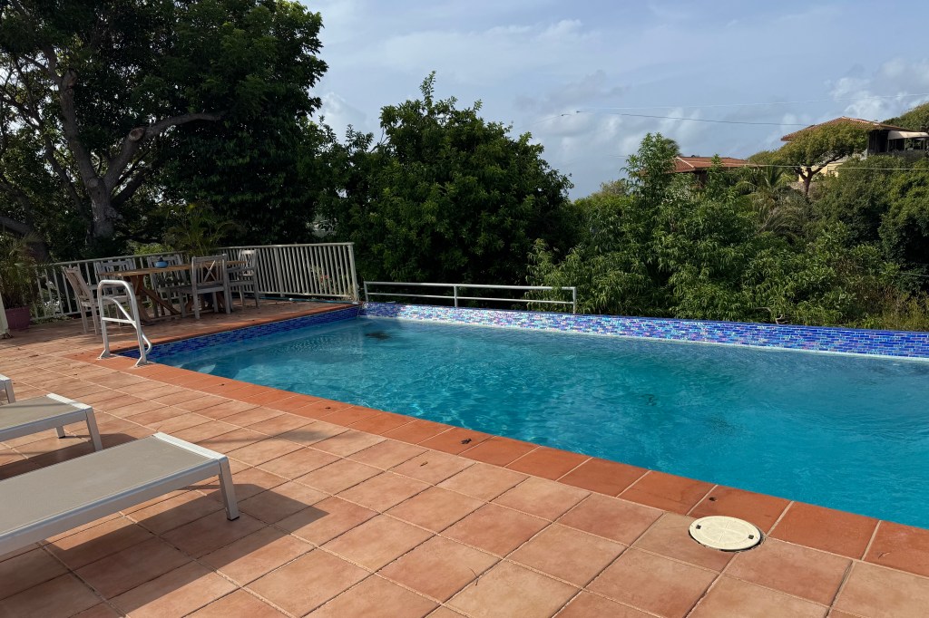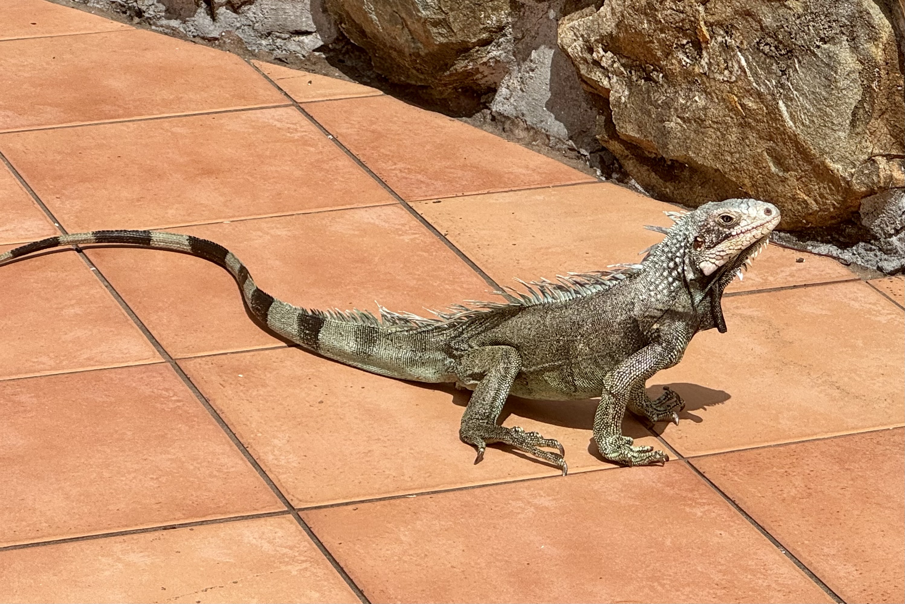 I soon decided on a walkabout and headed first down to the beach below which  was  basically commandeer by  the Westin Resort and littered with a large array of sea toys including lounge chairs, umbrellas, kayaks, sea fun adventure boats, SUPs, and water bikes. Though this beach and all beaches in the  U.S Virgin Islands are public, their chairs and other amenities were not and it didn’t really seem too “public” to me with its attendant and all the paraphernalia.   Since I was decidedly on a “walk about” I opted not to do a “swim about” at the beach especially since I did not have a towel and was not in my swim gear. Thus, I meandered back up towards the villa and about the  roads beyond, hoping to find a path down to the next bay over. But it was not to be.  Upon returning to the villa I was warmly greeted by a large Green Iguana, Iggy, and I was hoping that we would develop a relationship as it turned its head toward me. It looked at me like it owned the place as it was pausing in the sun and I was the interloper. Then like a flash it made an abrupt about face and charged off to summit the stone wall where it dallied a while and dared me to get closer. And then like a shot something else grabbed its attention and it was off.