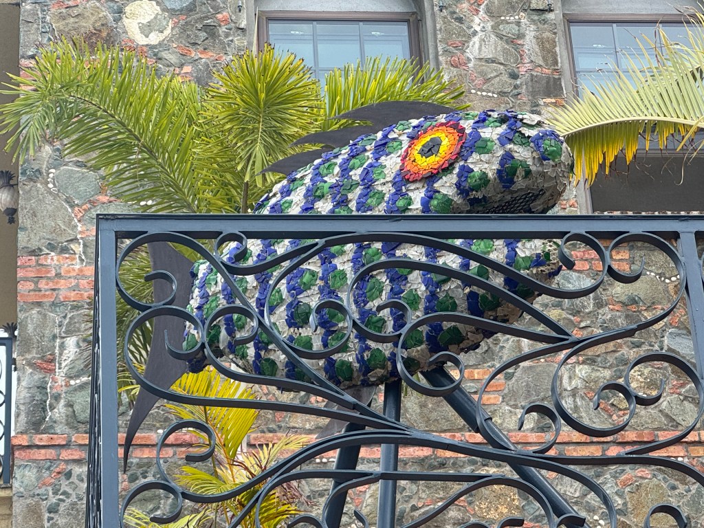 It was now time to return the snorkeling gear in Cruz Bay. As we wandered the dive shop area, we encountered a peacock with its iridescent blue coloring of the upper body and many shades of green in the long tail feathers. Right above it was a playful “Mosaic Fish” with tiles shimmering in similar shades of deep blue and emerald green… all part of the charm of St. John..