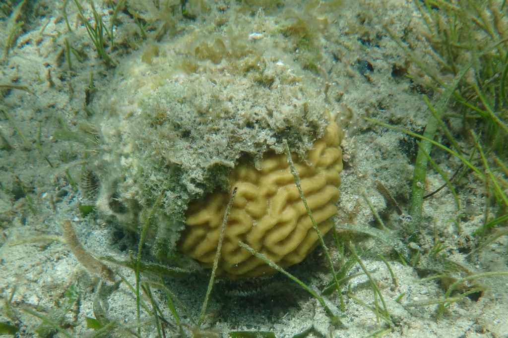 I decided to drift back toward the beach of Leister Bay over the sea grass beds looking for stingrays and turtles. While scanning for movement in the sandy sea gras beds, I spotted a Hawksbill Sea Turtle. It didn’t seem to mind my presence there and went about chomping on sea grass. I swam about with it, all the while bobbing around clumsily trying not to startle it. Shortly, I was able to flag Tasia down as she had the camera. Pretty good photo-ops for a couple of minutes but then with a few strong strokes it slipped away into the gras beds and I swam toward the beach .