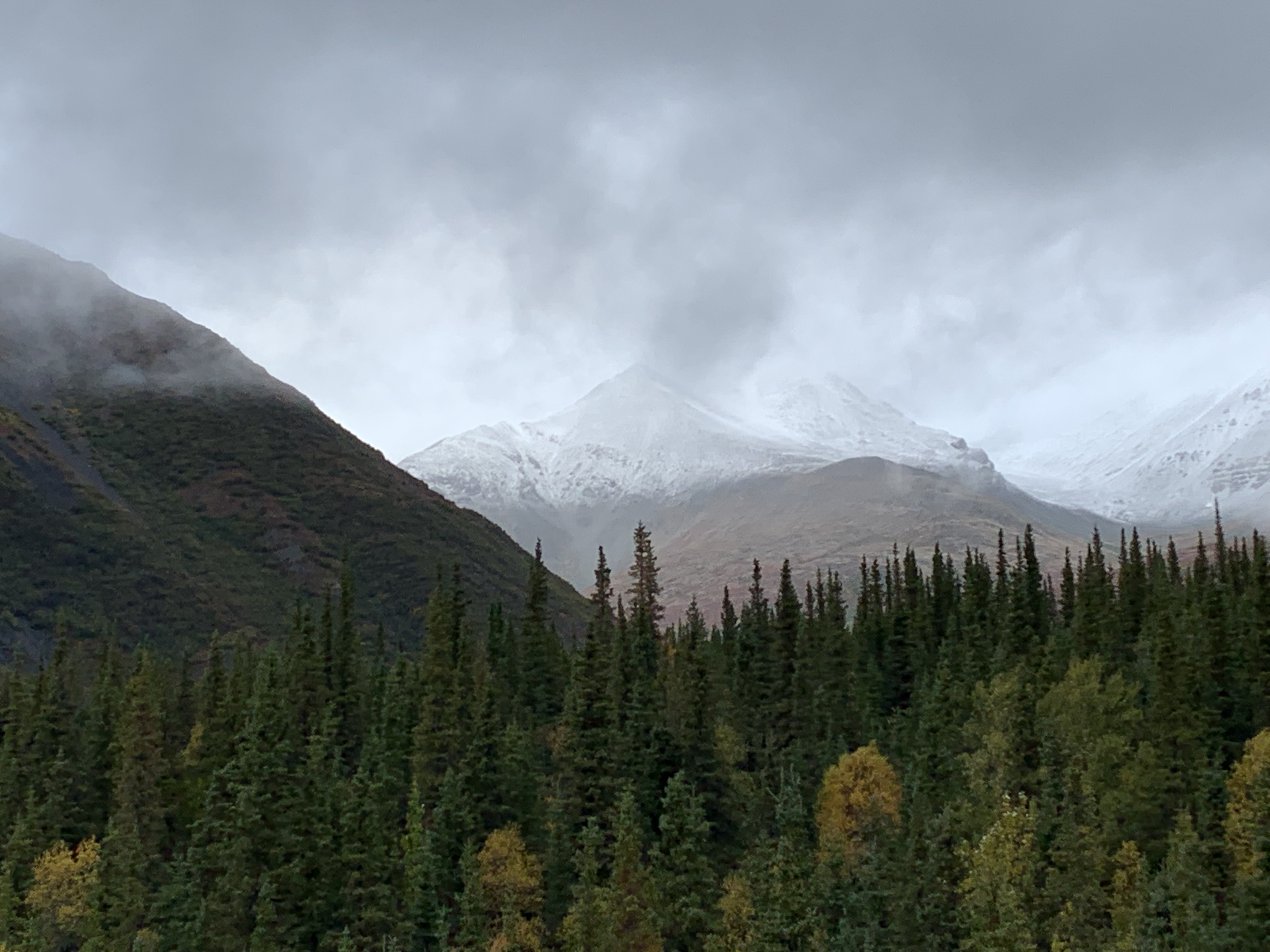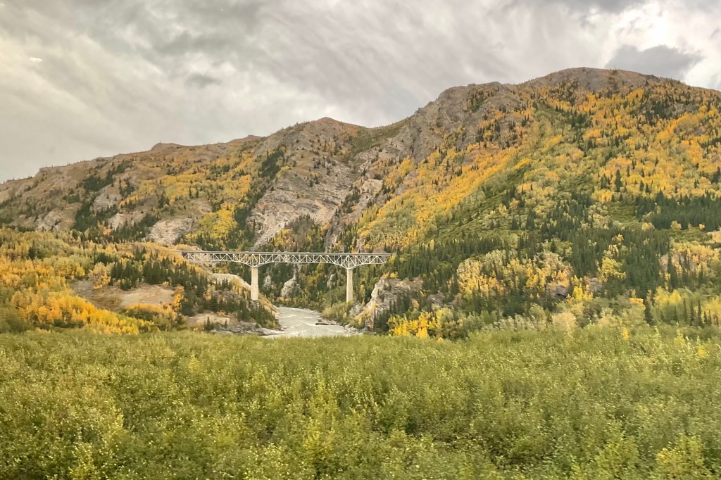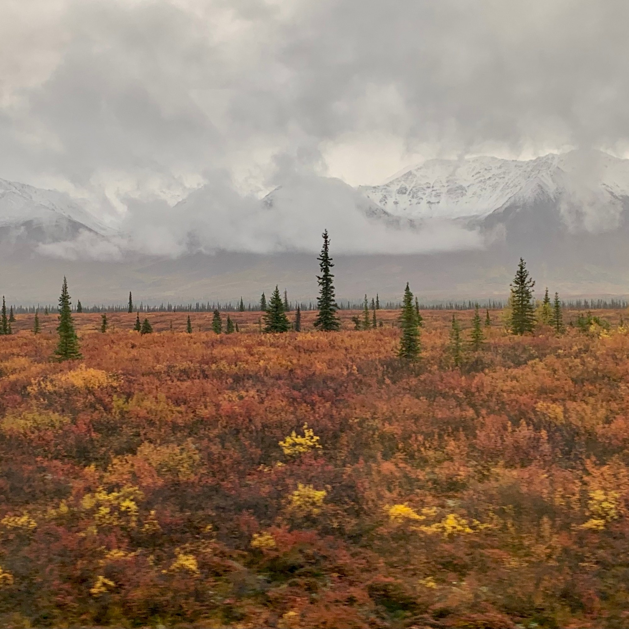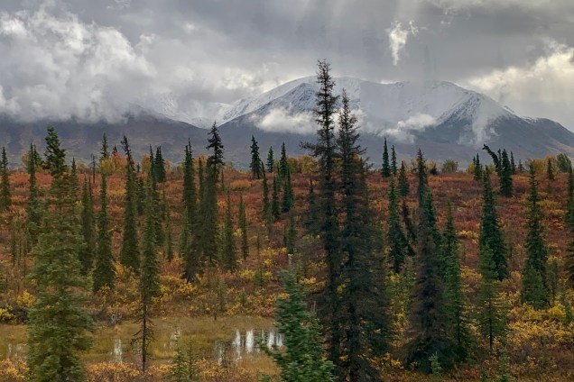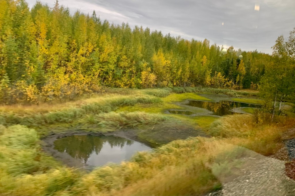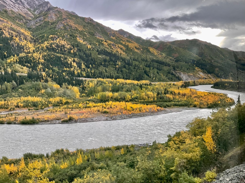 The section out of Fairbanks to the south was rolling hills, dressed up fancy in their fall finery, sporting shades such as bright yellow, mustard yellow, canary yellow, goldish yellow, sunflower yellow , faded yellow, lemon yellow, sunshine yellow (none of which was evidenced to us as an orb in the sky) and an occasional smattering of reddish and brown tinted leaves. With the leaves changing colors and, in retrospect, with the foul weather that lay ahead, this section on down to Denali was probably the most enjoyable and lovely section of the train ride! It was the “best” of the grey , cloudy, foul, fouler, foulest weather.
