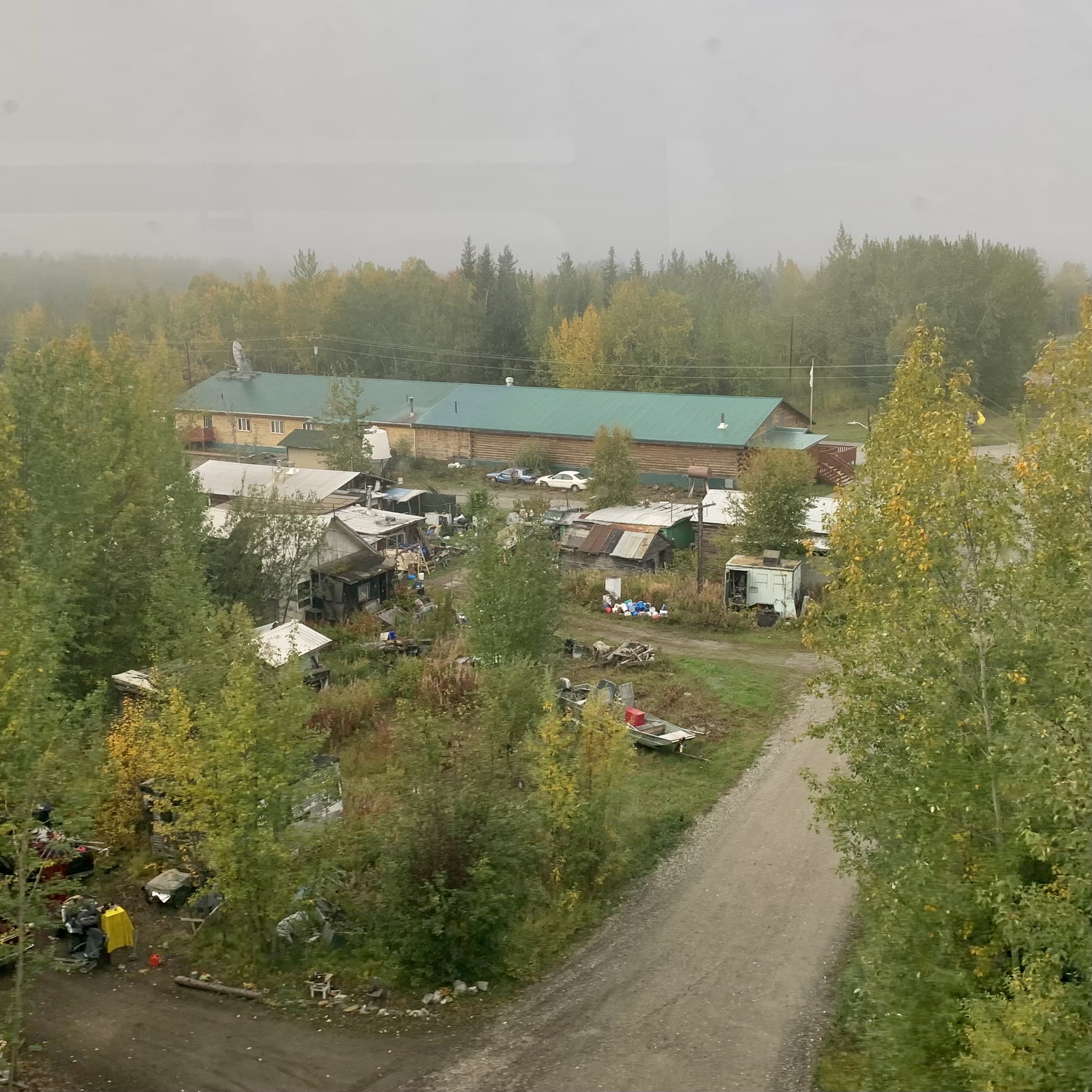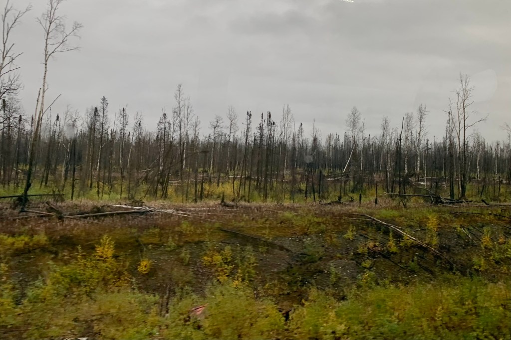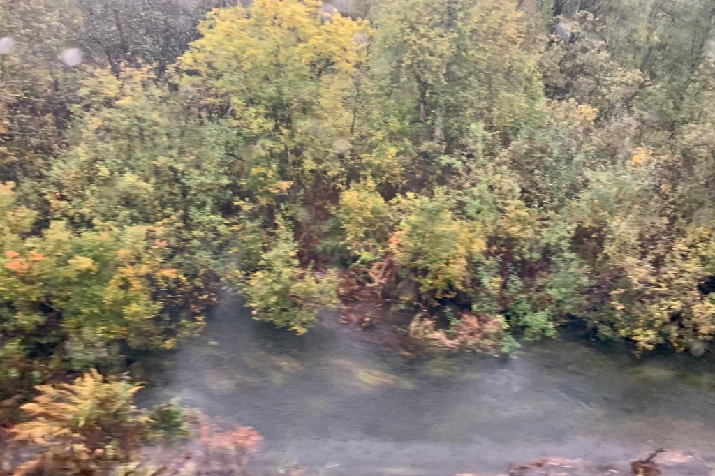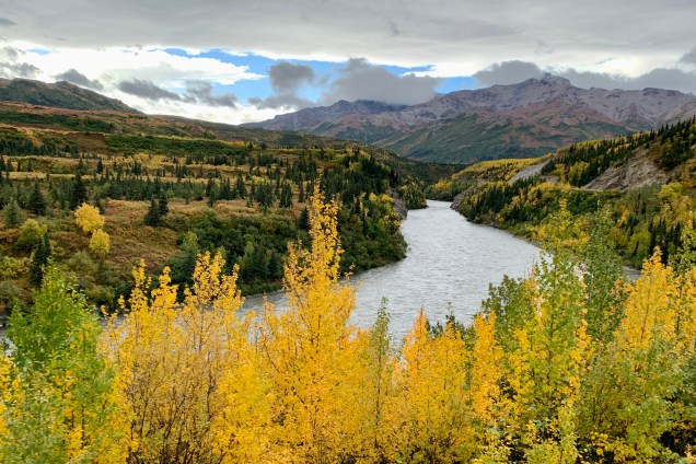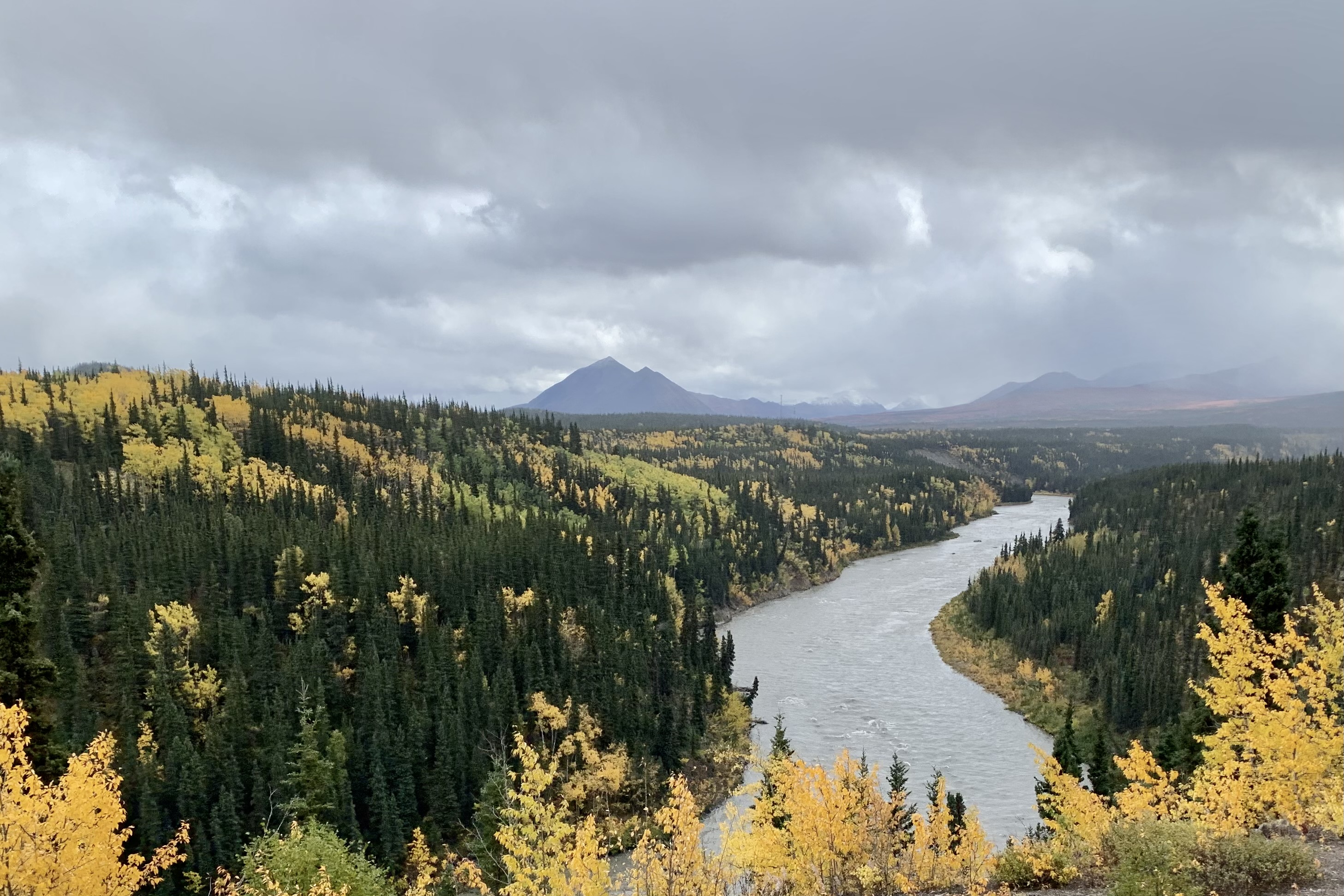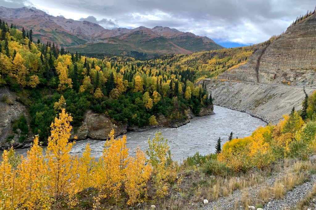The section out of Fairbanks to the south was rolling hills, dressed up fancy in their fall finery, sporting shades such as bright yellow, mustard yellow, canary yellow, goldish yellow, sunflower yellow , faded yellow, lemon yellow, sunshine yellow (none of which was evidenced to us as an orb in the sky) and an occasional smattering of reddish and brown tinted leaves. With the leaves changing colors and, in retrospect, with the foul weather that lay ahead, this section on down to Denali was probably the most enjoyable and lovely section of the train ride! It was the “best” of the grey , cloudy, foul, fouler, foulest weather.