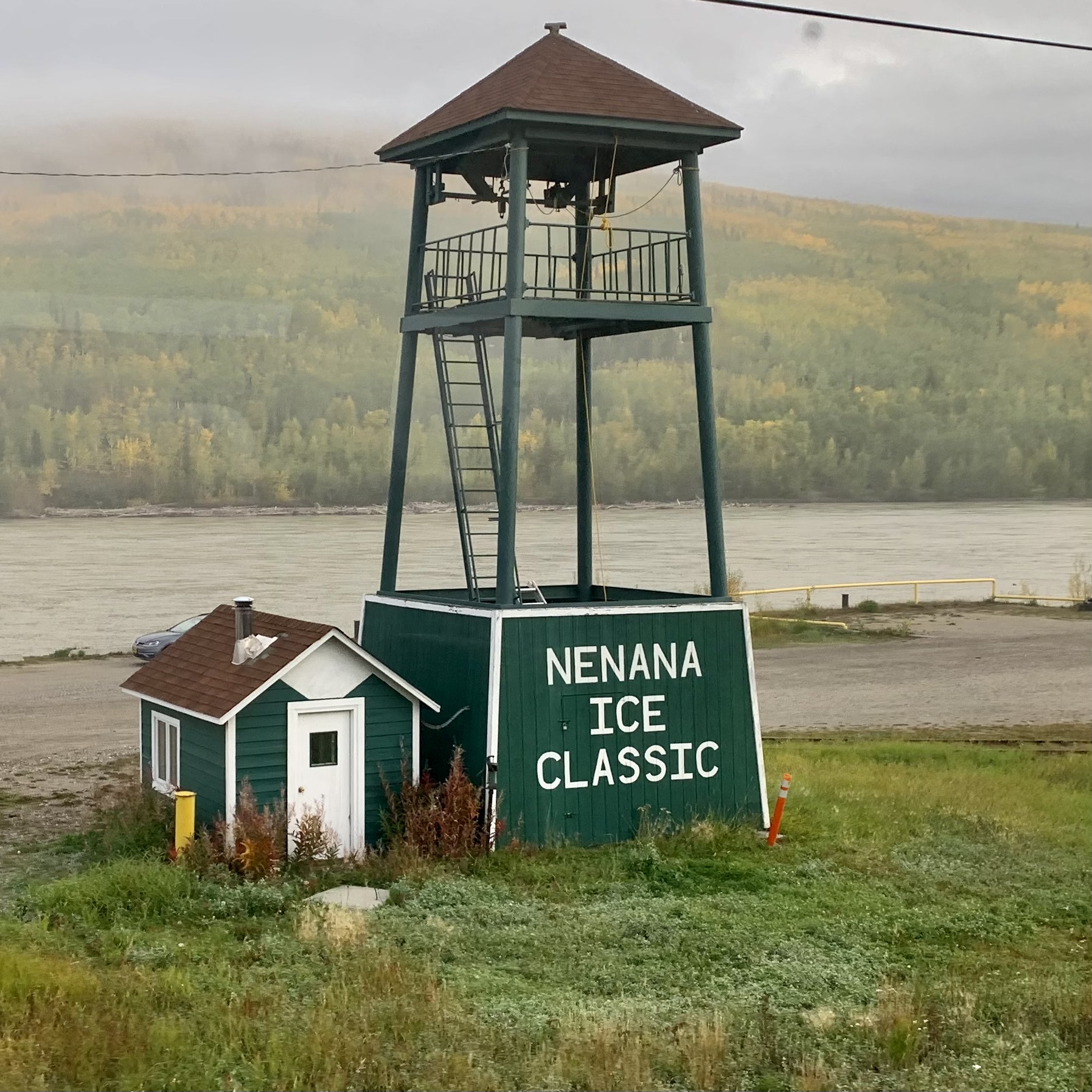 Since every town, city, state, village, municipality and berg desires a claim to fame Nenana has a couple. The Mears bridge still ranks as the longest span in Alaska and the third-longest truss bridge in the United States. Hmm Ho-Hum! BUT, the real claim to fame is the Nenana Ice Classic, a nature-based lottery. Since the train did not stop in Nenana, I was very disappointed at not being able top off and purchase a ticket for the 2023 classic. But, alas, I researched this and you will be relieved to know that if you’re reading this and a resident of Alaska you can get tickets at several hundreds outlets throughout the state. And if not, and you actually believe you can predict Mother Nature, you can buy a ticket by picking a date/dates in April or May and the time, to the closest minute, that you think the winter ice on the Tanana River will break up, mail it in to their office with your $3.00’s for each pick and they will fill out the tickets for you and mail you a copy (unlawful to mail the real ticket). No fancy lottery machines spitting out tickets here. A large striped tripod (see photo) is placed on the frozen Tanana River and connected to a clock. The winner is whoever comes closest to guessing the precise time when the ice beneath weakens to the point that the tripod moves and stops the clock. A real Alaskan twist one a lottery. A recent winning pool was $300,00. So buy your ticket and when you win by outsmarting Mother Nature, you can be grateful to me for putting you on to this event and give me a generous share!!! You better take your chances now, since with climate change , all too soon the river will not freeze over!
