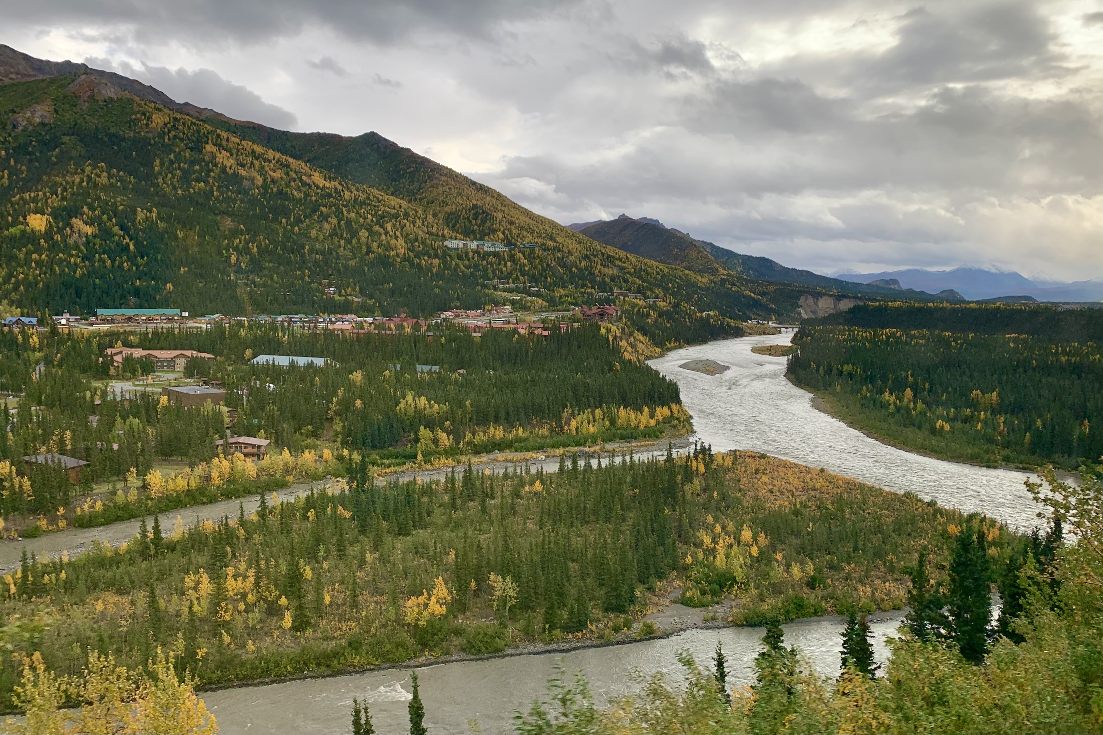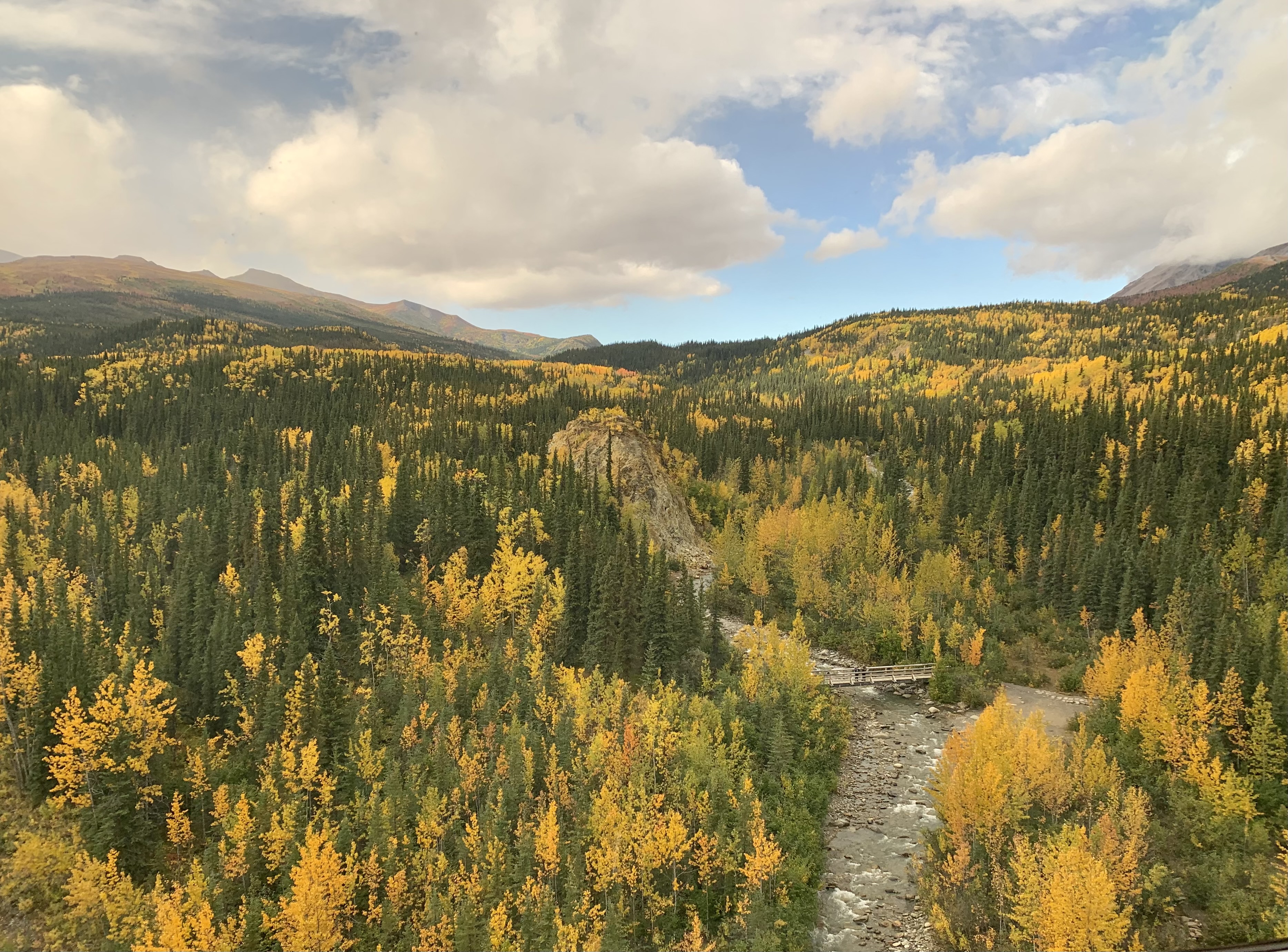The next part of the journey was the most enjoyable with its towns of Nenana and Healy, the Tanana River weaving through the country-side, the Mears Memorial Bridge, and on down to Windy Bridge. The metropolis of Nenana (population 358 in 2020) is at the confluence of the Nenana and Tanana Rivers. The train crosses the Mears bridge over the Tanana river and then winds around of town very slowly. I saw glimpses of this small town which has a gas station, several restaurants, a train museum, and it definitely does not appear to be thriving. The town never recovered from a population of 5500 once the railroad was complete like many other town of the boom and bust town in Alaska. Don’t think I will scout for property here. BUT…