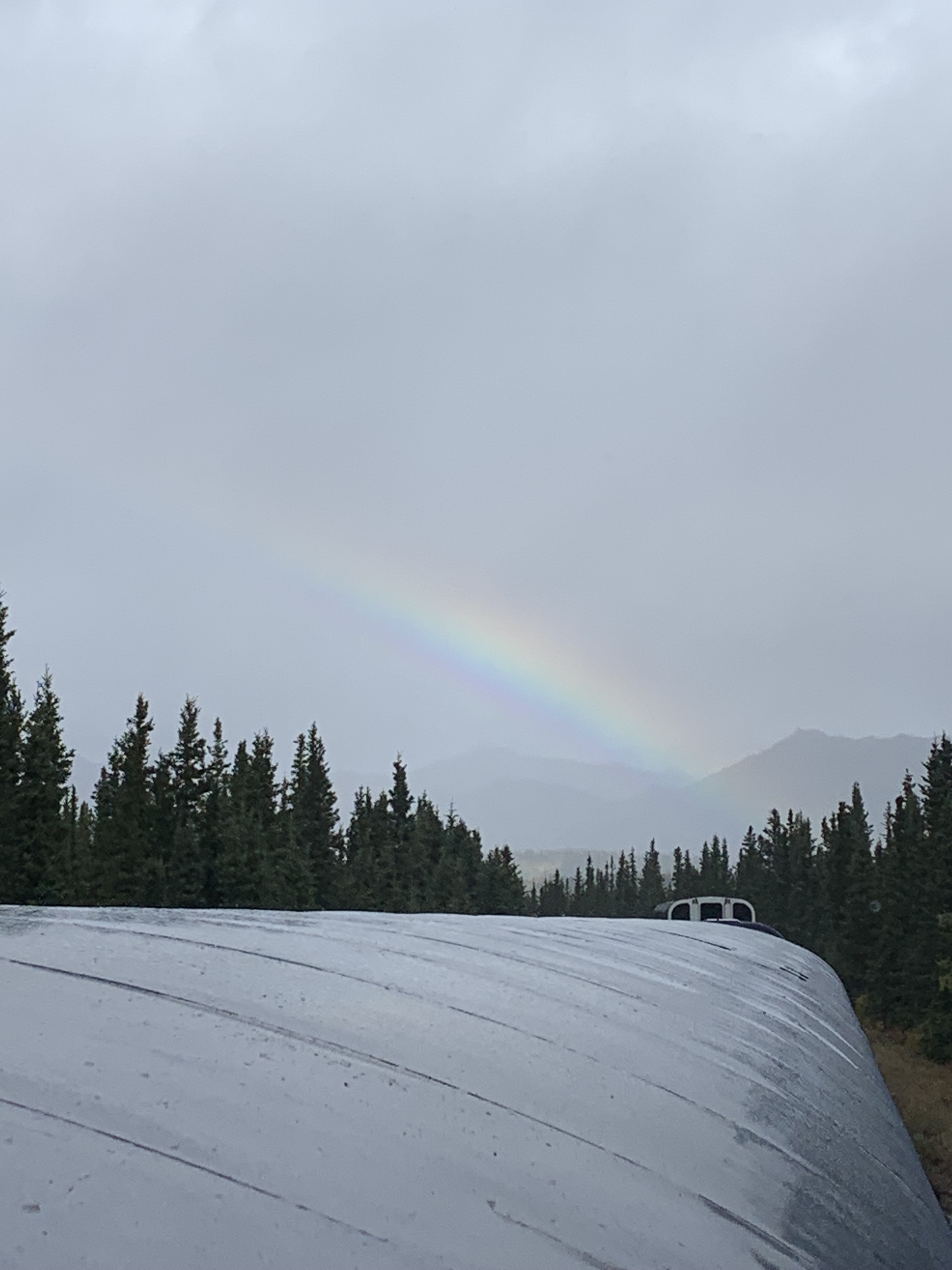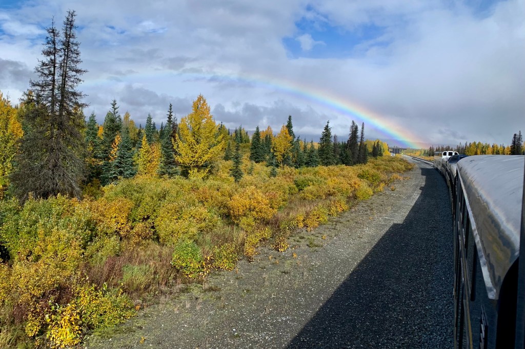 Traveling farther down south about 70 miles along the Denali park boundary and the Nenana River, North of Talkeetna, the tracks veered away from the road system and into the Hurricane area with views of the snaking Indian River. I am told that the train crosses over the 918-foot Hurricane Gulch trestle, the most expansive trestle on the Alaska Railroad route. It towers about 300 feet above the Chulitna River below (though some websites say it crosses Hurricane Creek) and allows for the possibility of breathtaking photo opportunities. One writer … “the highlight of this railroad day trip is the stunning Hurricane Gulch Trestle.” However, I was not stunned and did not loose my breathe either, as this breathtaking drop and trestle was totally obscured by rain and haze, or the site announcer of the hour was distracted and this awesome site was not announced. The rest of this journey is a rained out blur. Up until this point there was a strange beauty with much of the scenery seen through the scrim of rainfall. The frosting to go with the rainfall was the rainbows that popped up behind the train on a couple of occasions.
