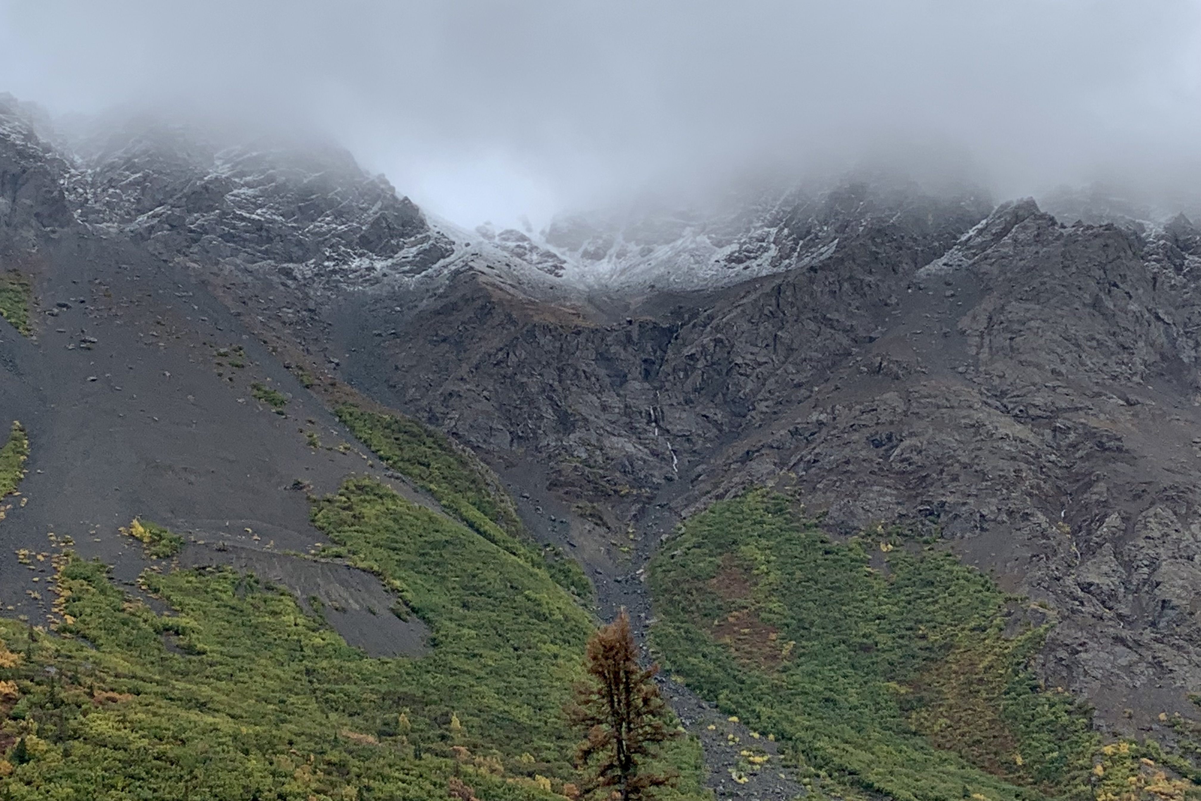 Just south of Denali National Park, Broad Pass is the highest point on the Alaska Railroad at 2,363 feet, with panoramic views of the Alaska Range. It is a wide pass with high mountains on the east and west sides and if the weather is clear you will still get some amazing views of Denali. At 20,322 feet Mt. Denali is the tallest peak in North America and the train offers a number of unobstructed views as it passes within 50 miles of the summit (on SOME days). At some point the wider corridor gave way to a narrow corridor of dense forest. Needless to say, I was not amazed or impressed as the weather was not clear! I would like to suggest that all literature for this ride state that at least 50% or more of the summer days in interior Alaska are NOT clear. I must admit though the landscape had, at times, a bit of a hauntingly eerie quality about it, the low rise mountains looked cold and angry, and I did delight in riding out on the platform, drinking in the raw wildness of this land, and seeing how ferocious this wilderness can be (and it is not even winter yet).