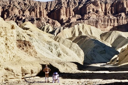 The Golden Canyon where R2D2 got zapped by Jawas, was on the wider side as a road once went through the canyon but was knocked out in 1976 by a rainstorm. I kept looking for the “footprints” of good old R2D2, who had lumbered about but none were to be found in Tatooine Canyon. They were probably scoured by the winds in the passageways in this canyon. The high canyon walls are made up of golden sandstone and red mudstone walls. Waves of reddish brown mudstone appeared as the foreground for the peaks of the Red Cathedral shortly after entering the canyon. What was quite striking during this first hike is the bareness of the hills, mostly devoid of vegetation.