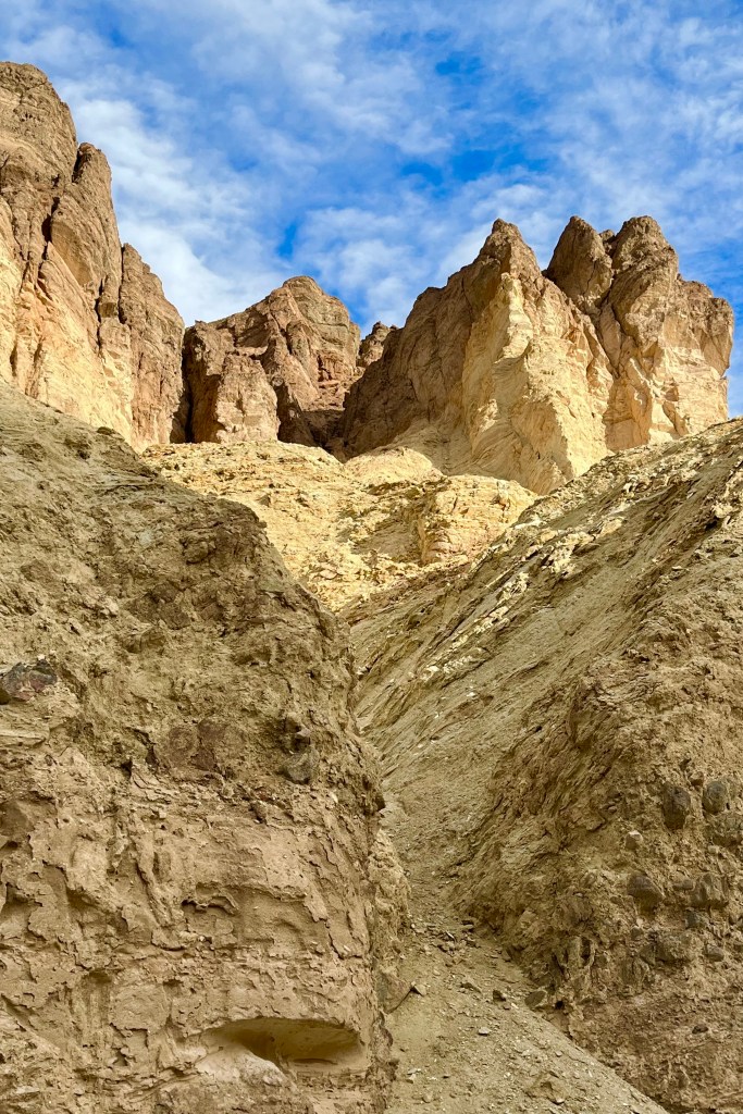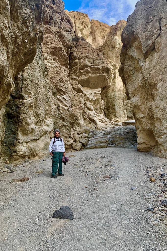 The sunrise was splendid on our first morning, dressing out the mountains in mauves and pinks, and viewed from our hotel balcony. After our Starbuck’s laced brown water, it was time to think HIKE! Read on if you hanker a hike up a huge gold-toned monolith. This might just be the hike for you OR read on because you are loving reading about Tasia’s and my adventures on this DVNP trek. Daughter Tasia was in charge of researching and  choosing the hikes we would include on our Death Valley “itinerary.”  She opted for some of the more popular moderate hikes given that they seemed to match my hiking abilities and are popular for obvious reasons.    Golden Canyon was termed a  must-do-hike by many a visitor to Death Valley National Park.  This mix-and-match set of trails, which initially cuts through the many shades of the brilliant yellow-gold barren eroded land of Gold Canyon, connects to the other trails of  Red Cathedral, Zabriskie Point, and Gower Gulch making this a perfect choice for our first DVNP hiking adventure.   What fit the bill for us was a loop starting at Golden Canyon.  I am a hiker who likes to get the tougher and uphill part of the hike over with first – but I can say this now, though I definitely did not know that when we started out. We proceeded to the Badlands Loop, and returned via Gower Gulch for 5.7 miles.
