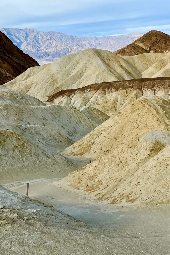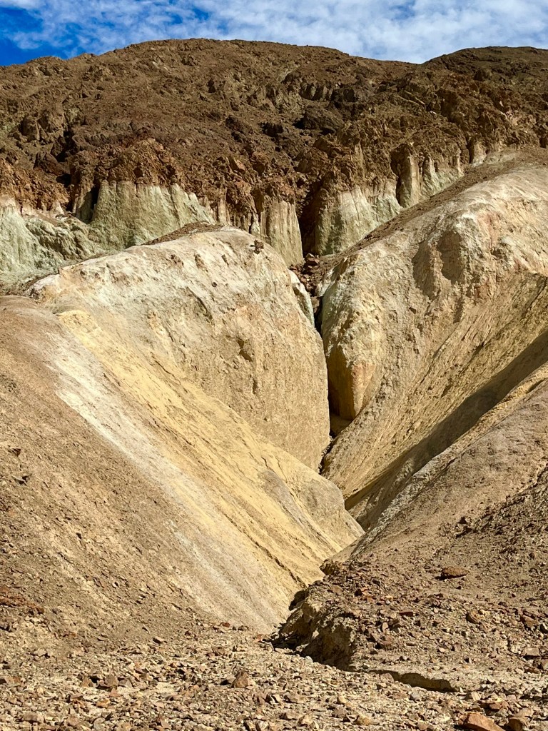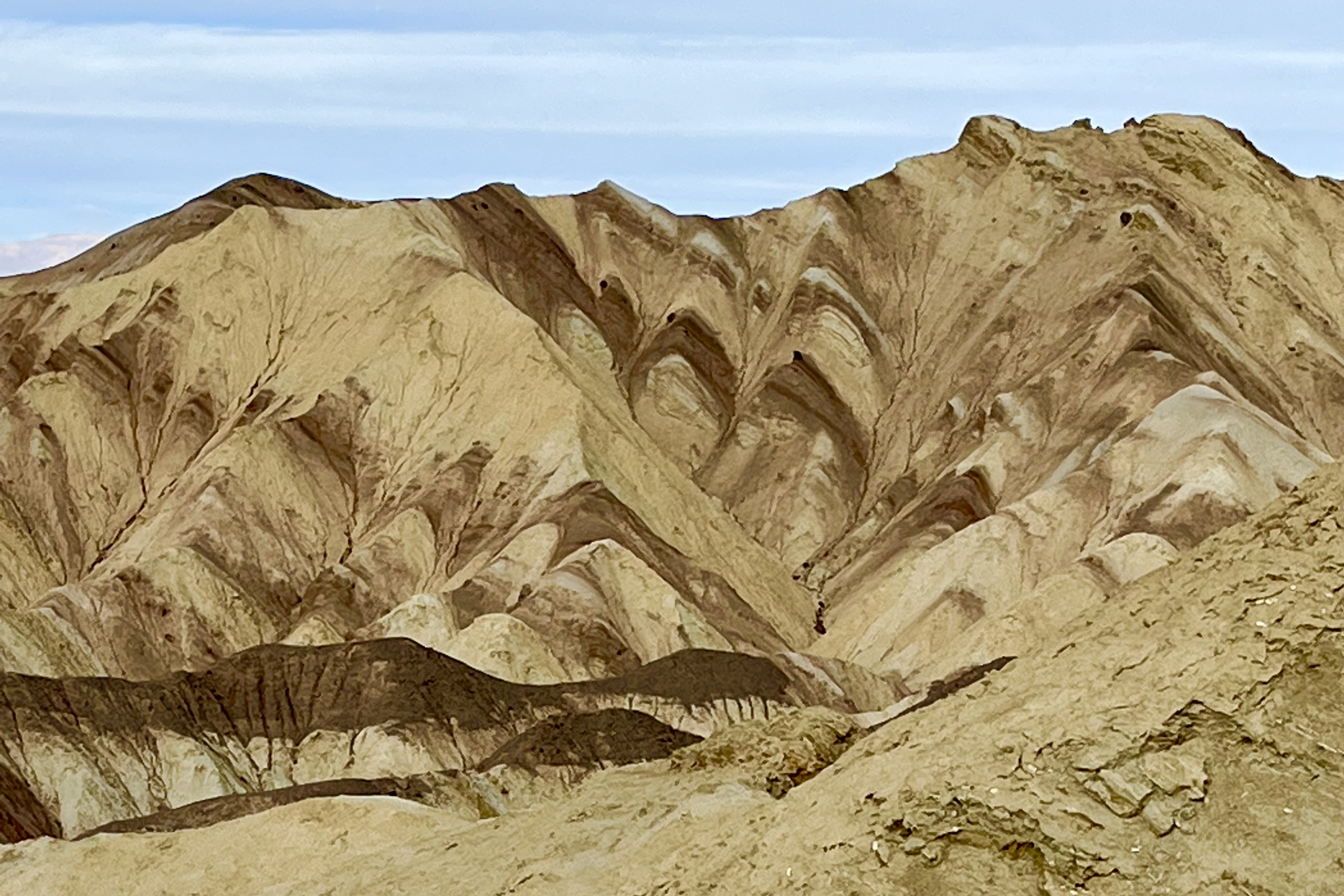 Beyond Manly Beacon, the trail descends mudstone slopes towards Gower Gulch. But first we opted to take the Badlands Loop Trail traversing a myriad of undulating, fluted, grooved, rutted, conical, and domed mudstone hills arrayed in many shades such as goldenrod, wheat, banana, beige, buff, fawn, vanilla, sand, taupe, brown, cinnamon, mandarin, rust…  This area is classic badlands (defined as deeply eroded barren fantastically formed hills ).  It was quite a sweet experience of  complete immersion in a very surreal arid terrain.