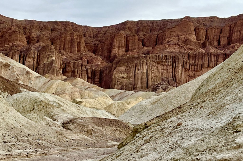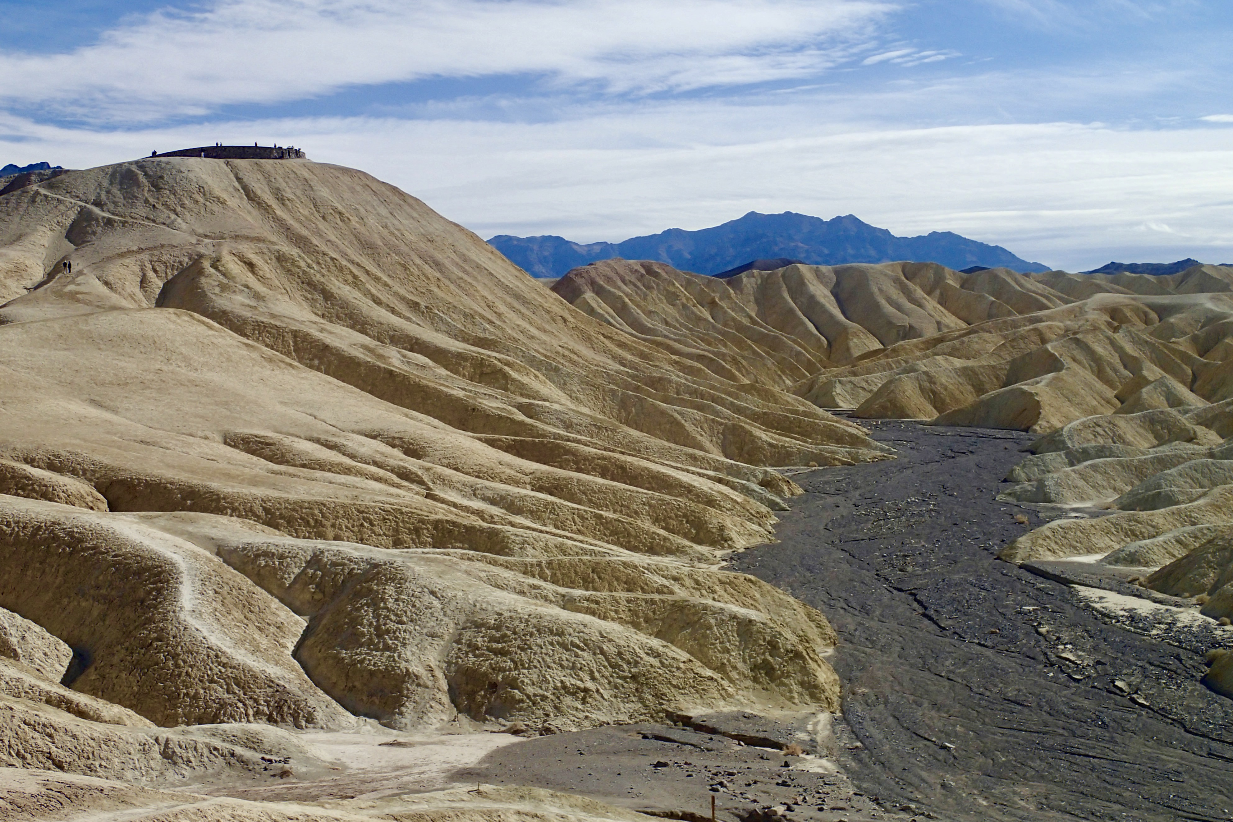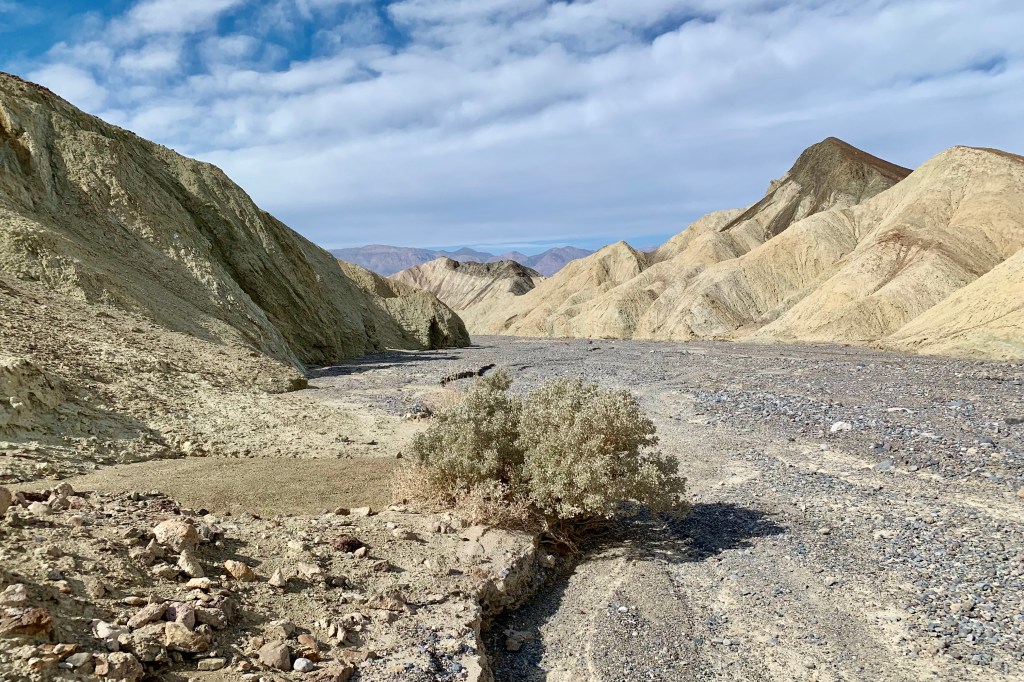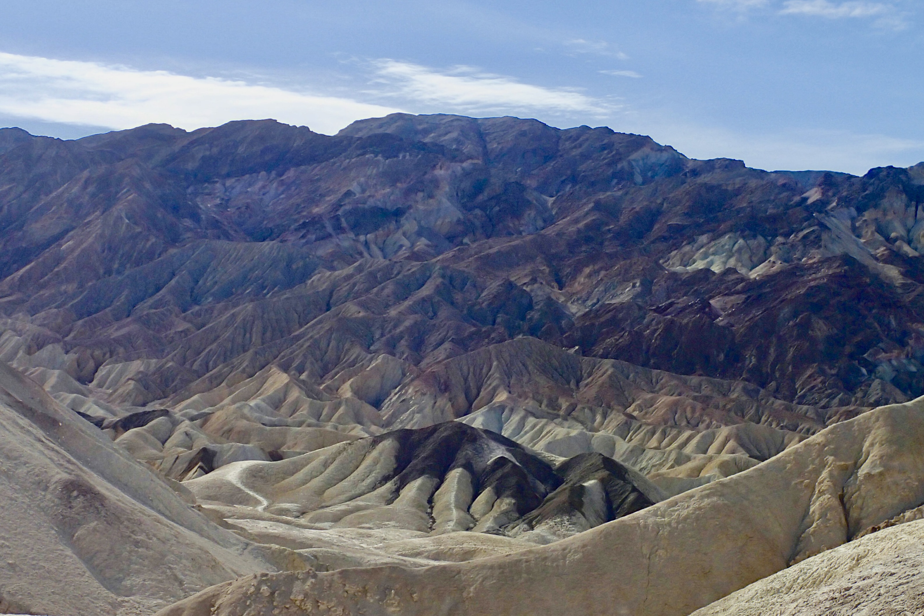 Beyond Manly Beacon, the trail descends mudstone slopes towards Gower Gulch. But first we opted to take the Badlands Loop Trail traversing a myriad of undulating, fluted, grooved, rutted, conical, and domed mudstone hills arrayed in many shades such as goldenrod, wheat, banana, beige, buff, fawn, vanilla, sand, taupe, brown, cinnamon, mandarin, rust…  This area is classic badlands (defined as deeply eroded barren fantastically formed hills ).  It was quite a sweet experience of  complete immersion in a very surreal arid terrain.