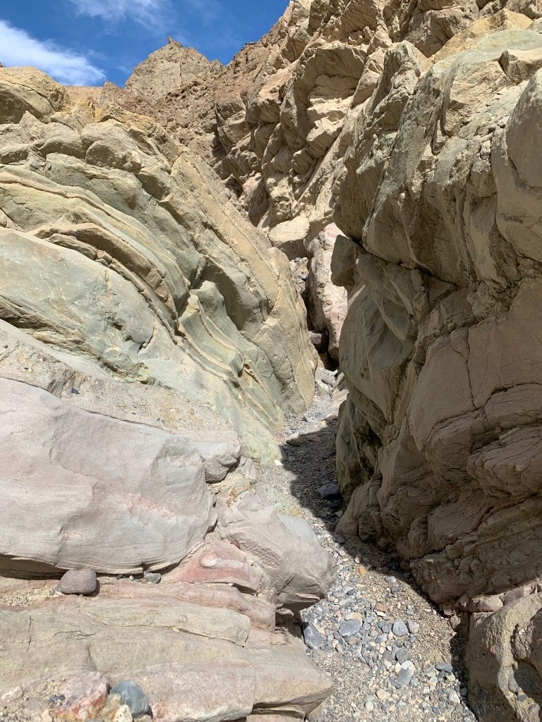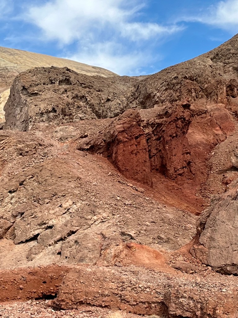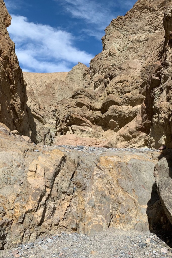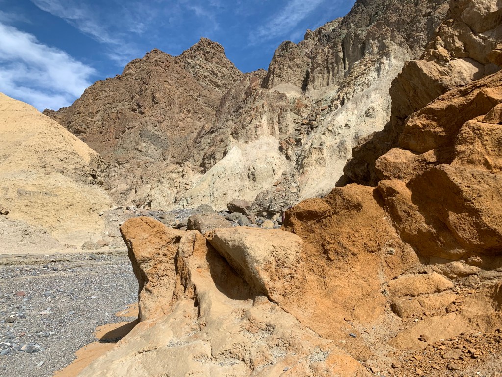 The Badlands Loop eventually descended into Gower Gulch, a wide loose gravel filled wash which had no defined trail and we basically enjoyed wandering down the steady downhill and eventually out of the mountains. I was awed by the array of color from oxidized volcanic mineral deposits in the sediments on the walls of Gower Gulch .  The wash passes several Borax (called the “white gold “ of miners) mines.