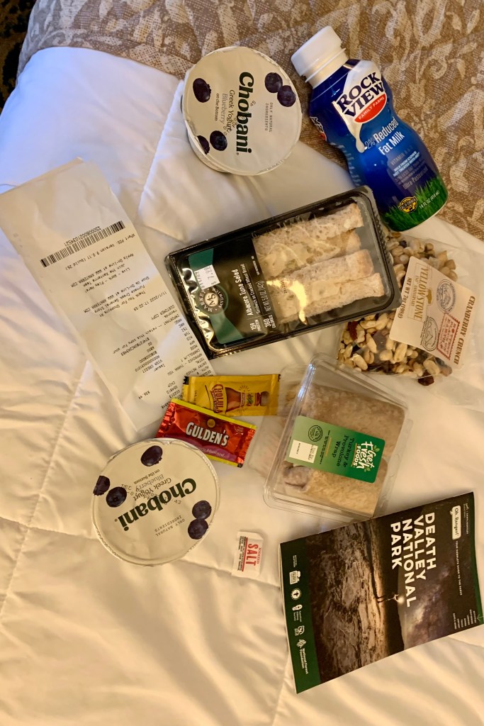 The last two options were The Ice Cream Parlor or buying something at the General Store.  Now I could go for ice-cream but really!!!  @ $7.00 for a single scoop. They did have what I consider a kids menu (hamburgers, hot dogs, grilled cheese) at the adult prices of $18.00-$22.00.  All hail to the winner: the General Store. It’s not that I can’t afford these restaurant meals.  But, I prefer not to be held hostage by closed roads and the relative remoteness of the park (which I could avoid by choosing  perhaps a long drive out of the park and back up to Beatty). With the price of gas, I could drop the $75.00 on a rib eye steak and save time and energy.  BUT mostly I prefer not to be at the mercy of the wealthy billionaire owner of Xanterra that operates  the Death Valley Hotels and restaurant concessions .  So it was  a cold meal as one of those tiny motel microwaves are NOT provided in the rooms. So $36.00 bought us 2 yogurts, two sandwiches, a bag of cranberry crunch for our dinner and breakfast and pint of milk for morning coffee   I have learned that if you lace the coffee colored water coming out of the motel pots with a half packet of Starbuck’s via, you get a pretty decent cup of coffee.