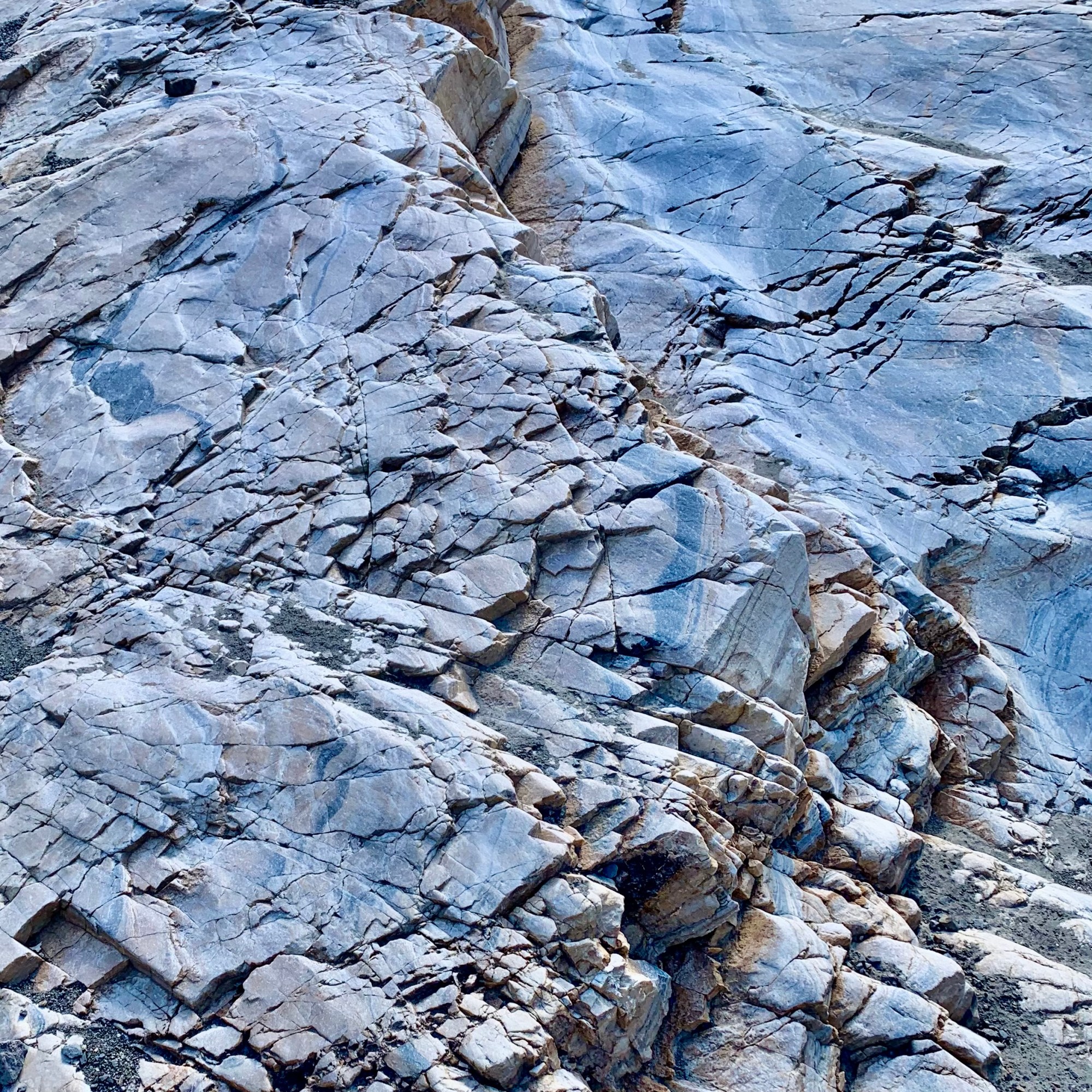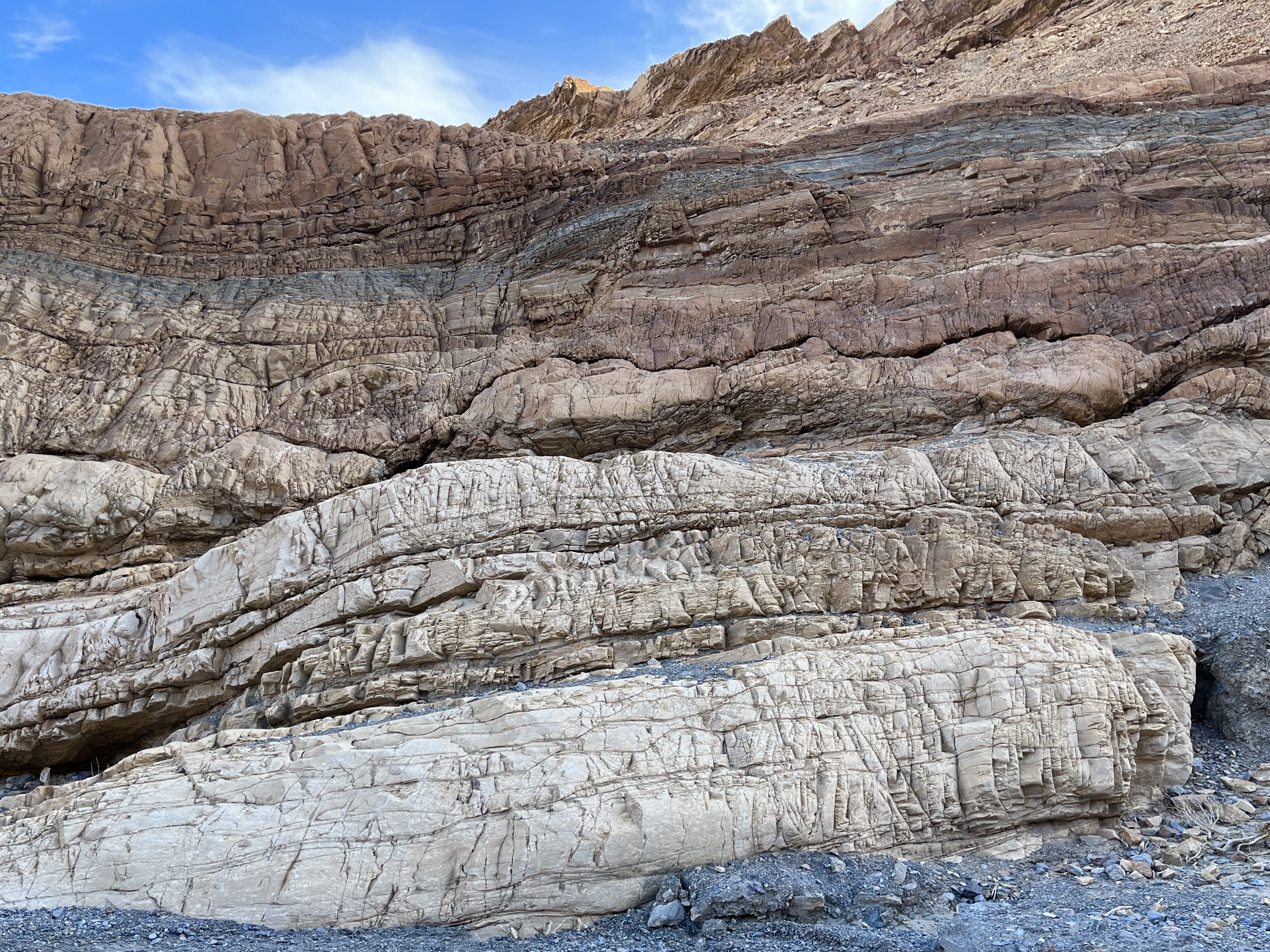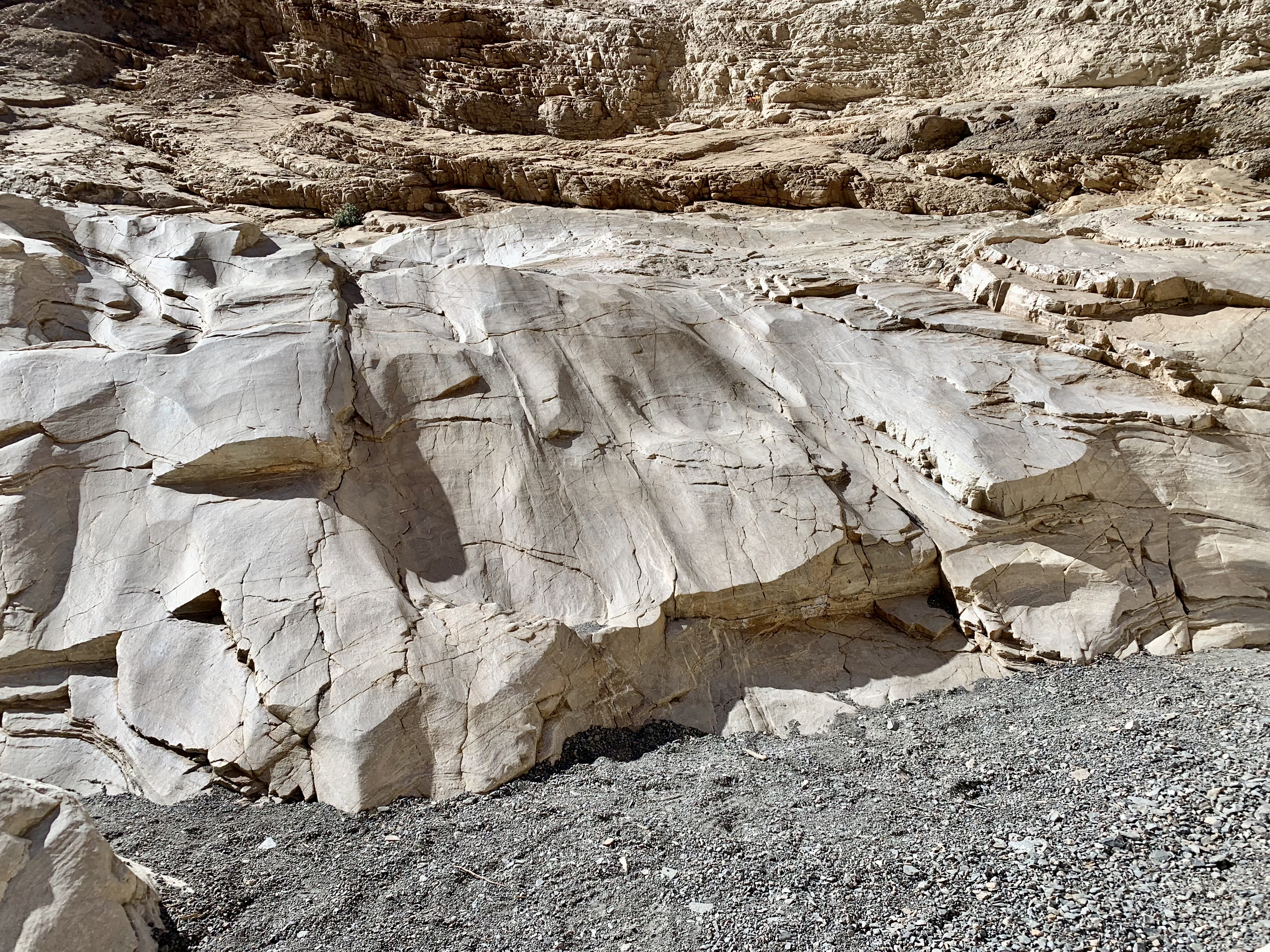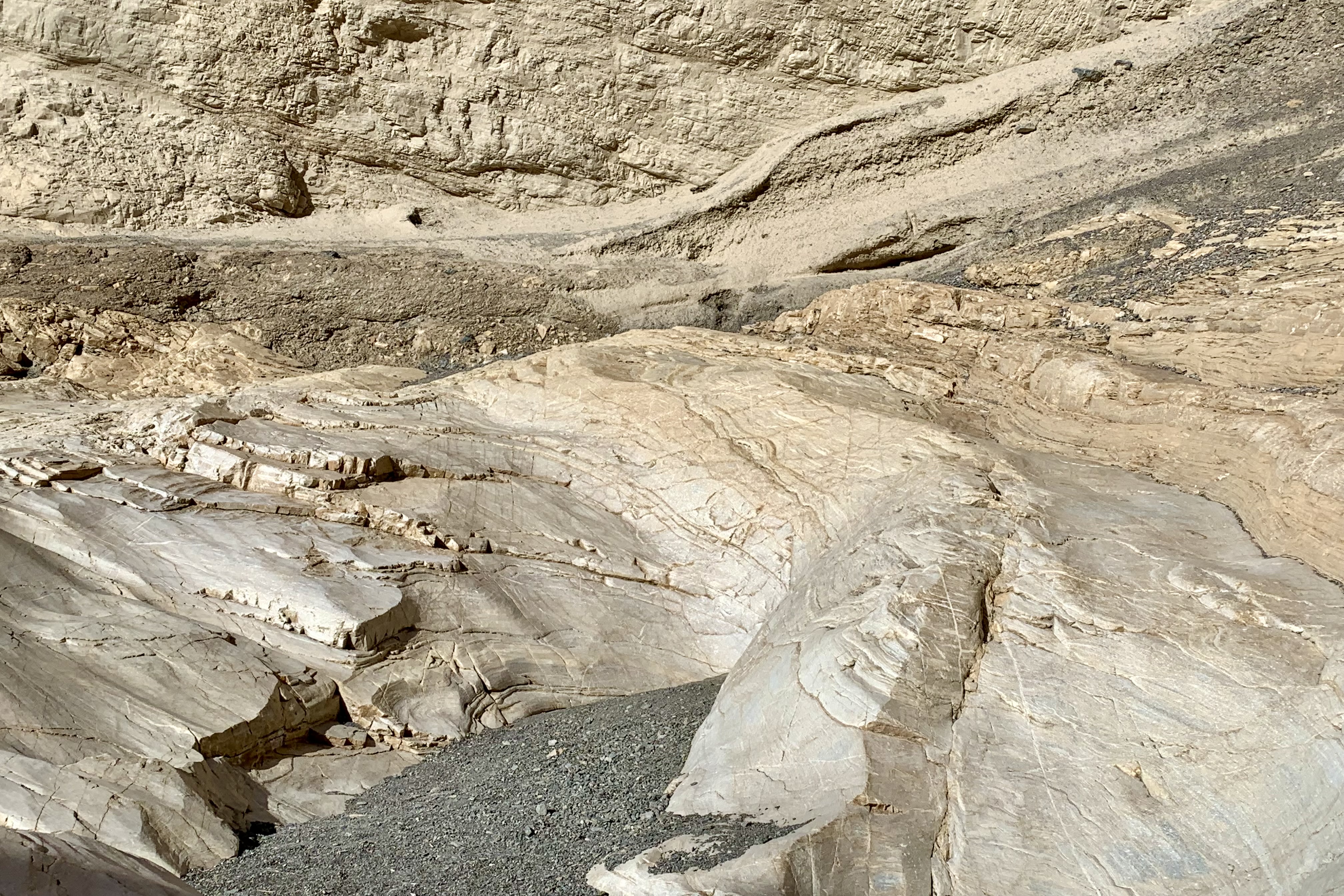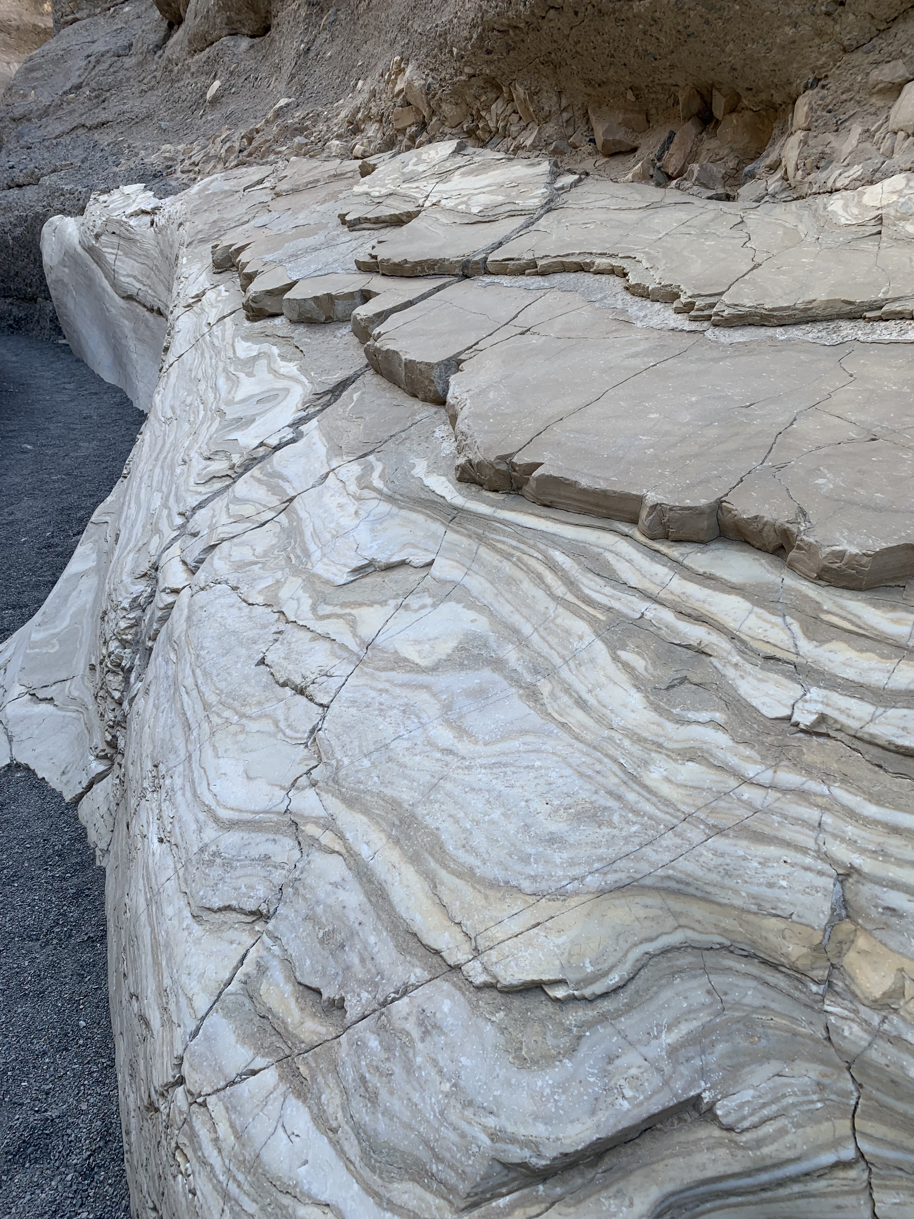 Keeping with the theme of “art” (as in Artist’s Drive and Artist’s Palette of the day before), we opted to hike the Mosaic Canyon Trail. The surrounds on this hike are quite stunning. Mosaic Canyon “Breccia” (the Italian word meaning “fragments”) are rock formations in which tiny broken shards, the jagged offspring of an assortment of parent rocks, have been imbedded in the canyon walls and floor over the eons and this amalgamation has been fused by nature’s superglue. The mosaic conglomerates and smooth marbleized rocks are quite the spectacular duo and yet another example of the geological variability and complexity of Death Valley National Park (DVNP).
