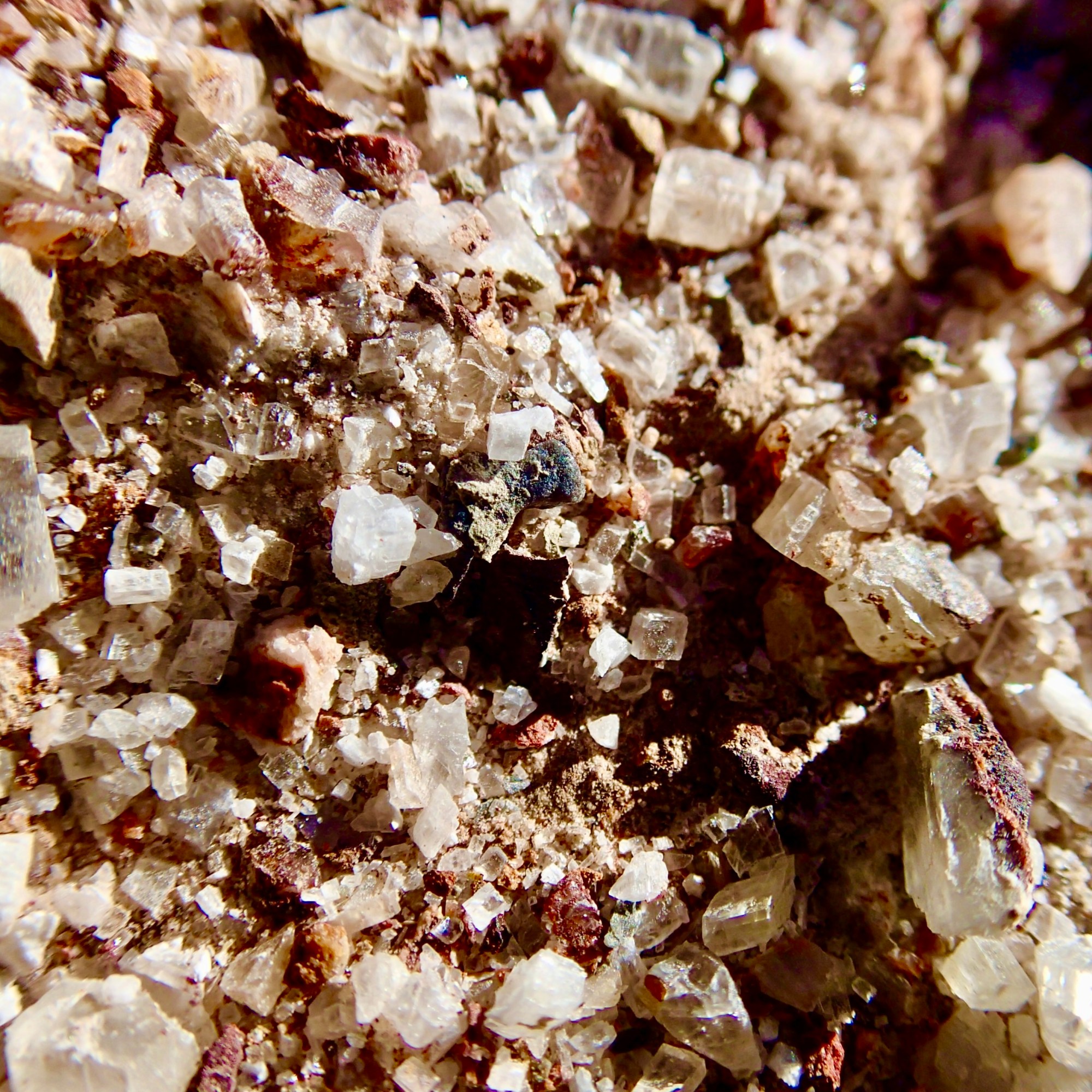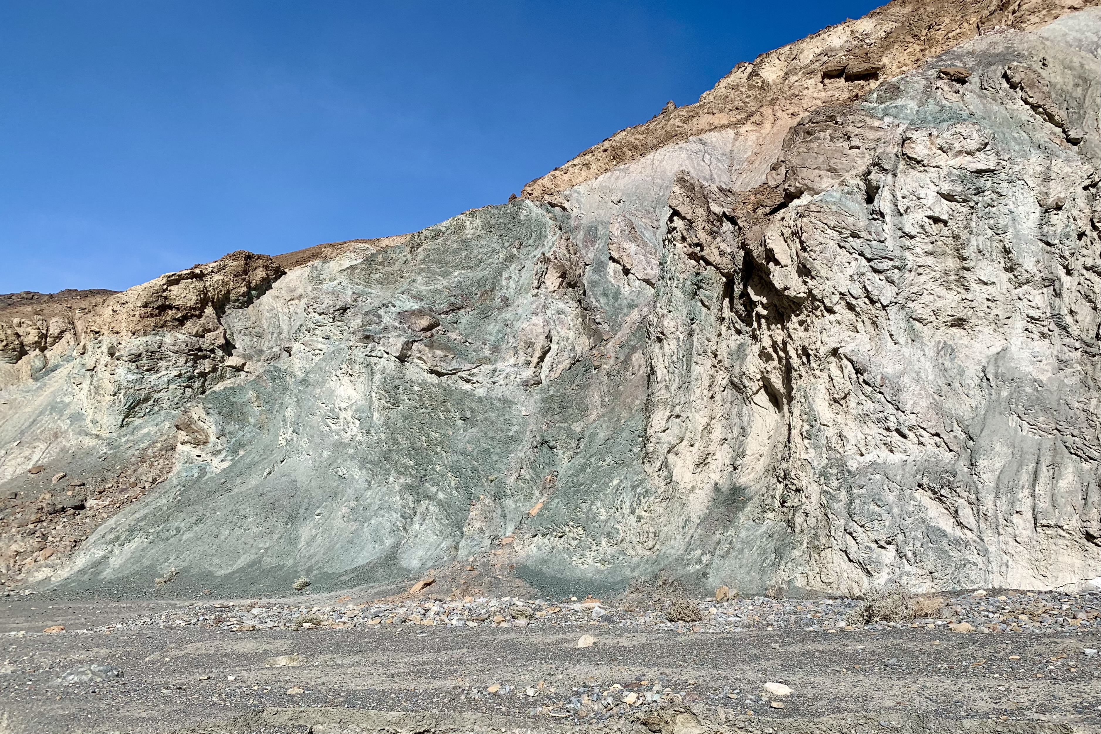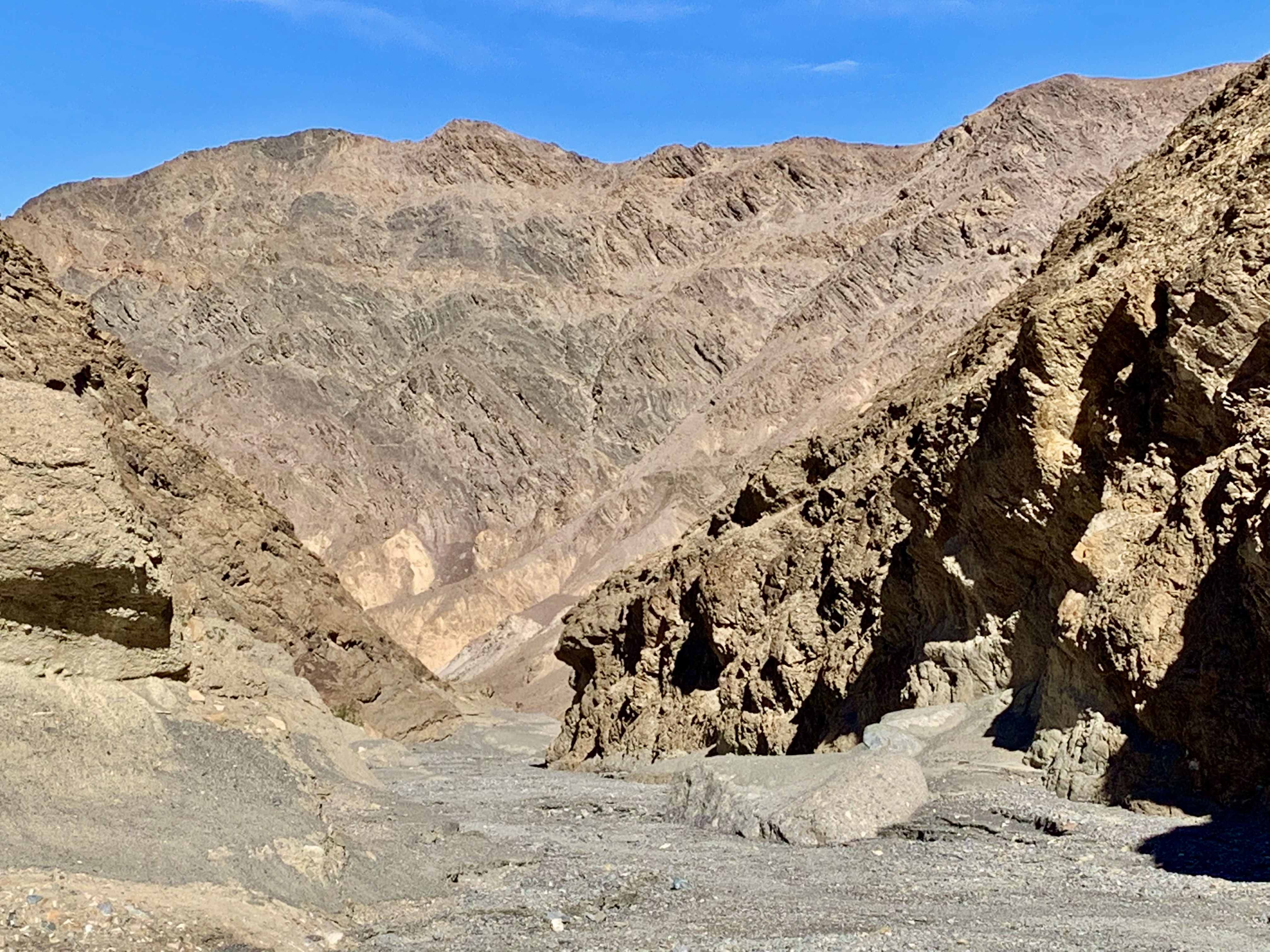 Soon the canyon opened into a large wash marking the end of the lower canyon and a very gradual uphill followed as we wound our way through a massive gravelly wash with a butte rising in the middle of it. As there was no specific defined trail, we gravitated towards the edges and walls viewing many of the rock formations at close range. These formations were beauteous…many of deeply rich color, streaked, opalescent, crystalline conglomerates. Eventually the massive wash narrowed again until we reached a boulder jam at approximately 1.3 mi into the canyon. This jam marked the end of the hike for me (and many other trekkers) as hiking further up canyon involved significant scrambling to get beyond the jam. The return trip was equally enjoyable marveling at the geology of the area, rambling between towering, sun-splashed walls.