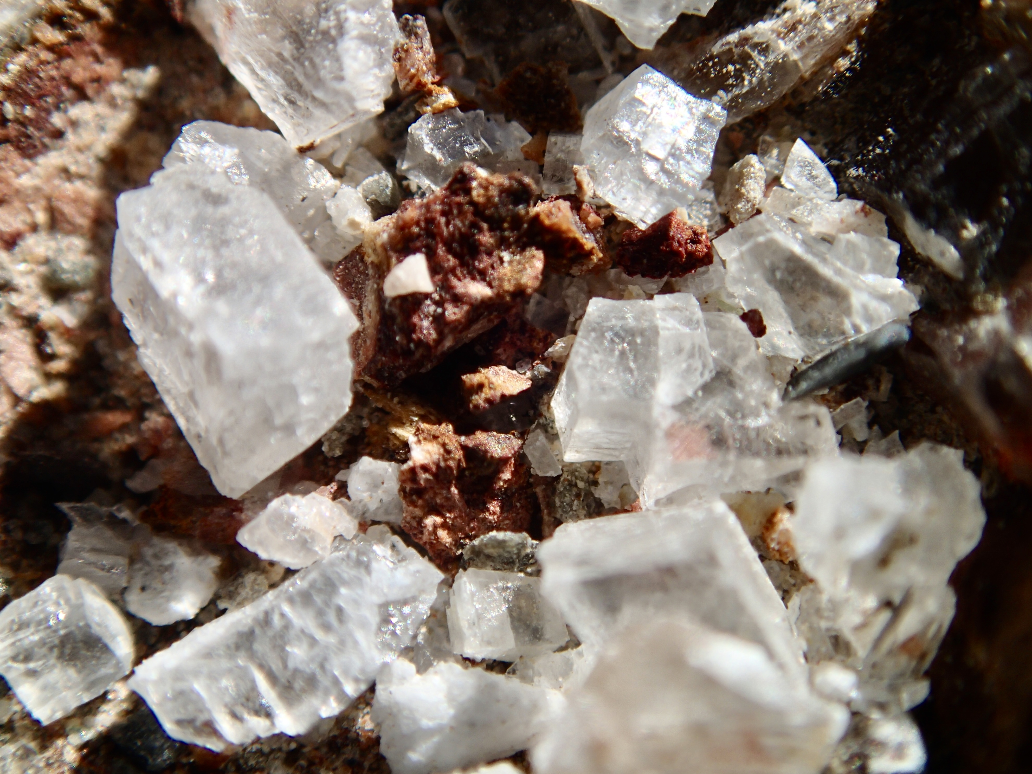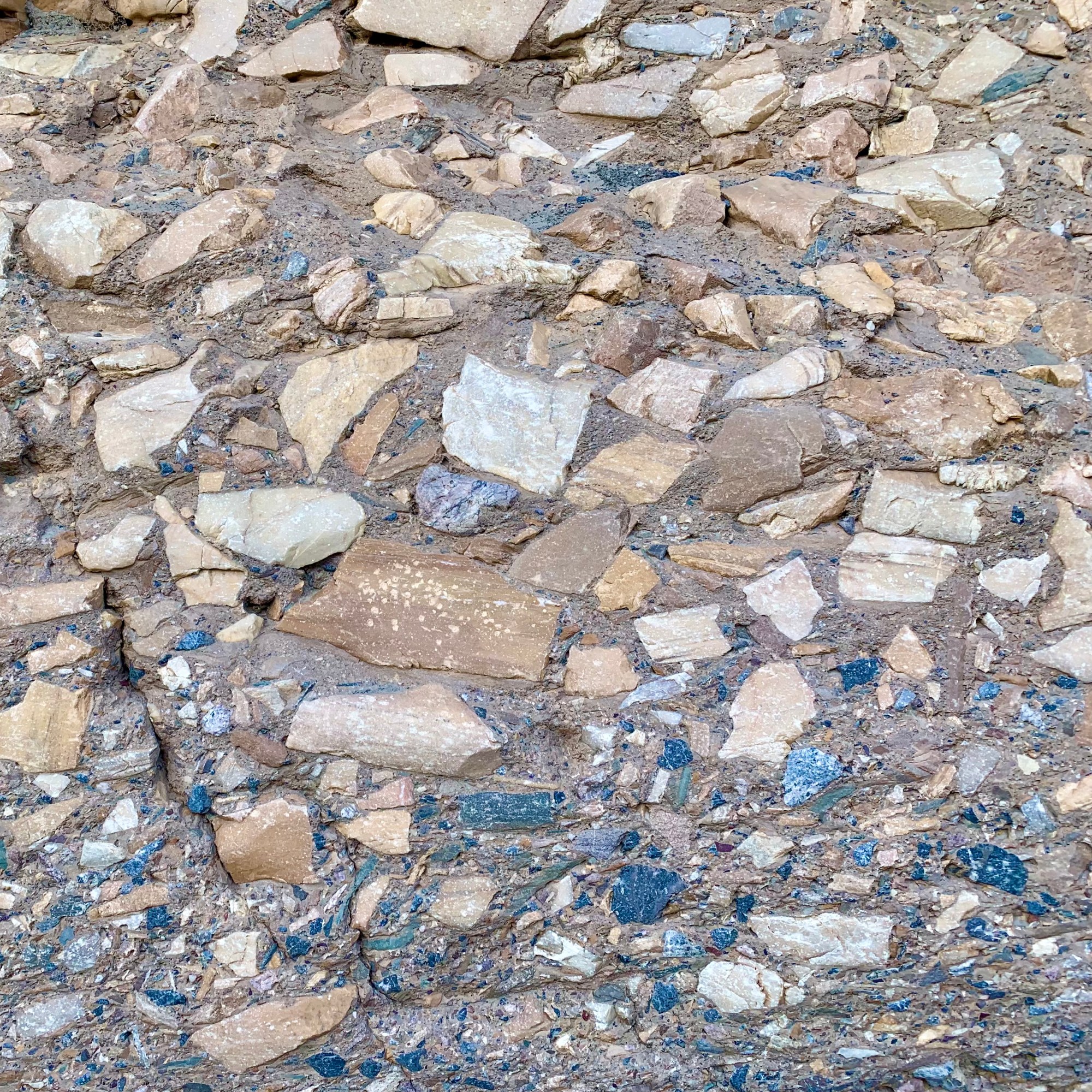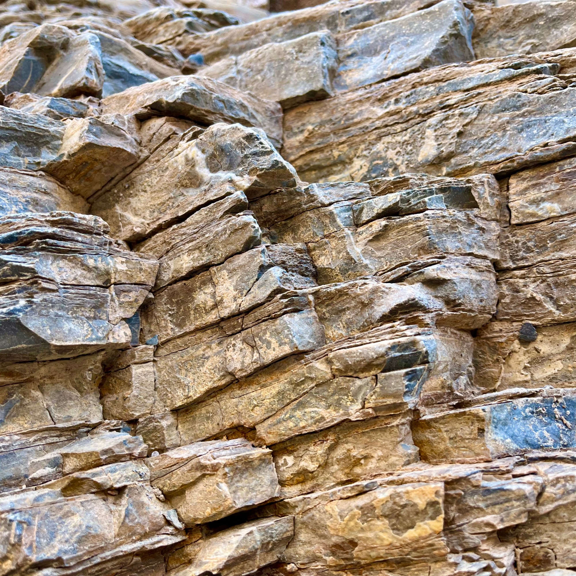 Soon the canyon opened into a large wash marking the end of the lower canyon and a very gradual uphill followed as we wound our way through a massive gravelly wash with a butte rising in the middle of it. As there was no specific defined trail, we gravitated towards the edges and walls viewing many of the rock formations at close range. These formations were beauteous…many of deeply rich color, streaked, opalescent, crystalline conglomerates. Eventually the massive wash narrowed again until we reached a boulder jam at approximately 1.3 mi into the canyon. This jam marked the end of the hike for me (and many other trekkers) as hiking further up canyon involved significant scrambling to get beyond the jam. The return trip was equally enjoyable marveling at the geology of the area, rambling between towering, sun-splashed walls.