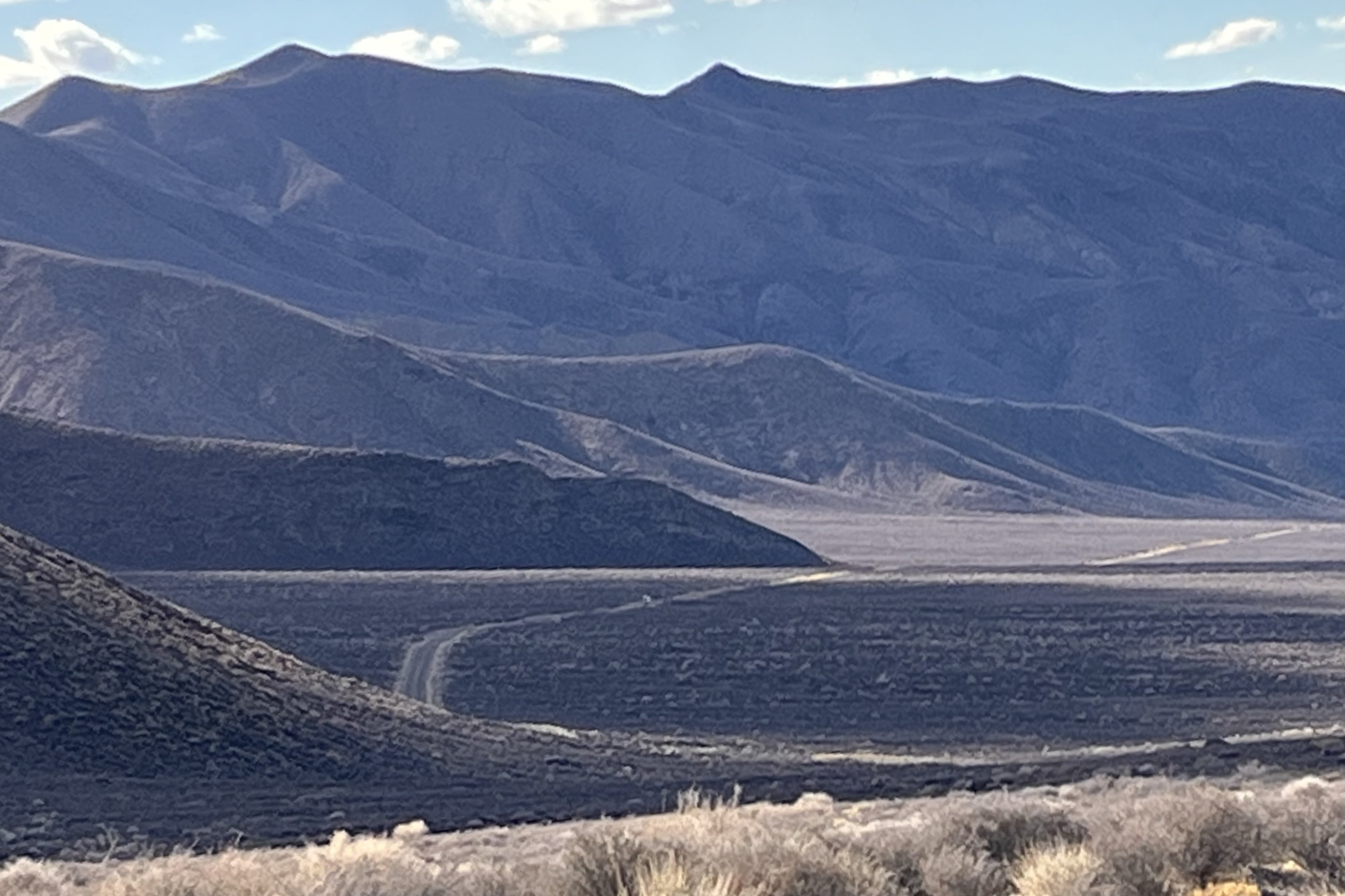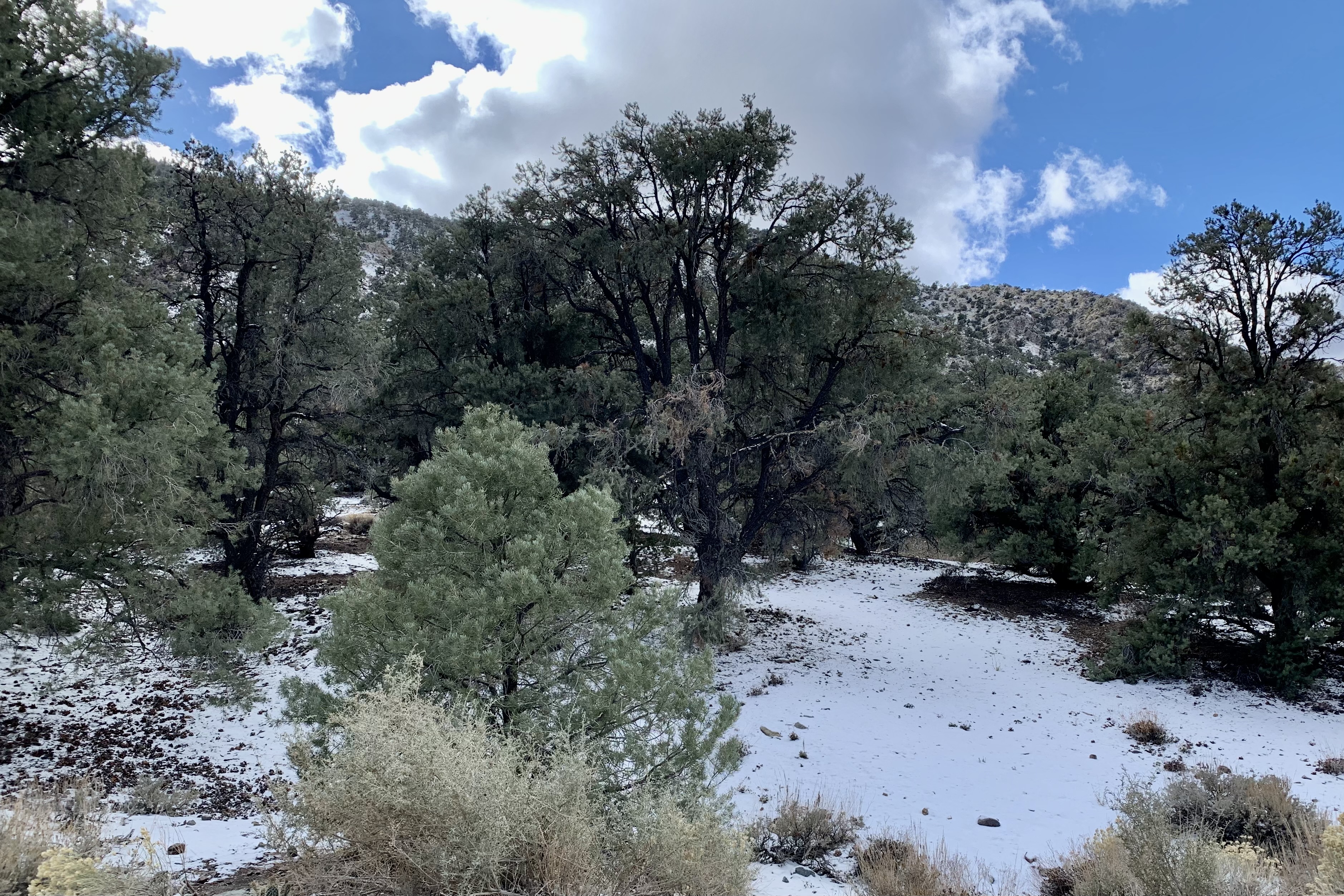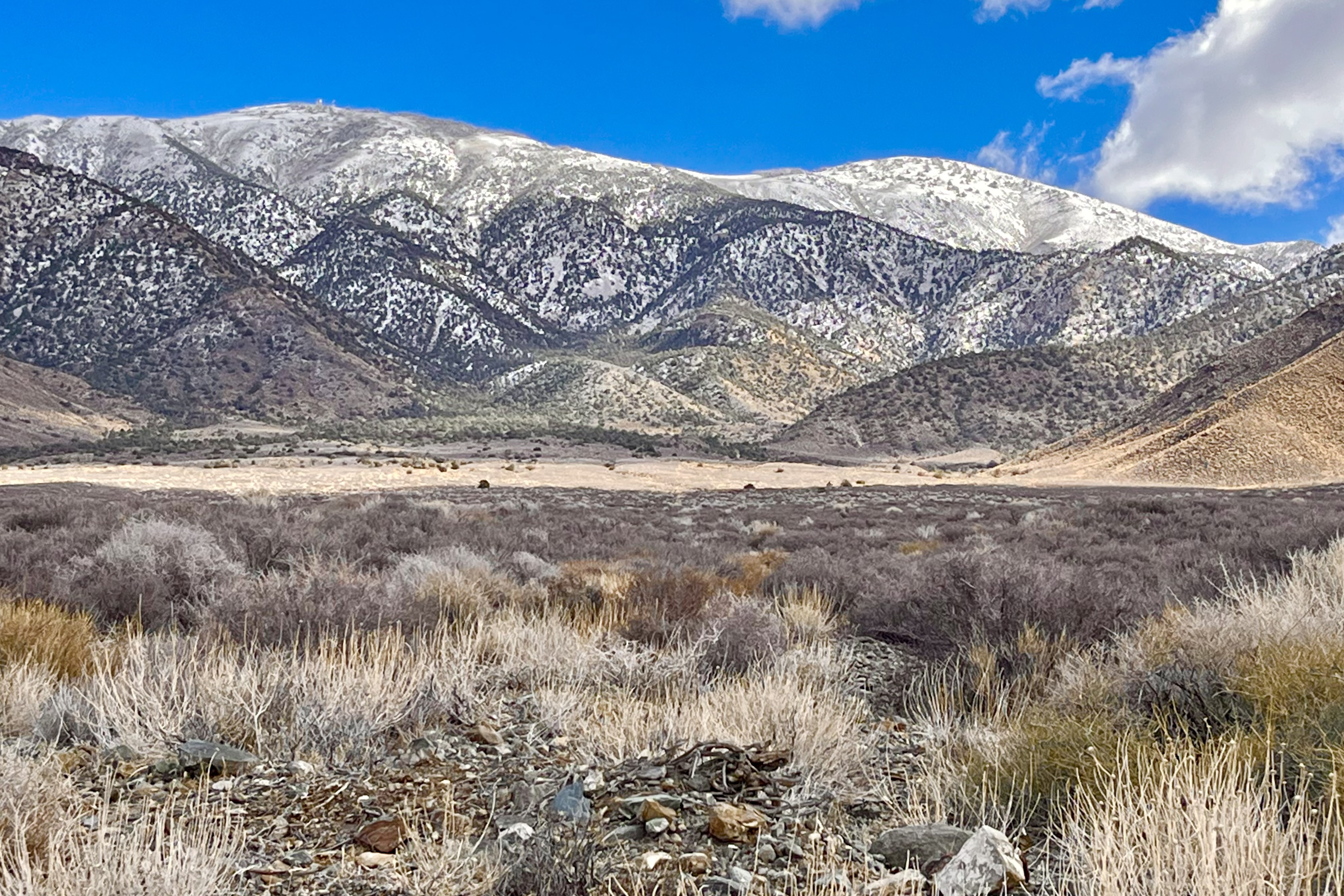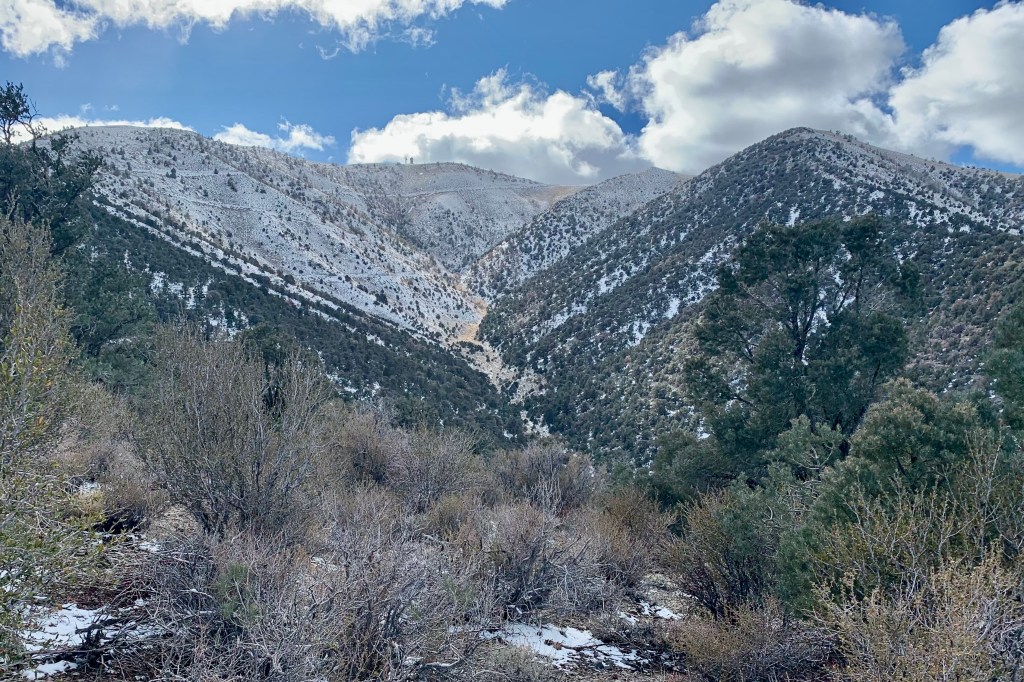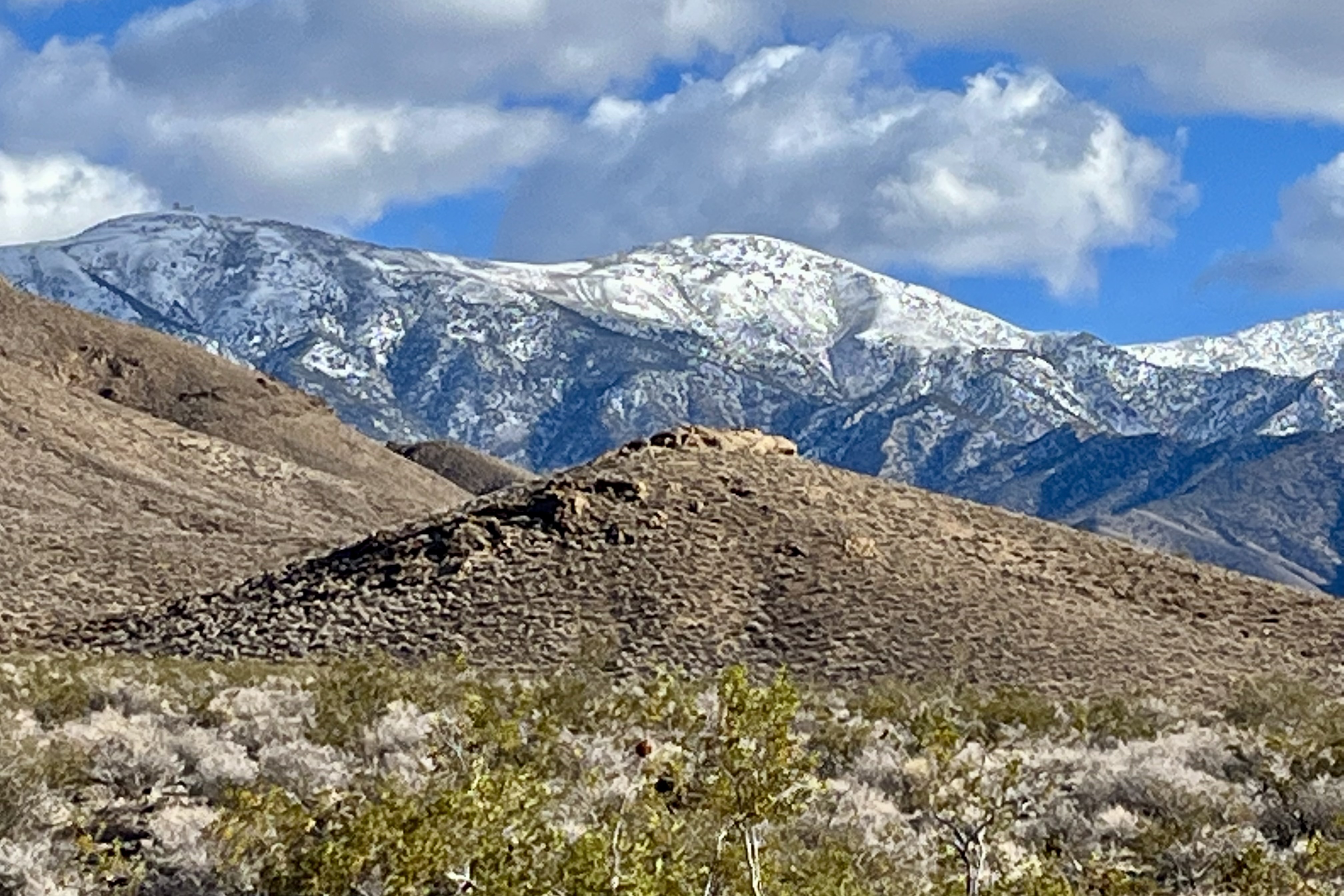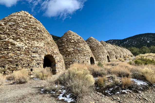 We did not anticipate that our next adventure would be quite the change of pace going from the desert canyon warmth to snow on the mountains. Leaving Mosaic Canyon, we stopped in Stovepipe Wells before heading up to the Charcoal Kilns. A delightful discovery was that the General Store there had much better merchandise than at the Furnace Creek General Store. So I decided to be generous with myself and get a hoodie and a T. Now the downside was that this purchase set off a potential fraud alert by my bank and when I tried to purchase gas later the card was refused. Normally this would not be a big deal but we were in an area where there is no cell service so to get it removed and be able to get gas. Same thing happened to Tasia’s card as she was also generous earlier with herself. So we had to find a wi-fi connection. That is one kind of adventure I could do without. The shop keeper did share that it happens quite frequently there!
