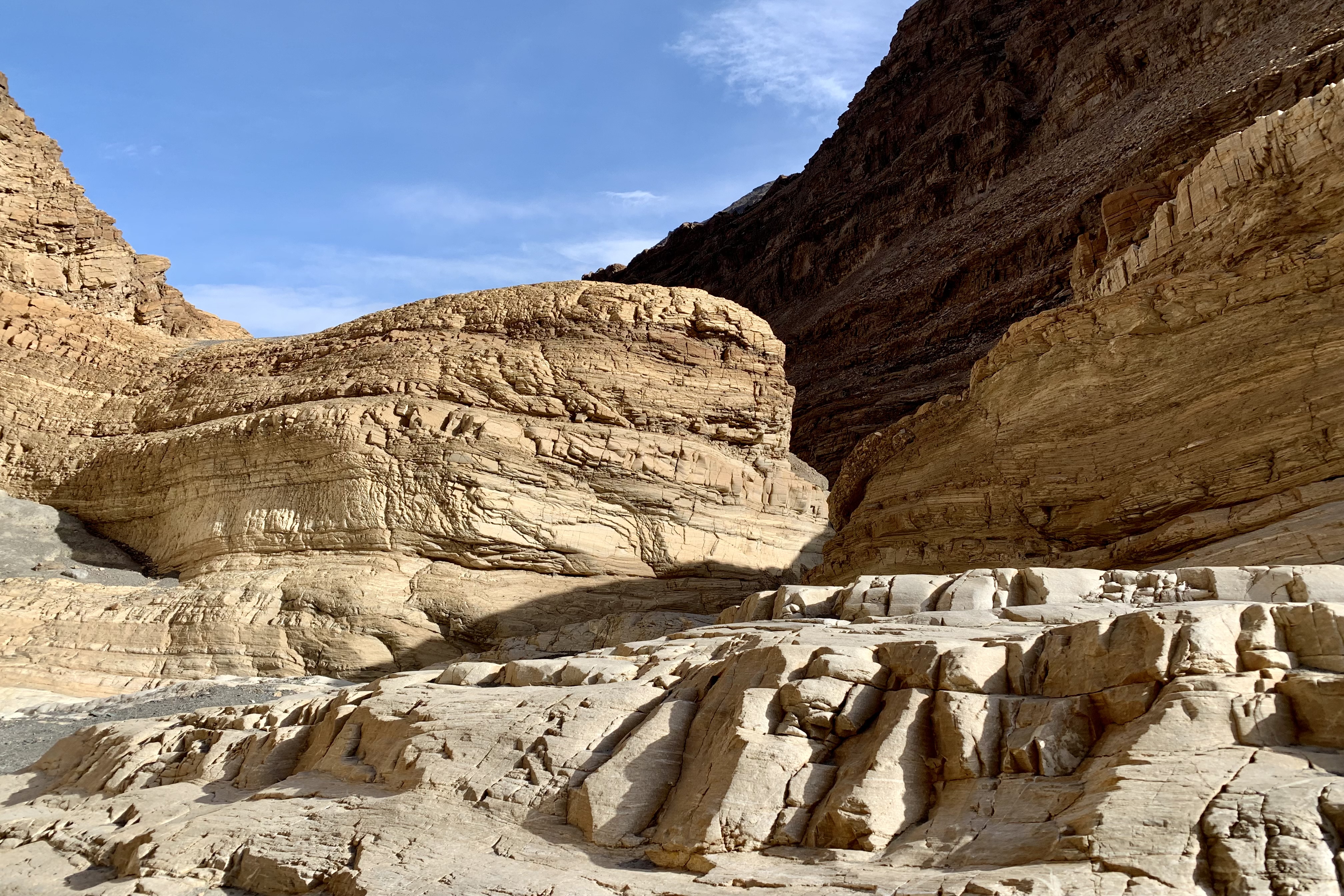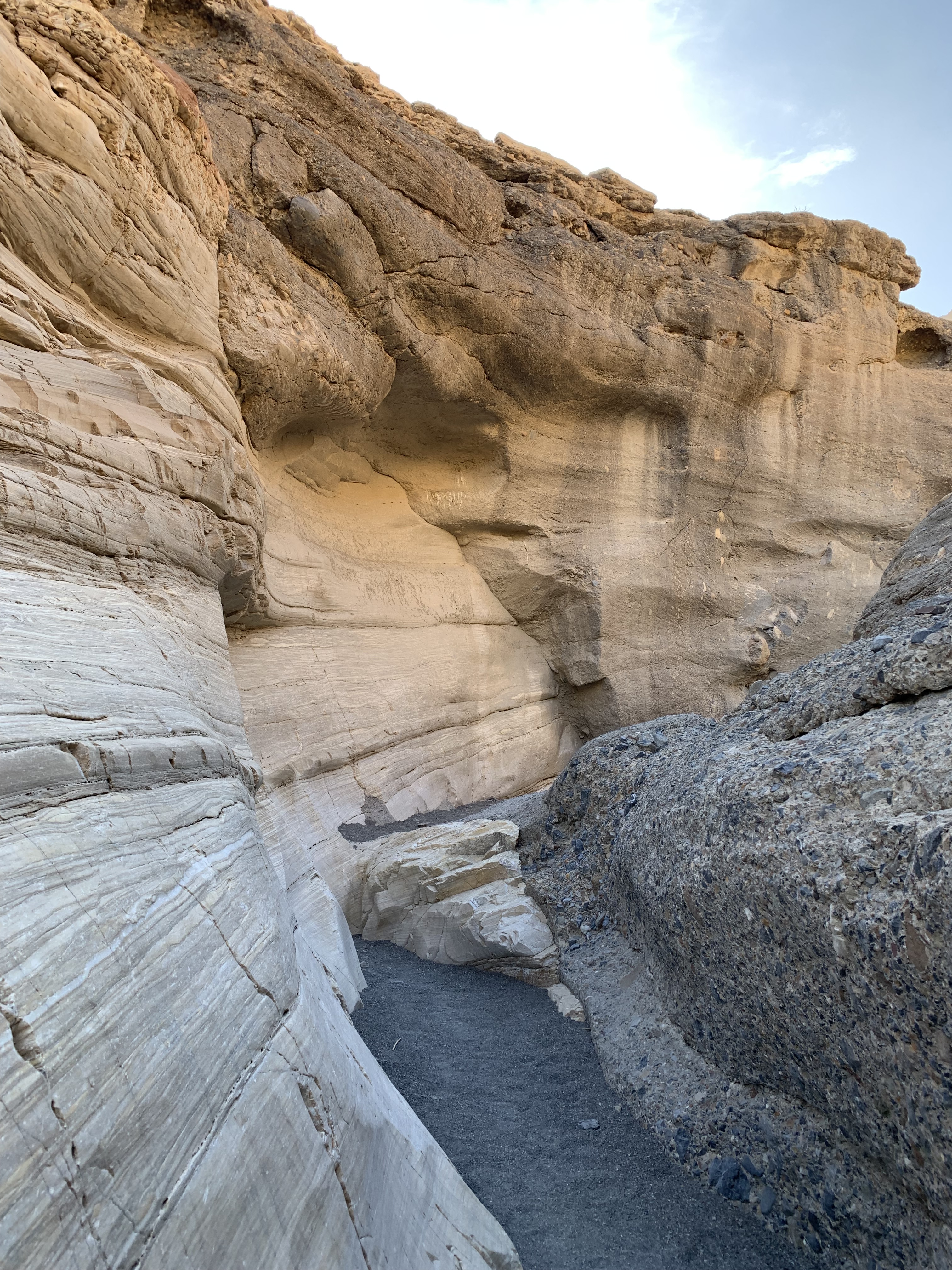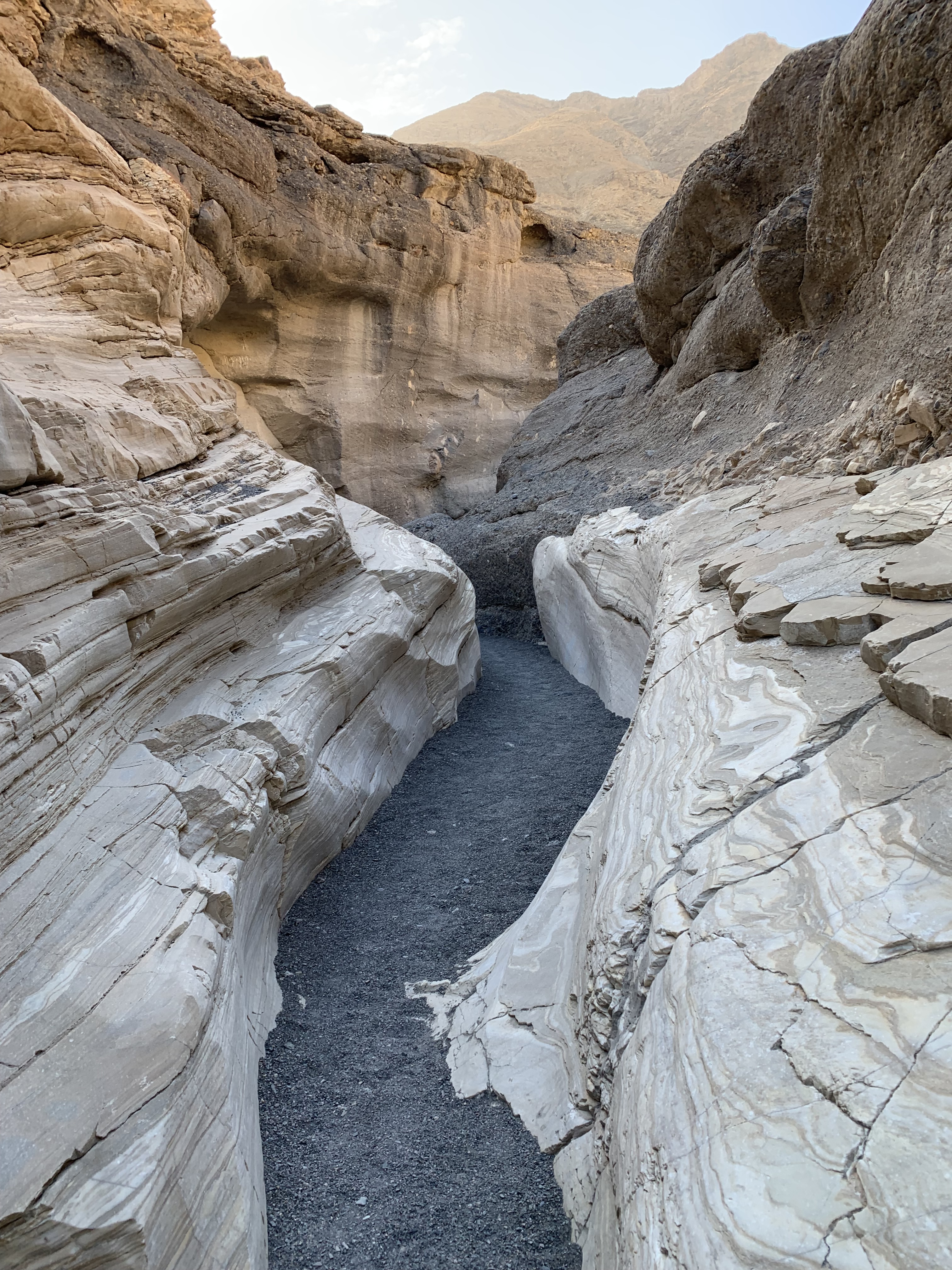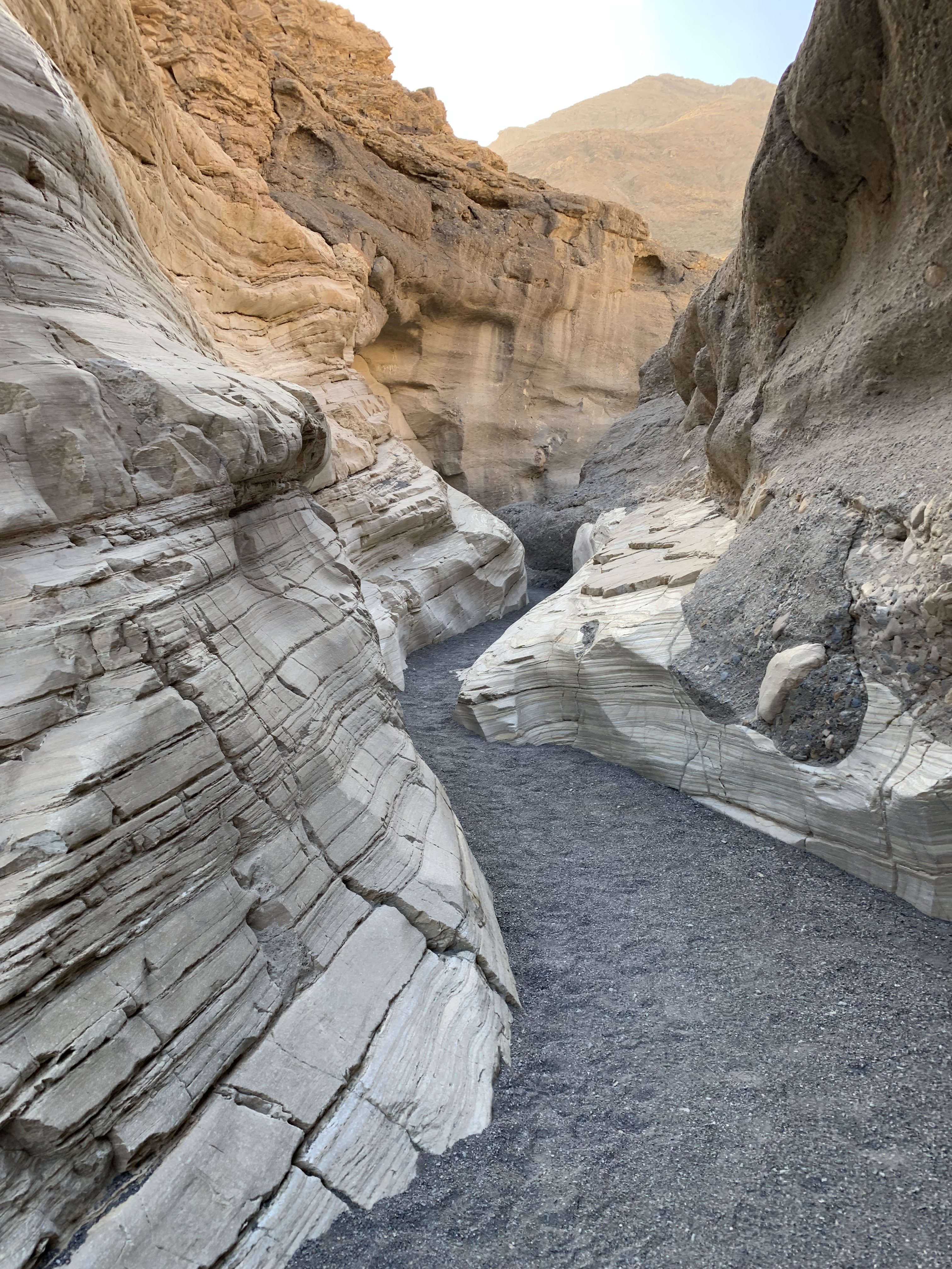 After driving through a “blinding” dust storm getting to the trailhead, this hike did not disappoint. This trail should never be about a race to the finish, an out-and-back, but be enjoyed and appreciated for the beauty that surrounds and the geological museum that it is. First, the artful striations and variegated veins in the rock and the variety of geometrics, textures, and multitude of colors are evidence early upon approaching the canyon and will delight an observant wanderer. Secondly, once you enter the canyon the marble walls of Noonday Dolomite, at points, make for an accordion like passageway, having been expanded and contracted by the force of erosion. This resulted in a narrowing and widening of the canyon walls and a slick rock experience for you to enjoy and is another example of Mother natures incredible handiwork.