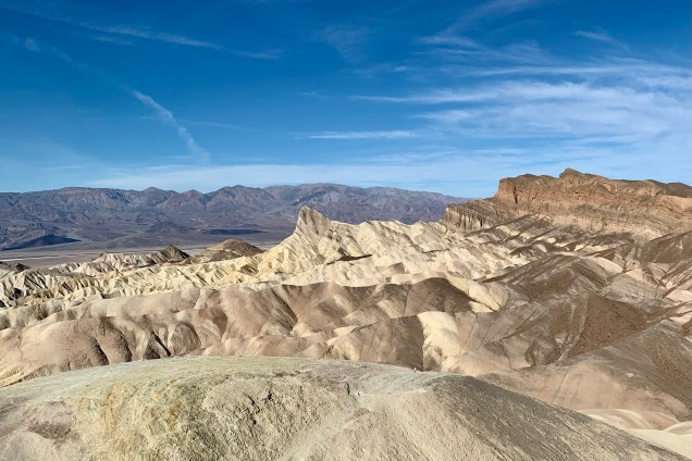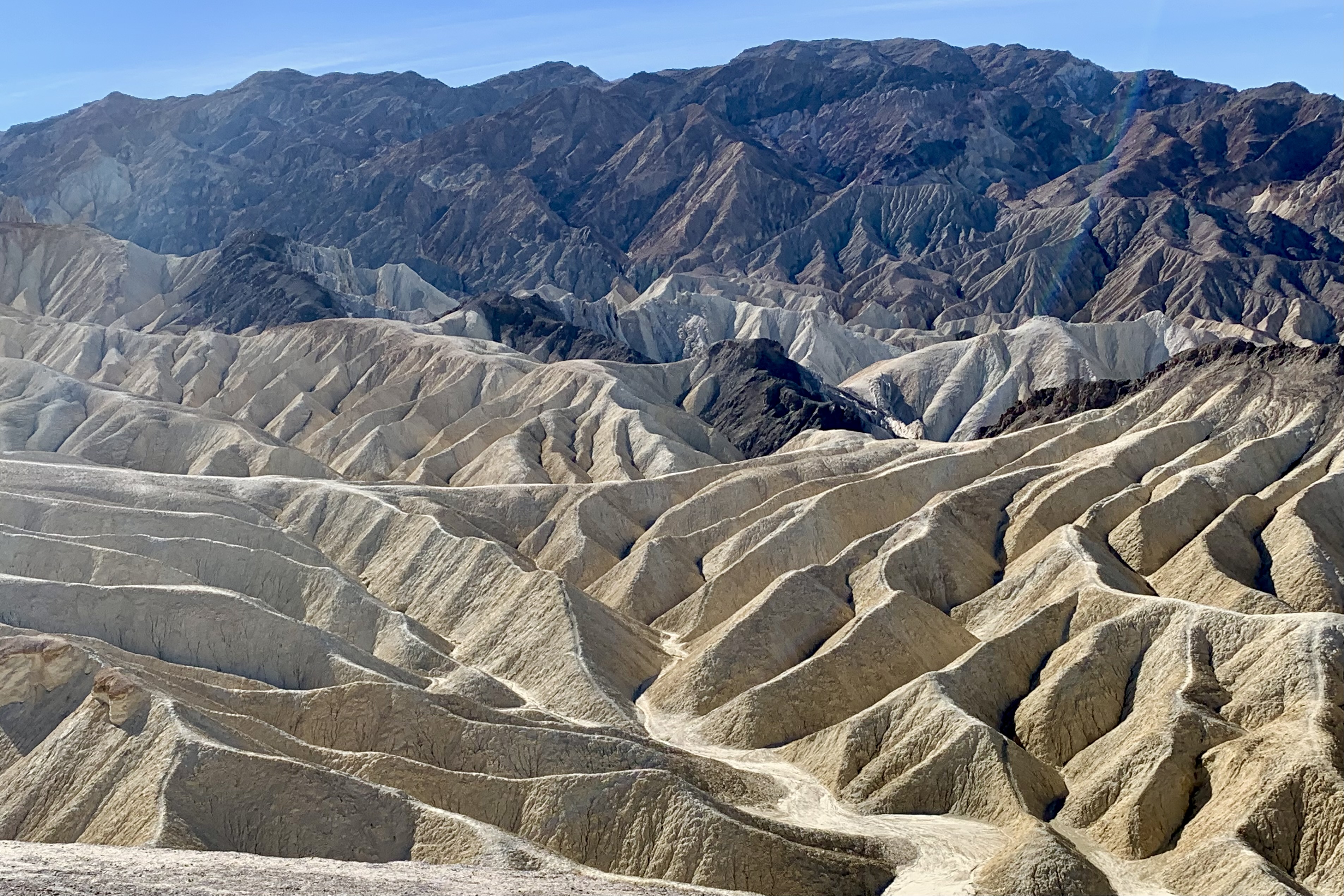 We skipped Zabriskie point at the outset of the trip (saw a very crowed parking lot) but chose it as our farewell stop on our Death valley tour. Probably the most iconic photo shoot spot in Death Valley is from the landing at Zabriskie Point. At 710 feet elevation it provides an elevated vista which affords breathtaking views to gaze, gape, be amazed, wonder, marvel, and be awed by the splendor of the yellow sand brown hills of the badlands below and beyond the salt flats covering the floor of Death Valley. The most prominent feature on this landscape, viewed from Zabriskie Point, is Manly Beacon. This view is so filed with the rich colorful shades of toffee, wheat, honey, caramel , butter, chocolate, almond, baked potato, dijon mustard, baked bread , bitter chocolate, ginger ale, maple syrup, coffee, brown sugar, brownie, cocoa, mocha … Perhaps you think I am in a grocery store as I am describing the vista or even that I am incredibly hungry as I write, so I will spare you any more food images, but hopefully I have aptly described some of the hundreds of shades of rich colors of these eroded hills! They are absolutely gorgeous! The dark, colorful mountains of the Amargosa Range contrast with the hills of the golden badlands below and Manly Beacon; with the cliffs of Red Cathedral; and, with the white mirage-like salt flats beyond.