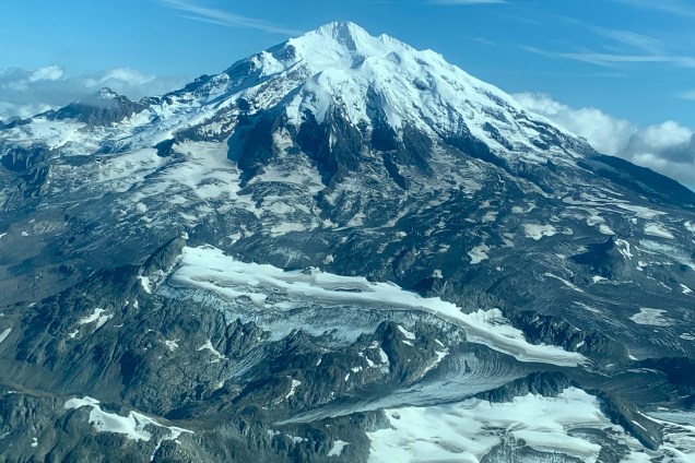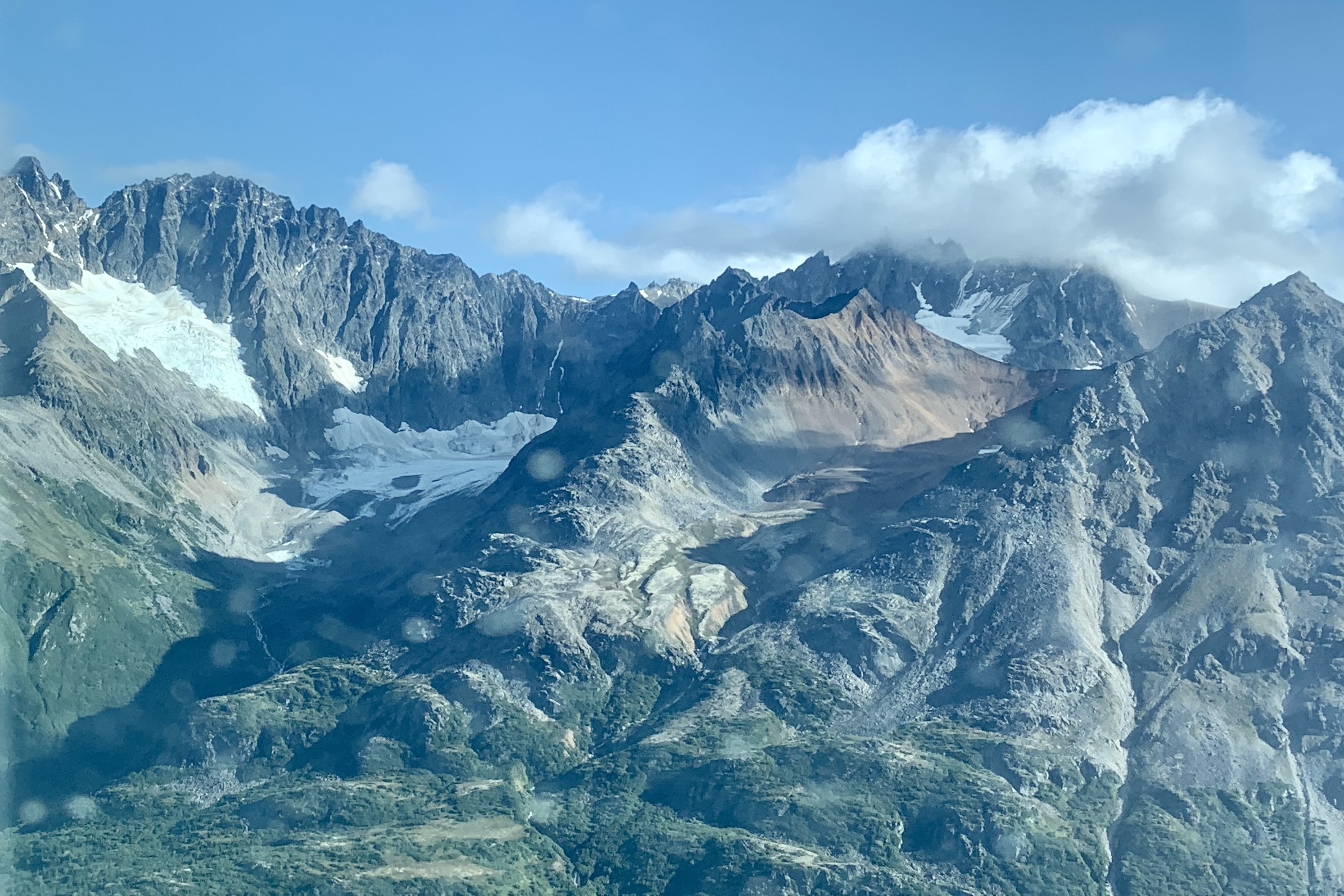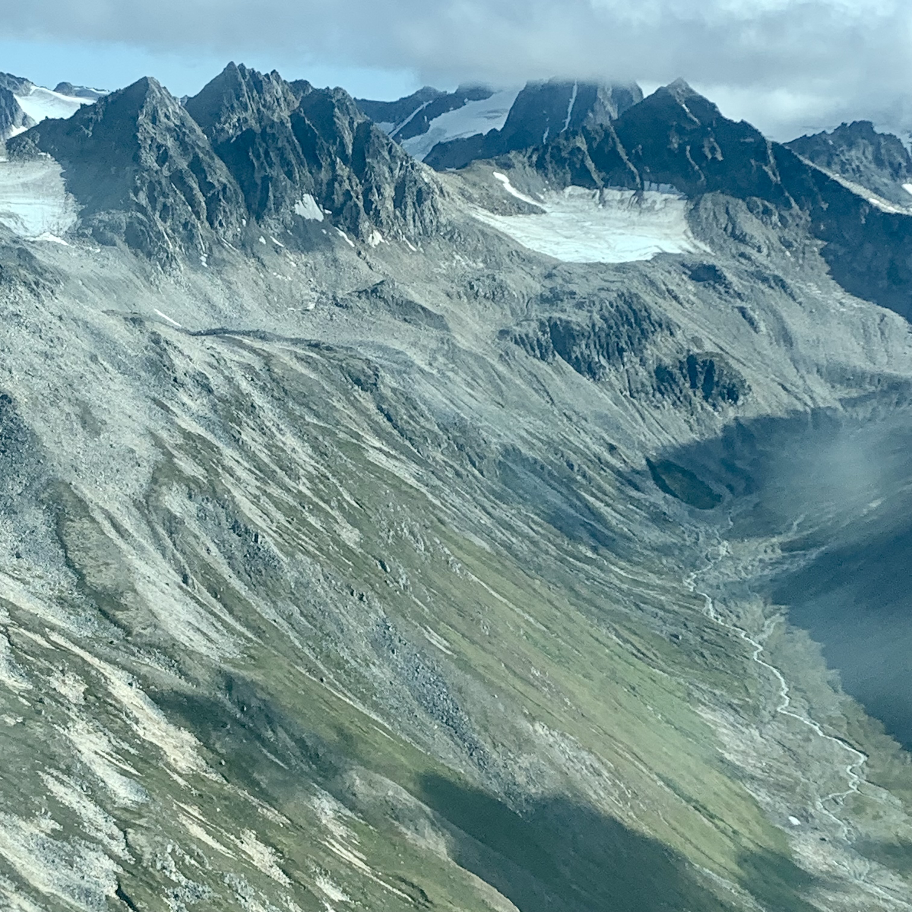 Once aboard our largest aircraft for the trip, a nine seater, the flight took us over the Cook Inlet, with views of its oil platforms and the bays and estuaries of the western shore of Cook Inlet. I was beginning to anticipate that this was going to be the bulk of the aerial view for this trip. Though they have their own unique beauty and can be stunning, I was ready for new aerial vistas and not a rerun of those ones I experienced last year. Then almost like a bolt out of the blue we were headed towards Lake Clark Pass , so named because it is a pass through the Aleutian Range from Cook Inlet to Lake Clark and which I understand now is the primary aviation route between Anchorage and the western part of Alaska. We were flying between and over towering snow-covered peaks. I have no idea how wide and at points narrow this pass is but it seems deceptively close at time as if our wings were close to brushing the jagged edges of the faces of cliffs. We experienced vista after vista of snow covered peaks, pillows of clouds , curling white ribbons of water cutting into knife-edge crevasses in the rock faces, and ice tongues crawling there way downslope
