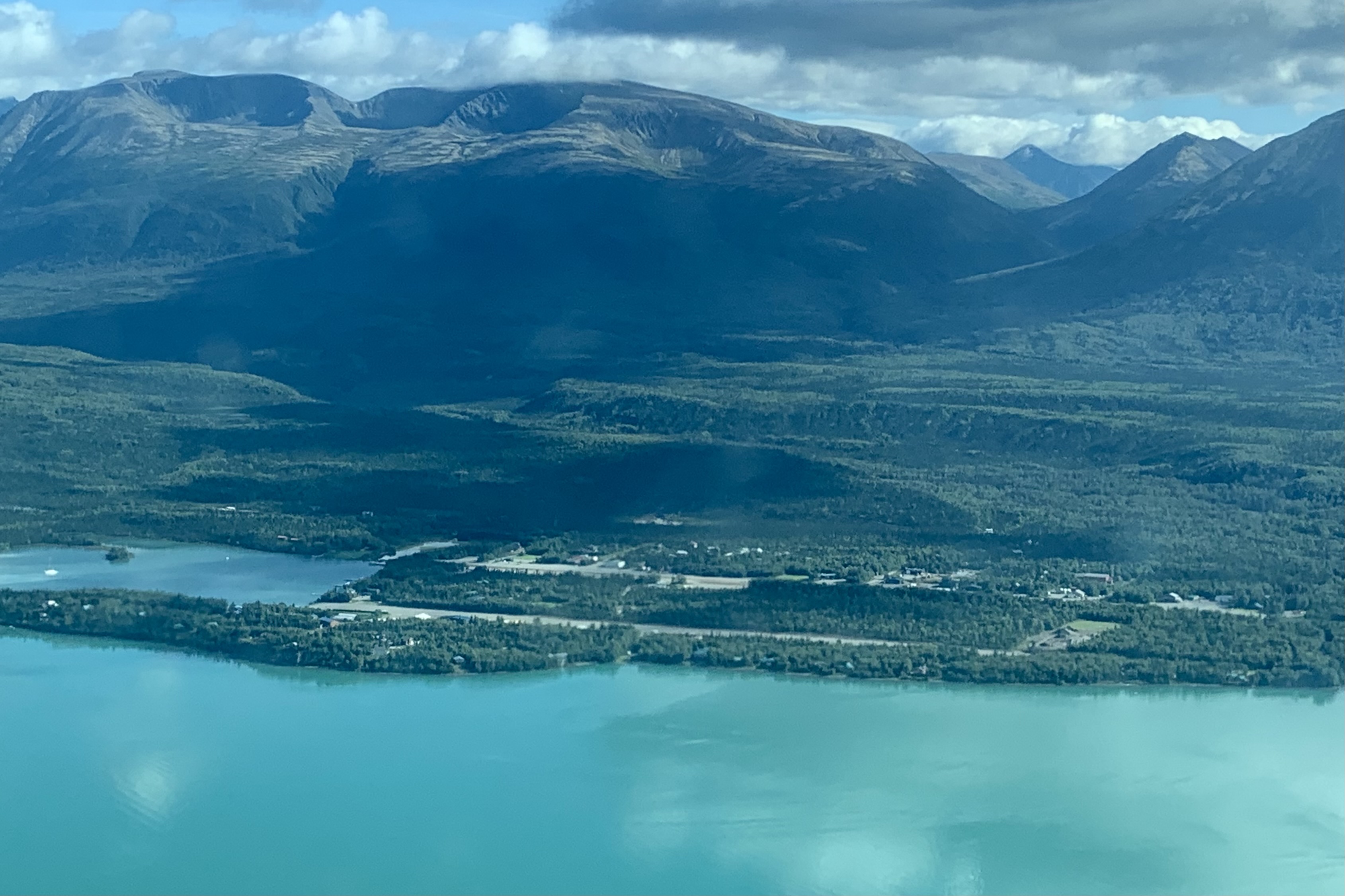 Coming out of the pass my eyes feasted on the amazing  spectacle of the glacier-fed turquoise water of Lake Clark and the  low green rolling hills surrounding it, with the village of Port Alsworth coming into view below. Soon we were in a quick decent  approaching one of the two  parallel, gravel thousand-foot-long runways. We skidded to a halt kicking up a cloud of dust to announce our arrival. What an auspicious beginning to a week-long adventure into the mostly untamed wilderness of these  Alaska parks.