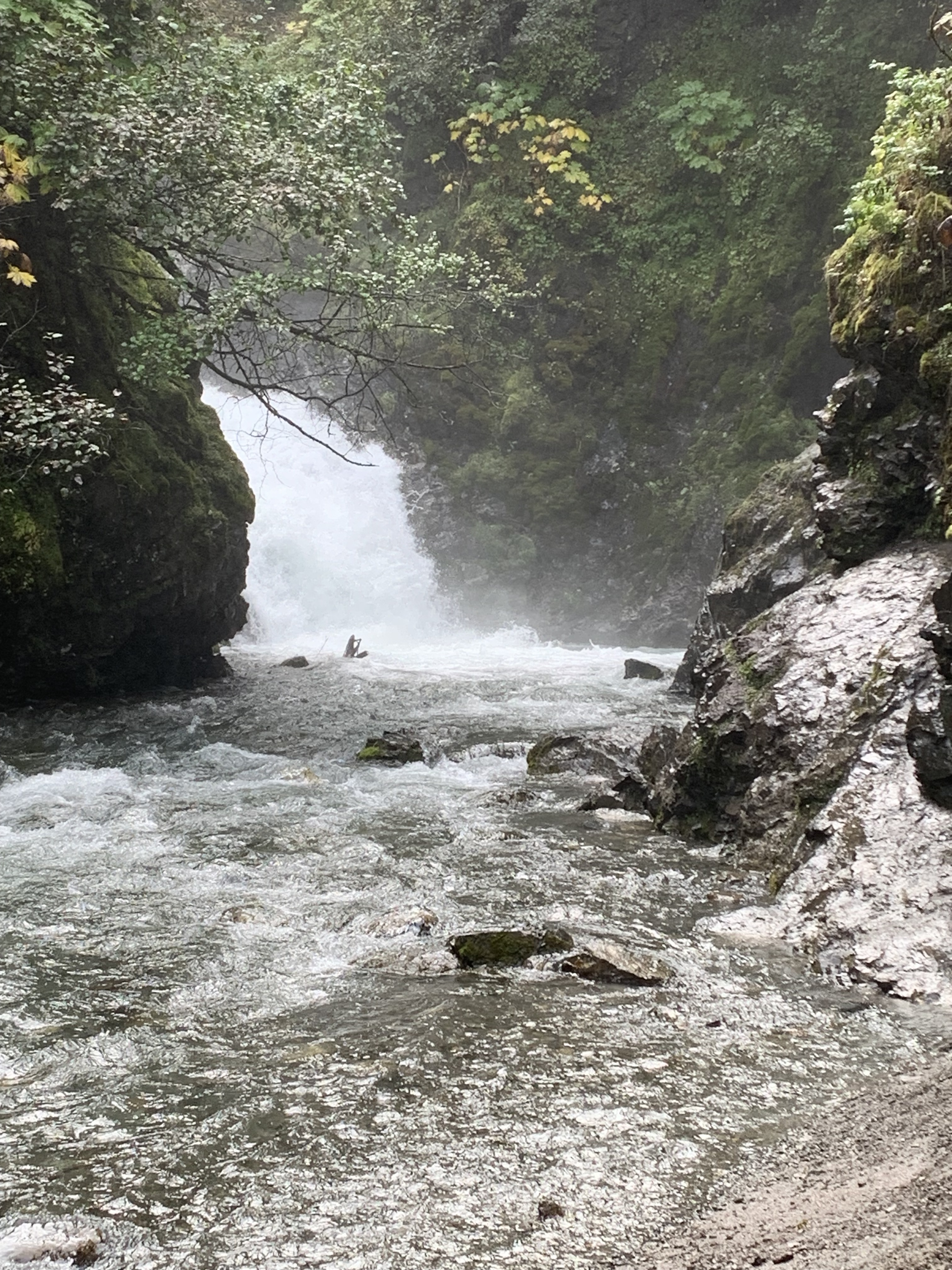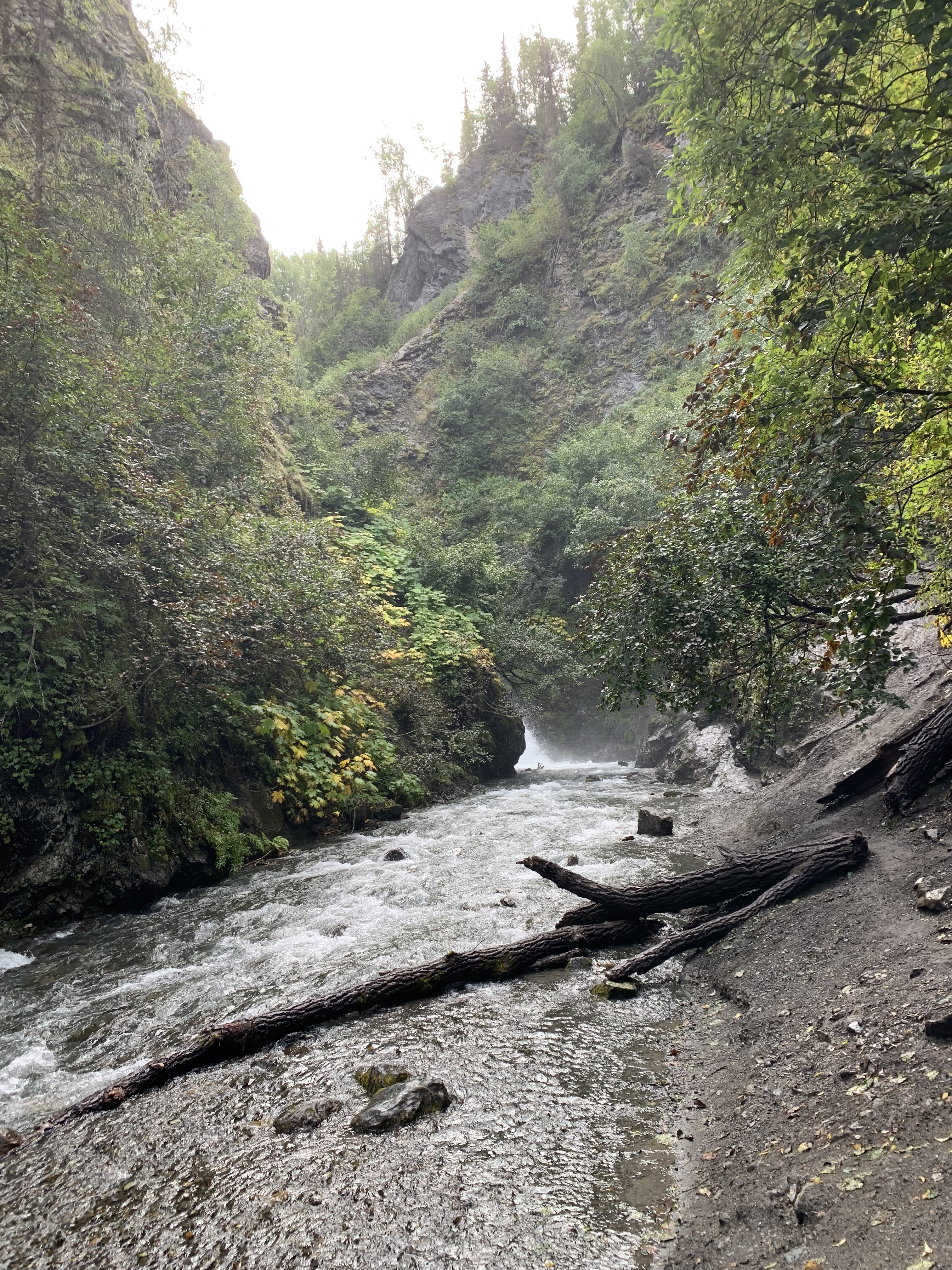 We headed up to Anchorage the night before as it was a holiday week-end and I had an immense fear of a major accident closing the Sterling Highway, the only road off the Kenai Peninsula and not being able to get to Merrill Field in Anchorage for a departure the following afternoon. The next morning after one night in a shabby hotel (seems to be more and more of them since COVID all over the place.) We discussed our options for the day until our appointed arrival time at Merrill Field. Having no interest in the Anchorage city scape or shopping ops, we chose to hike the trail to Thunderbird Falls north of Anchorage. The one-mile undulating trail to Thunderbird Falls traverses a lichen and fungi enriched birch forest along the Eklutna River canyon with steep cliffs on both sides of the gorge to a deck with views of this 200-foot waterfall. The view of the falls from the overlook was not particularly impressive in my mind because the platform is quite a distance away. There was no keen sense of the power of the water cascading over the falls but it was a lovely hike.