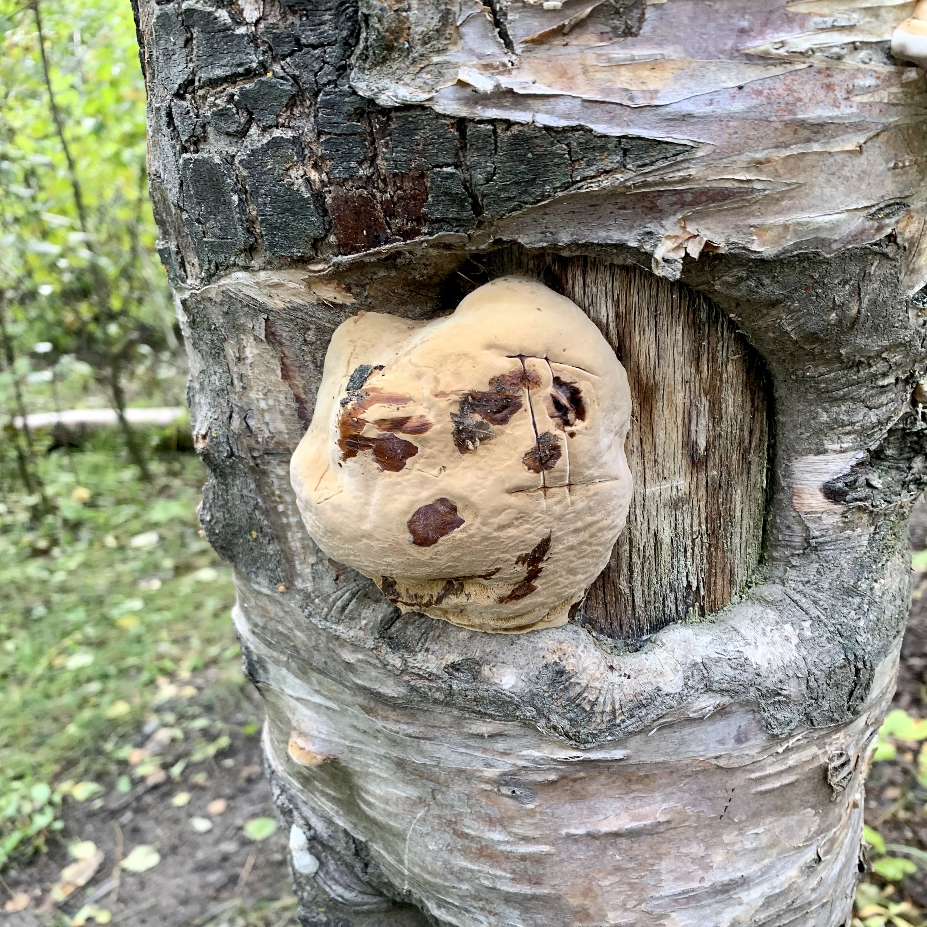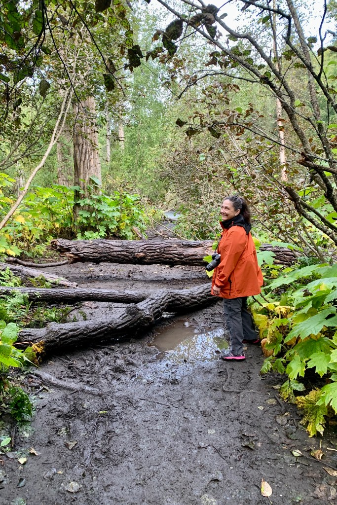 Our more adventure spirits took us down a side trail into the canyon, hopefully to the base of the falls. It was a suitably muddy, tripping root, somewhat steep traverse . What a downer at the bottom as I would have had to climb into the frigid rushing water making my way upstream on the slick rocks to the get close enough to the base of the falls to experience the chilly spray of Thunderbird Creek or get a unlimited view of the entire cascade. Camera zooms definitely create the illusion in my photo of one being in the spray zone of the falls. Since this hike was not a time trial to be annotated in a log book but a leisurely stroll, taking time to appreciate and to explore nature’s passion for multifarious life forms was pure pleasure. The fungi on and the array of hues of the birch trunks along the trail was enchanting