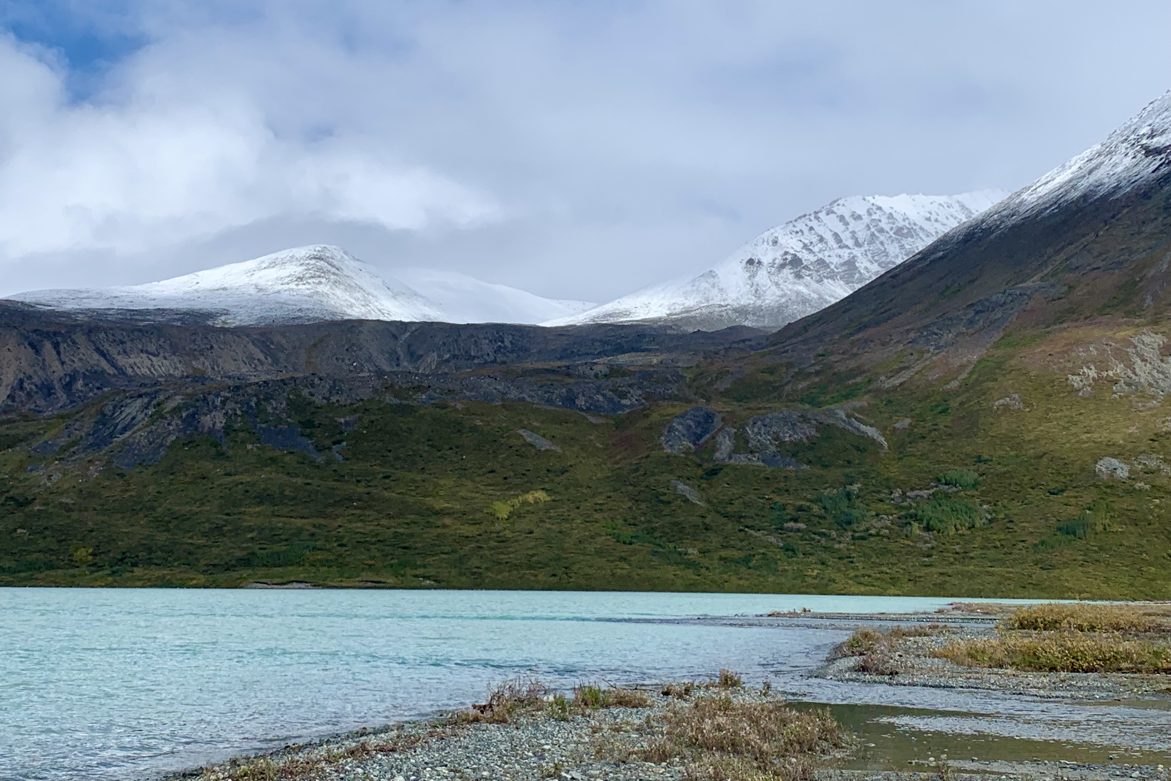 After a not so rousing fire experience, we headed north upon the Kijik River Valley over the beautiful watershed area of Twin Lakes, Turquoise Lake, and Telaquana Lake. Our landing destination was Turquoise Lake which is guarded by 8,000 foot high snowy peaks and Telaquana Mountain to the east and primarily tundra to the west. However on this day it was not quite the famous turquoise that is used in describing it’s allure as the brilliance depends on the absorption and scattering of sun light as it is reflected off “glacial flour” suspended in the water. There was an absence of sun for this visitation! Since the lake is at relatively high elevation, the vegetation was sparse and it was quite chilly out. This was our first lake where we could actually do a walk about and we made our way up through the channels of glacier runoff. These meltwater streams cut many shallow channel through this stony “beach” feeding into Turquoise Lake.