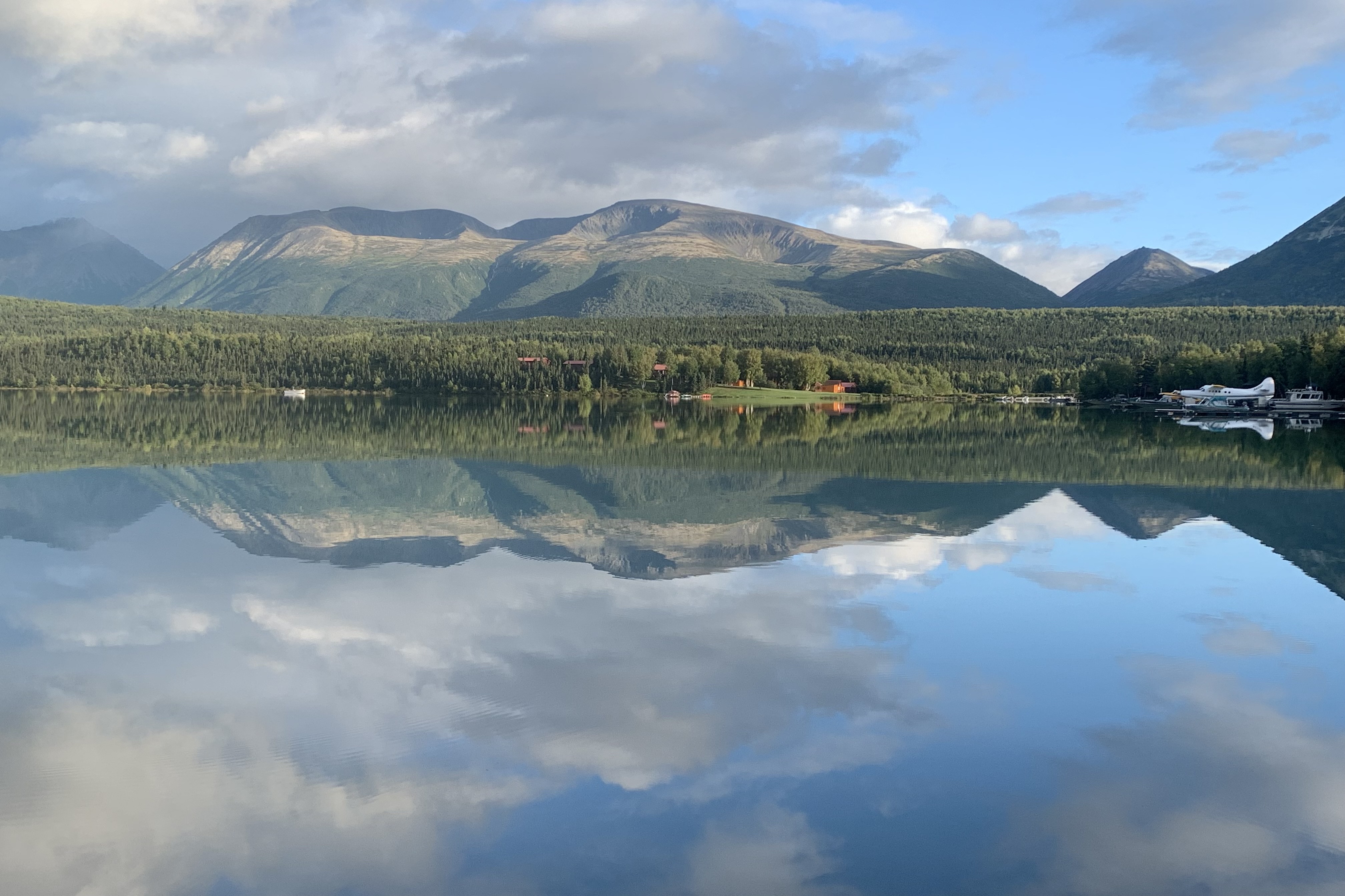 I would have loved to wander that area and head up towards the glaciers but time and weather dictated our return to the Lake Clark area. Nearing Port Alsworth we spotted a moose in a small lake below. Our pilot circled lower and as we returned back over this lake for our photograph of the moose it not so obligingly dove under the water leaving the mud trail pictured below. “Home ” for the evening at our accommodations, Lake Clark Farm Lodge, was always a peaceful and serene experience enhanced by the stunning reflections on the Lake and a rainbow over the far mountains,.