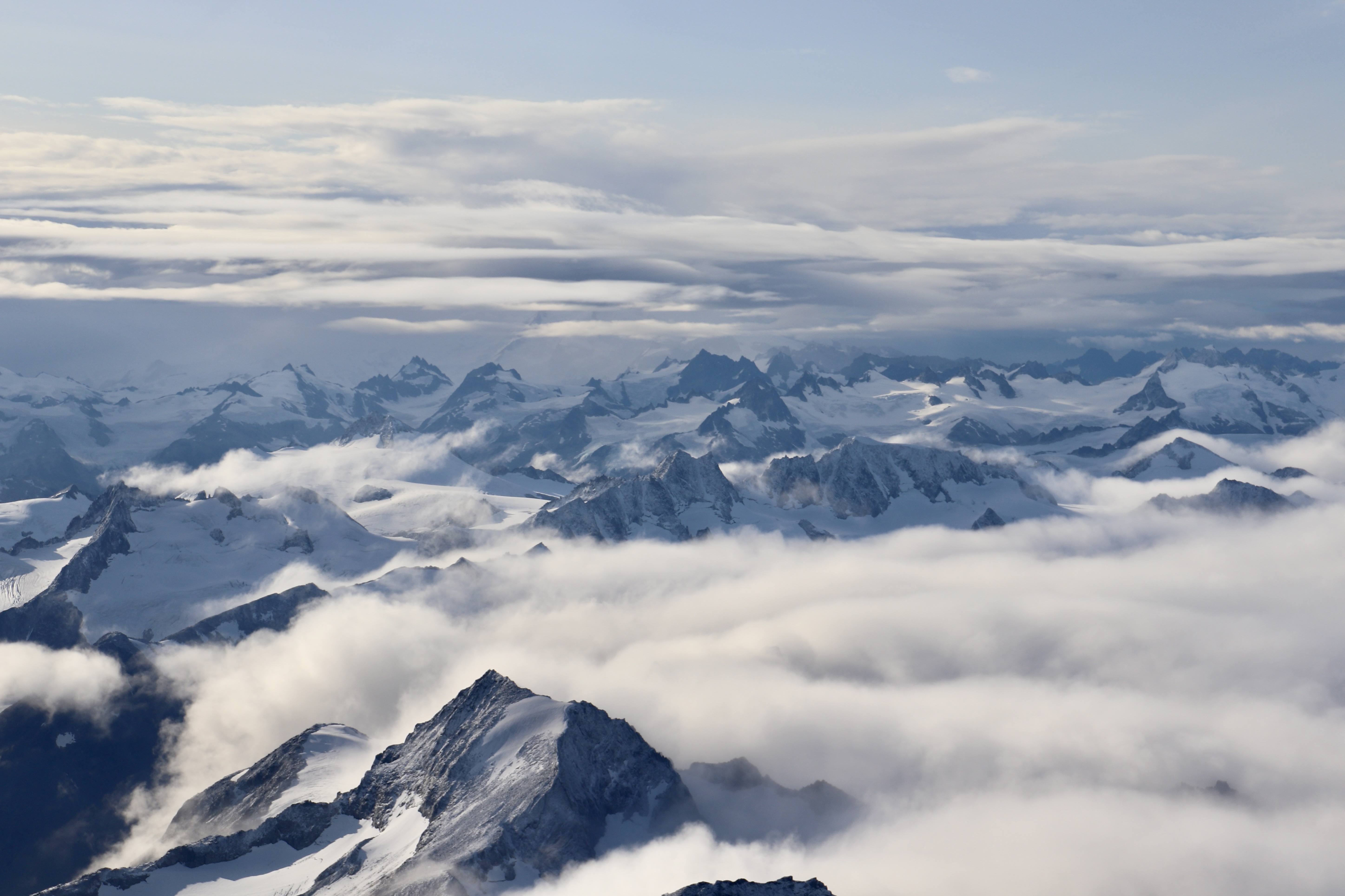 Ascending above the clouds, what a splendorous sight it was to see the jagged mountain peaks punching through the billowing clouds. It evoked such a wonder and amazement. What a sharp contrast between these jagged, sharp, angular unyielding summits and the wispy, pillowy and cumulous clouds about.