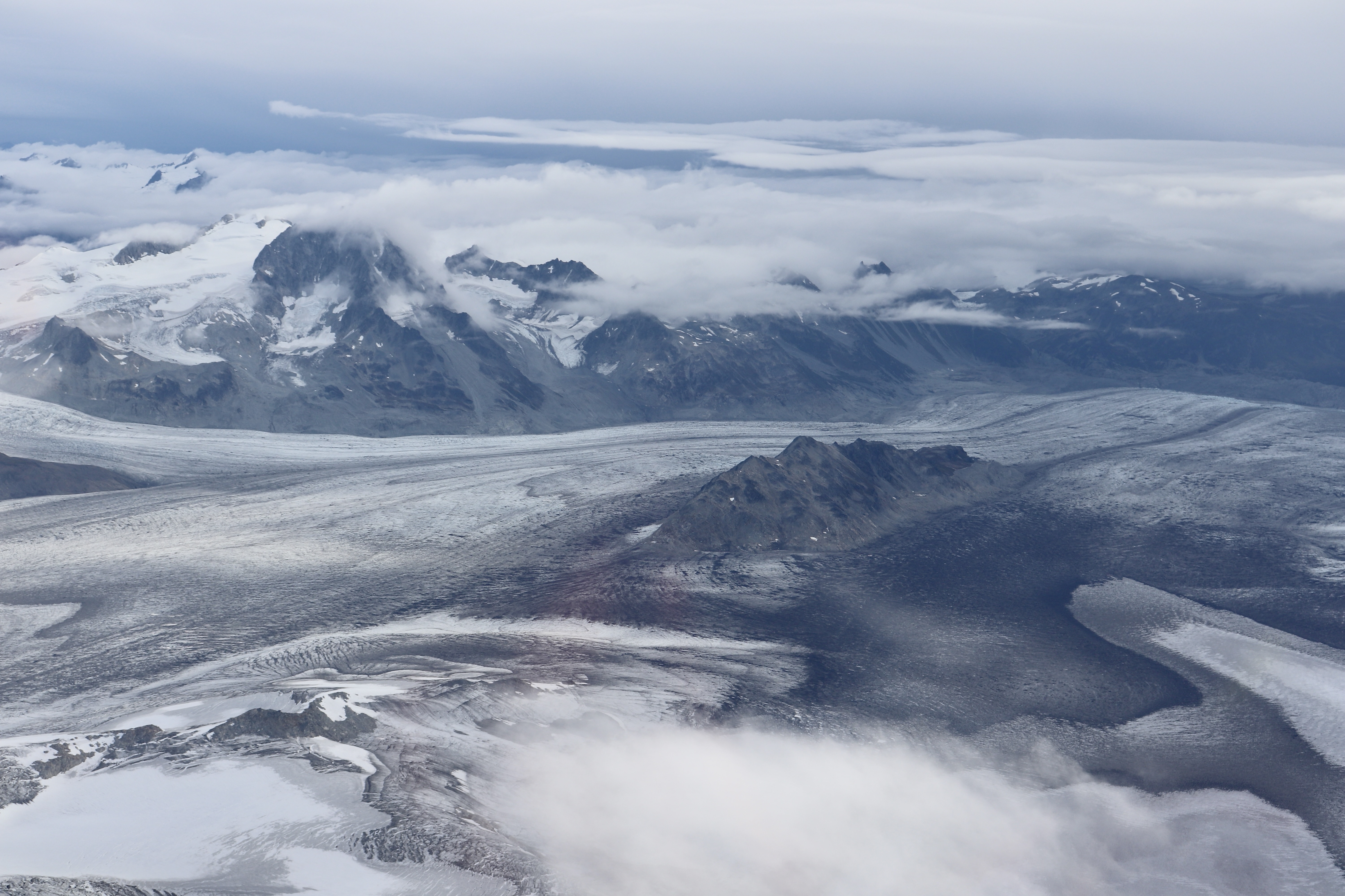 Circling around Mount Redoubt was the goal, but unfortunately the clouds were accumulating on its summit and far side, enveloping the mountain, so our pilot bailed on that plan. Redoubt from this aerial standpoint speaks magnificence and grandness and it is an altogether different experience than from the ground. Our next destination was Mt. Iliamna but its affinity to the cumulous clouded us out as well.