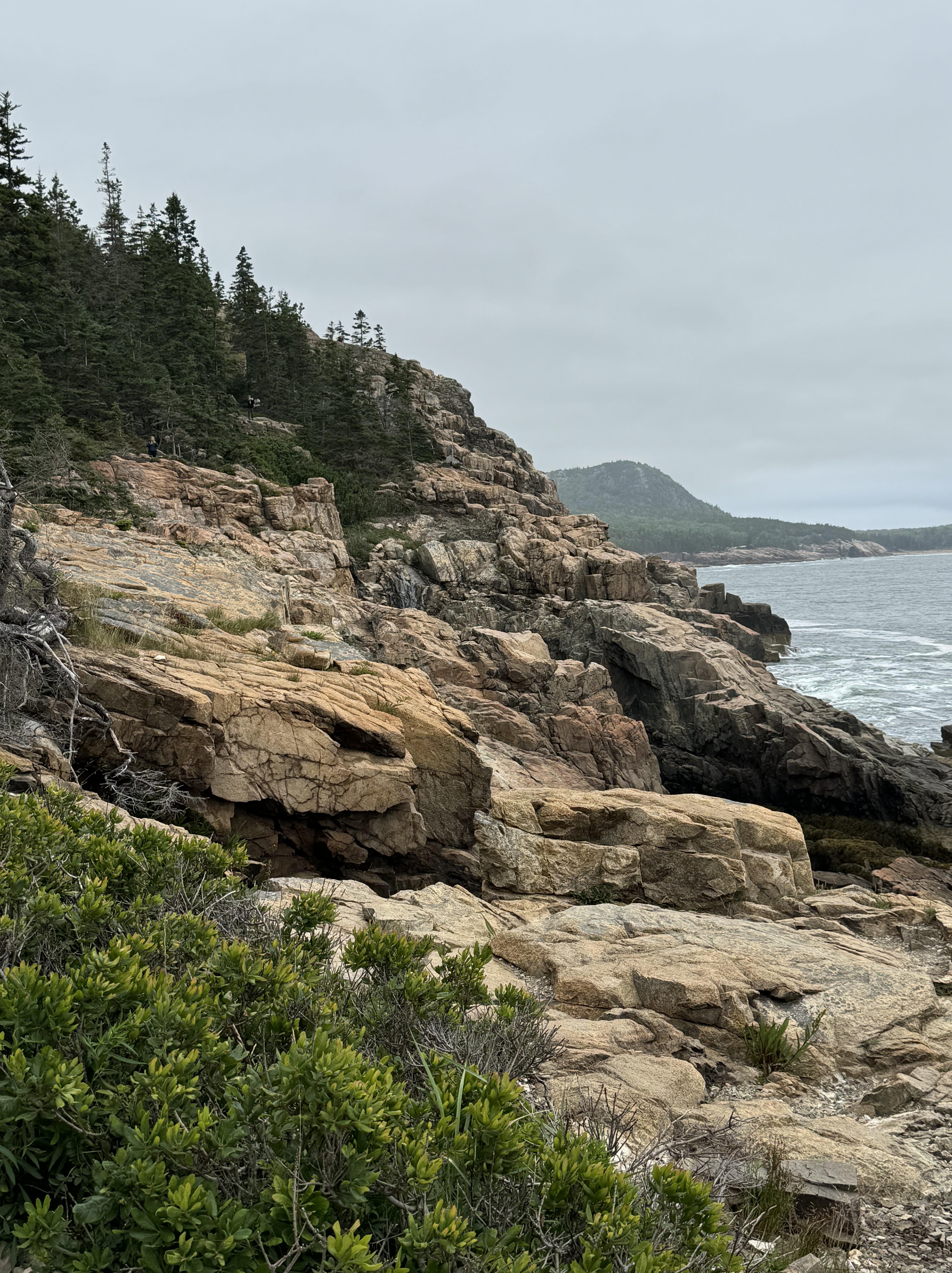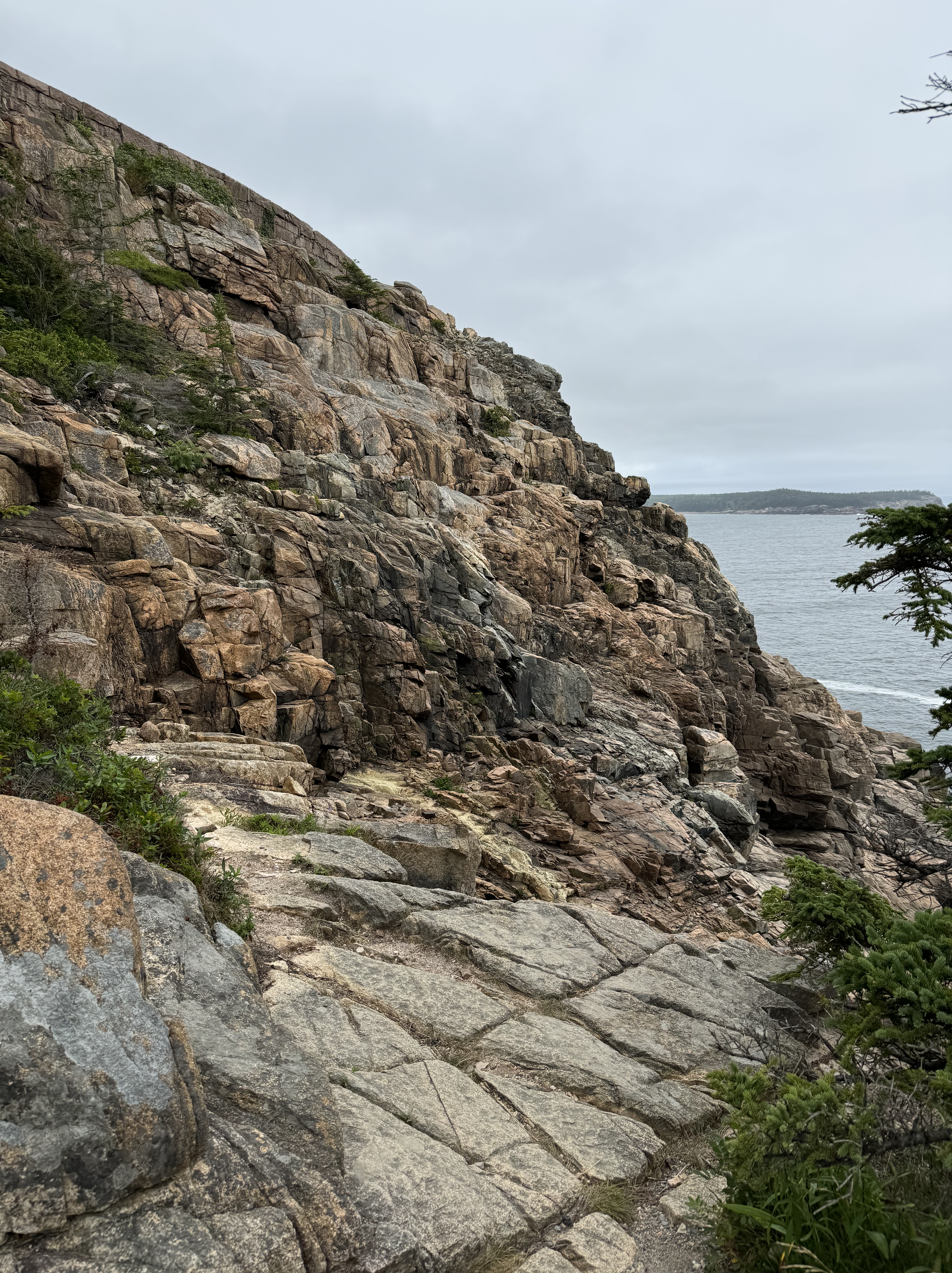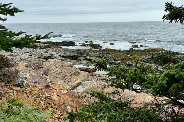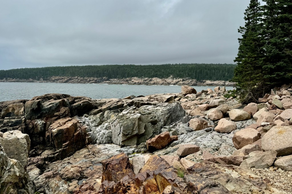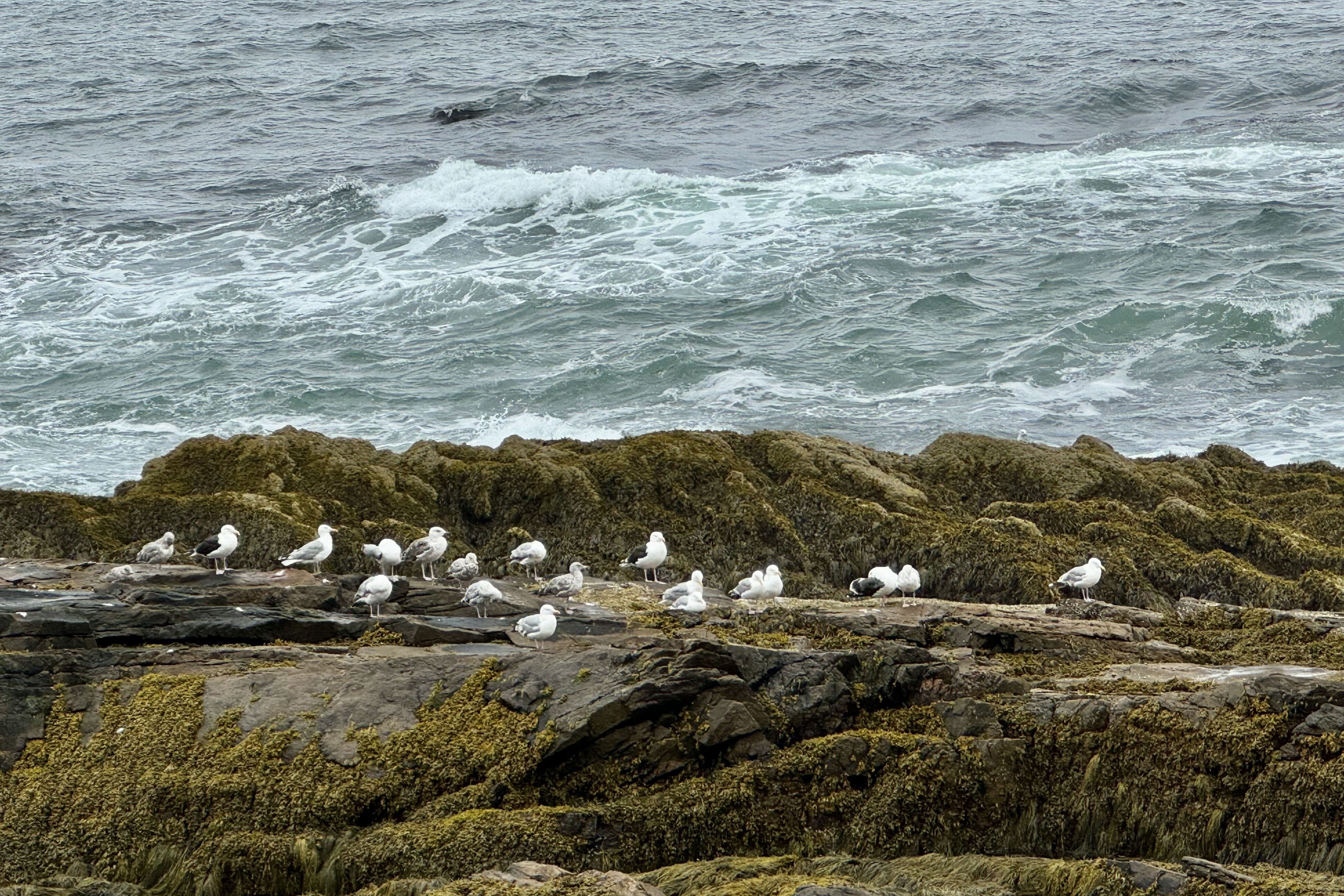 The only way to drive the Cadillac Mountain road, One of the “premier” experiences at Acadia is through a reservation system ahead of time. I had reserved a spot for the 11:00 am hour. I knew the prospects were pretty dim for feasting my eyes on some spectacular vista of the harbors and waters surrounding Acadia. With time to spare, I drove down to Otter Point and though the craggy rocks of the coastline were visible, a shroud covered everything mid-treeline and above.