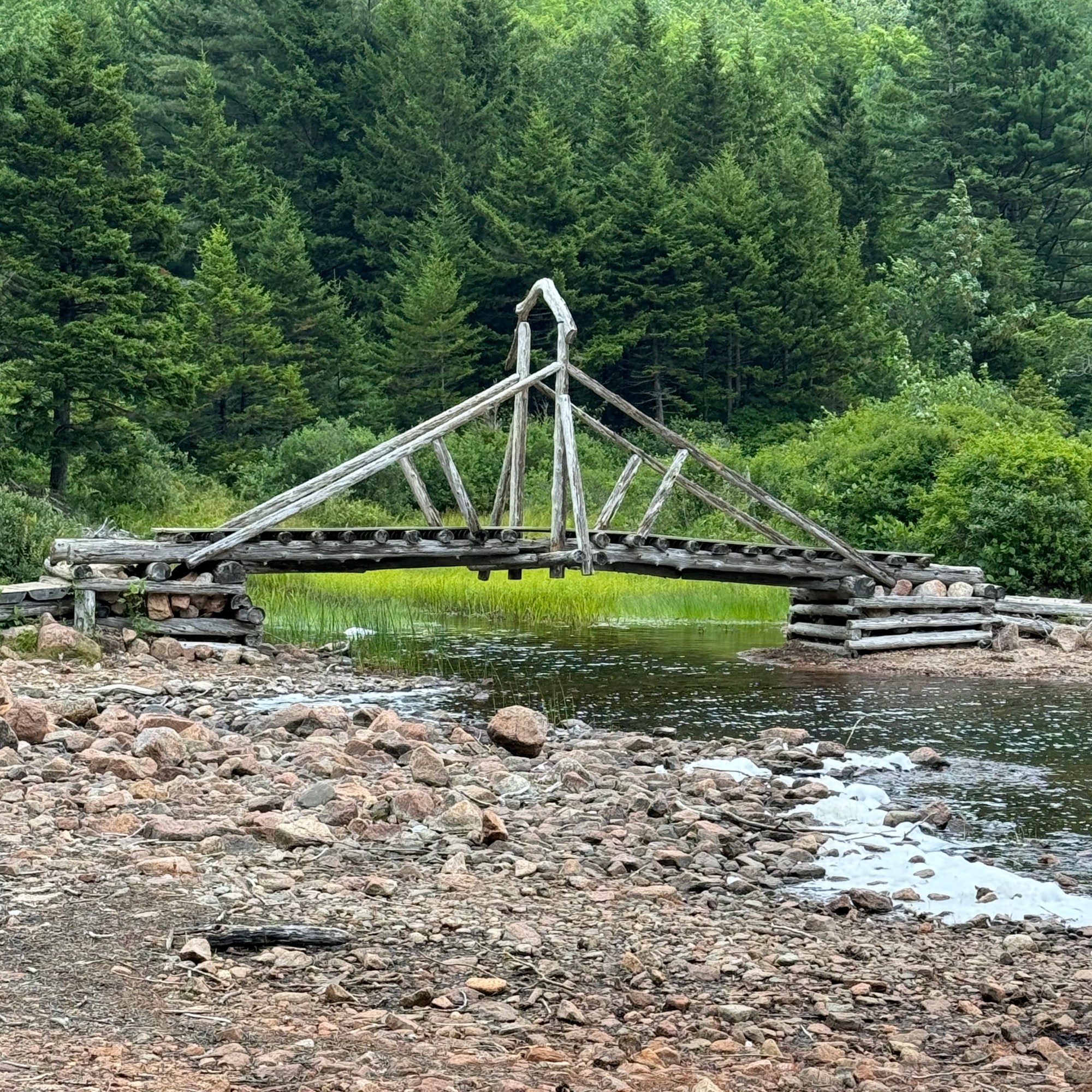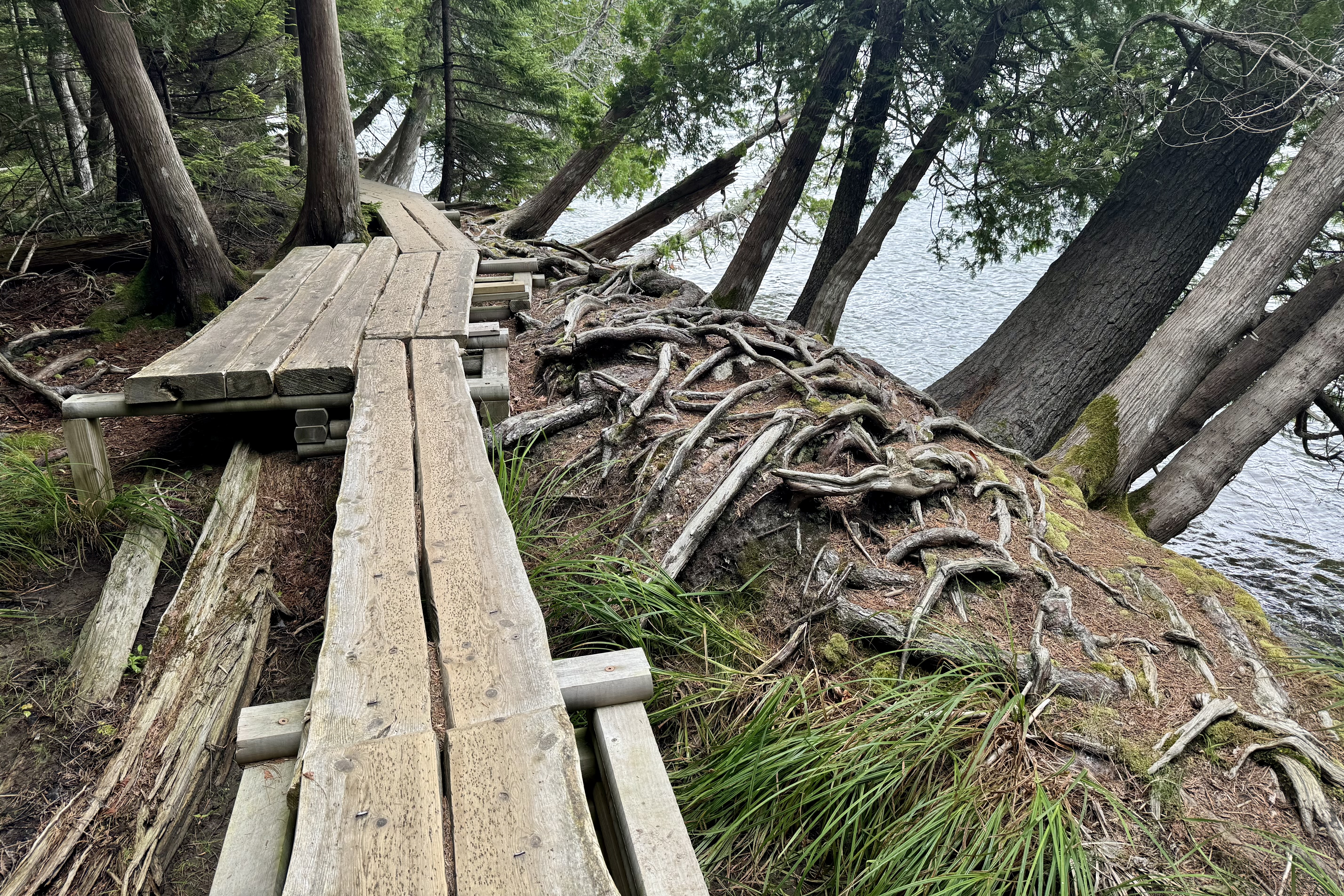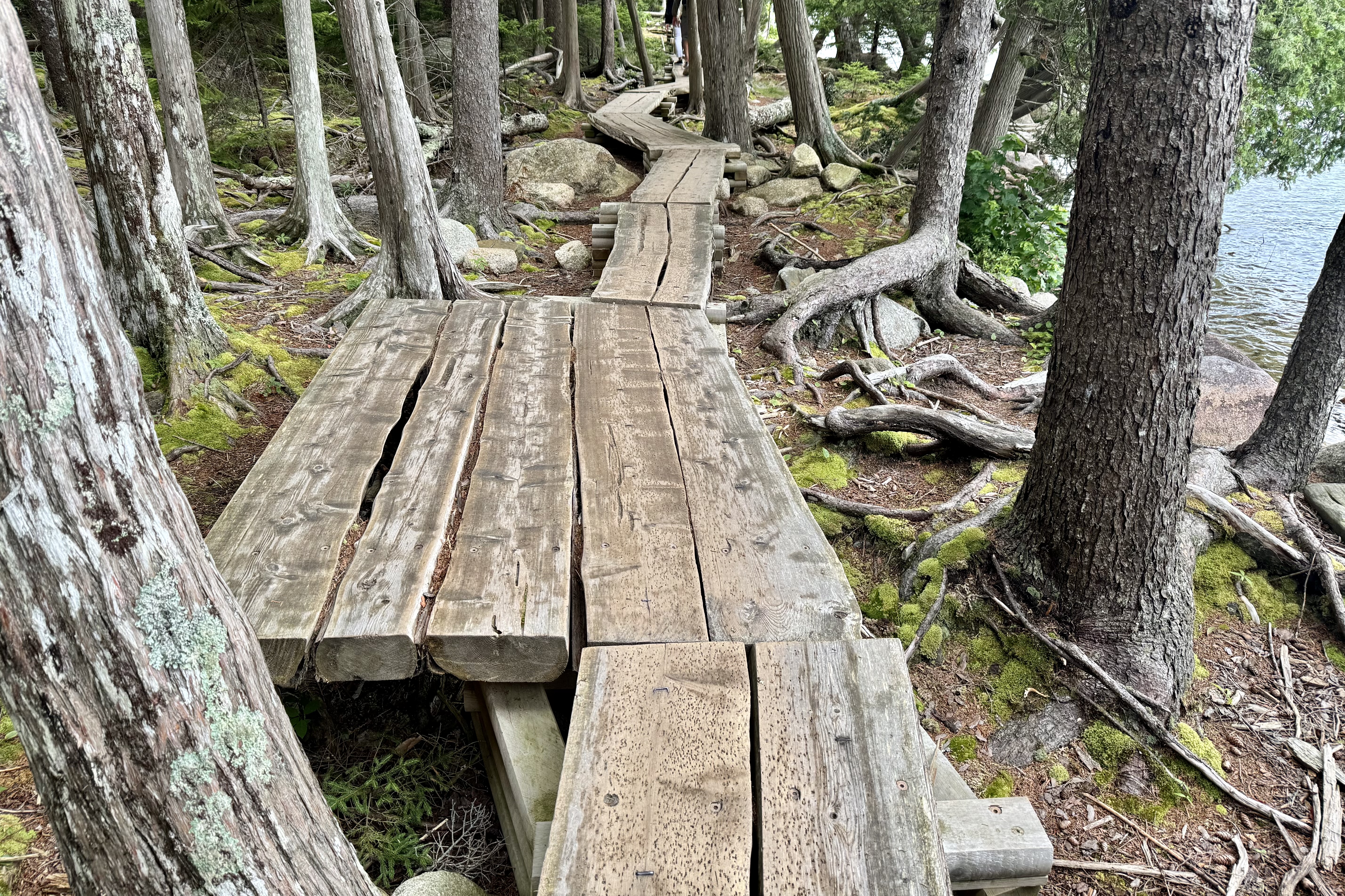 Of course parking here was an issue as well as all the lots were full and I was about to head back to the campground when right on the main road someone was pulling out of a spot. I was glad I am good at parallel parking. So I headed to find out all about Jordan and his Pond. I had not really had any thought about taking a hike but there was a lakeside trail I thought I might walk a piece. I did have my walking stick but also my purse which I definitely prefer to leave in the car . Usually there are no shops along a wilderness trail to squander my dollars. There was a family in front of me with the gramma who appeared to be in her 70’s so I thought I will turn around when they turn around. Well they kept on going so I kept on going. The trail was this weird boardwalk quite unlike any trail I have encountered. Mostly two boards wide with every so often a short 4 board platform to allow for hikers coming the other way to pass. By now I was committed and was quite enjoying this new challenge.