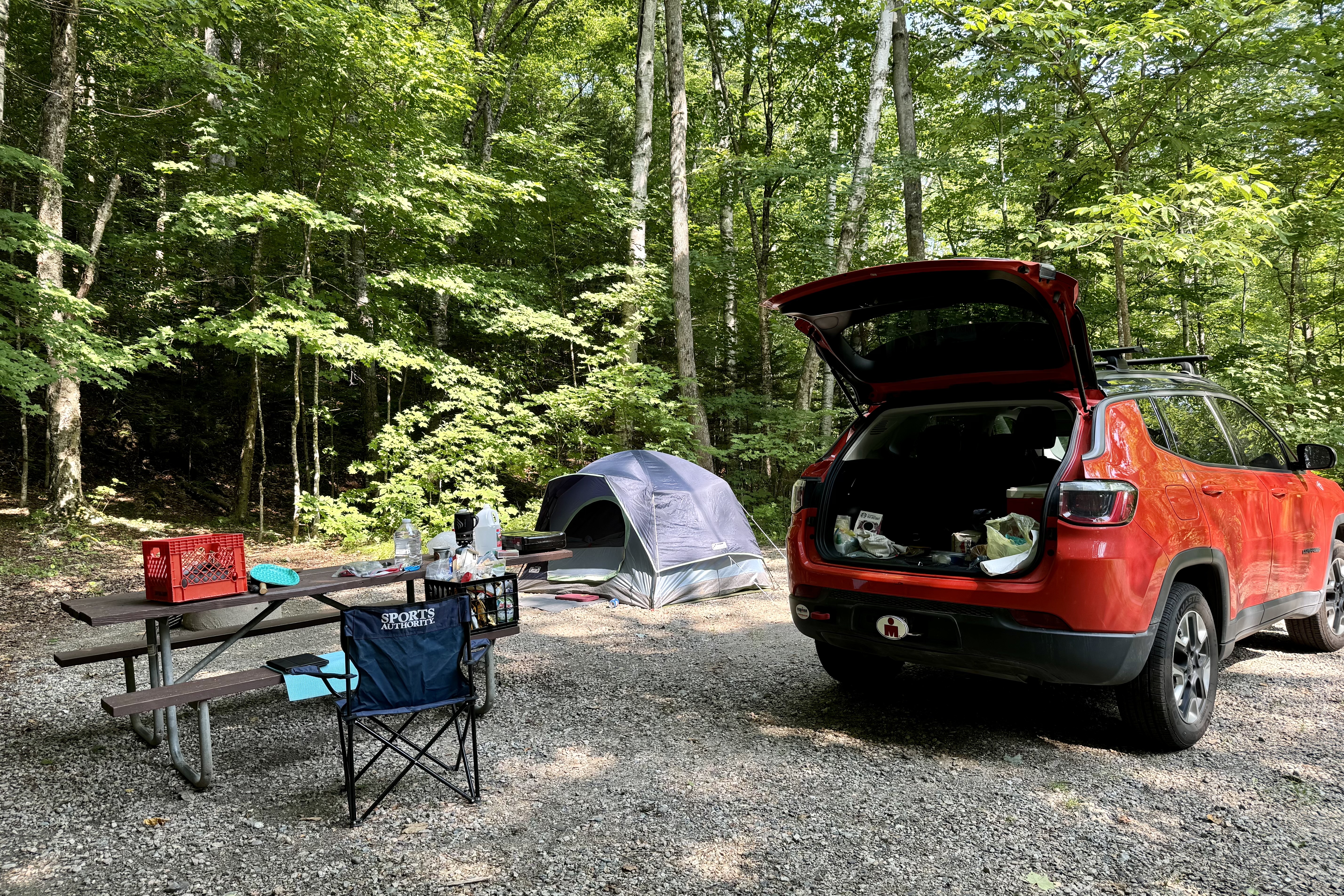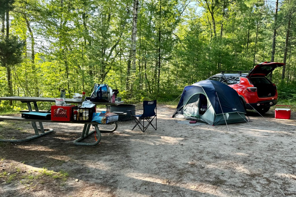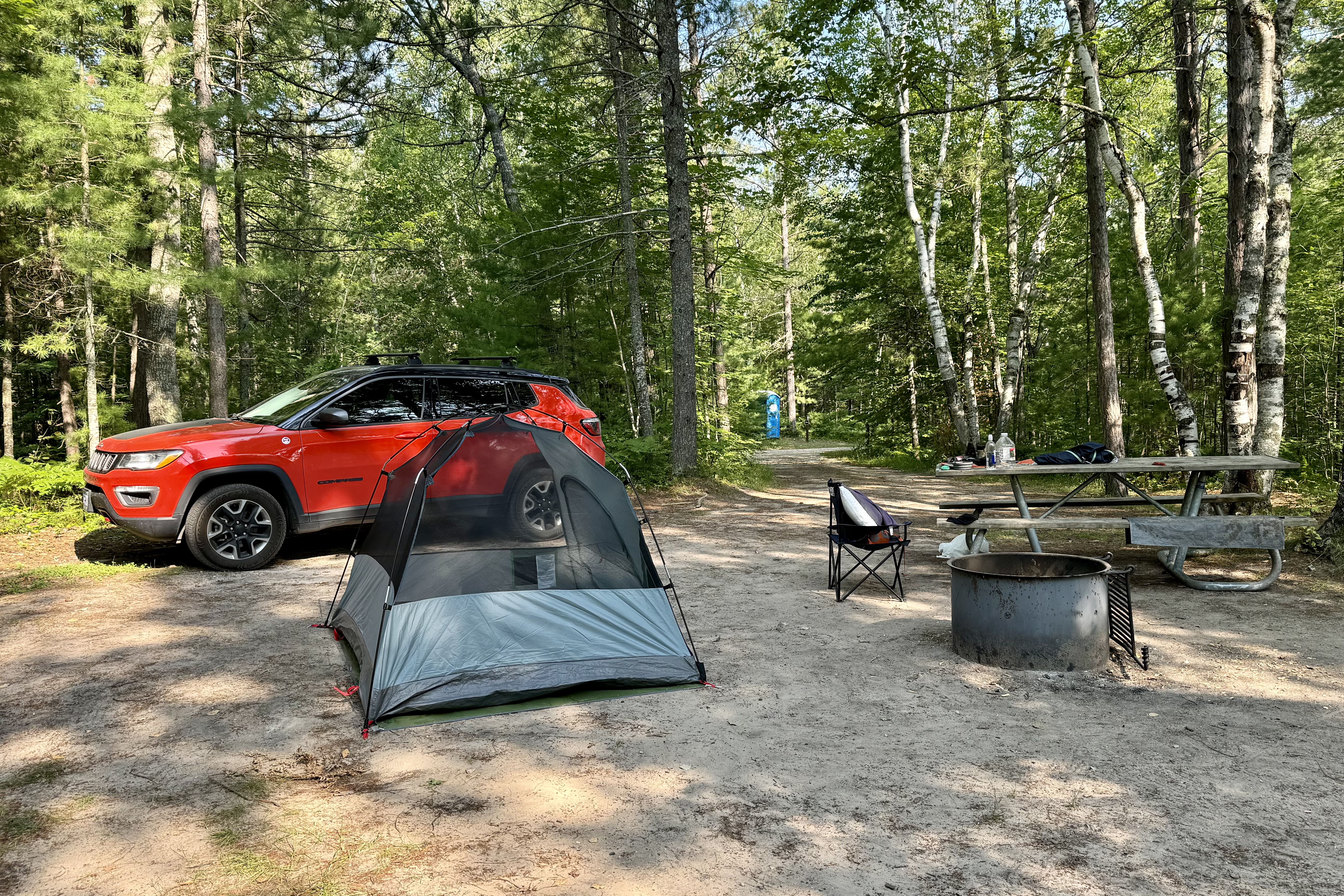 Fortunately, it was still sunny upon arrival at the campground and I set about trying to dry out the tent, fly, ground cover, tent rain coat and any other sodden item. Though sunny I could hear the rumbling of thunderstorms much closer. So I shifted into fast forward and basically just dumped everything into the tent that I would want for the evening.