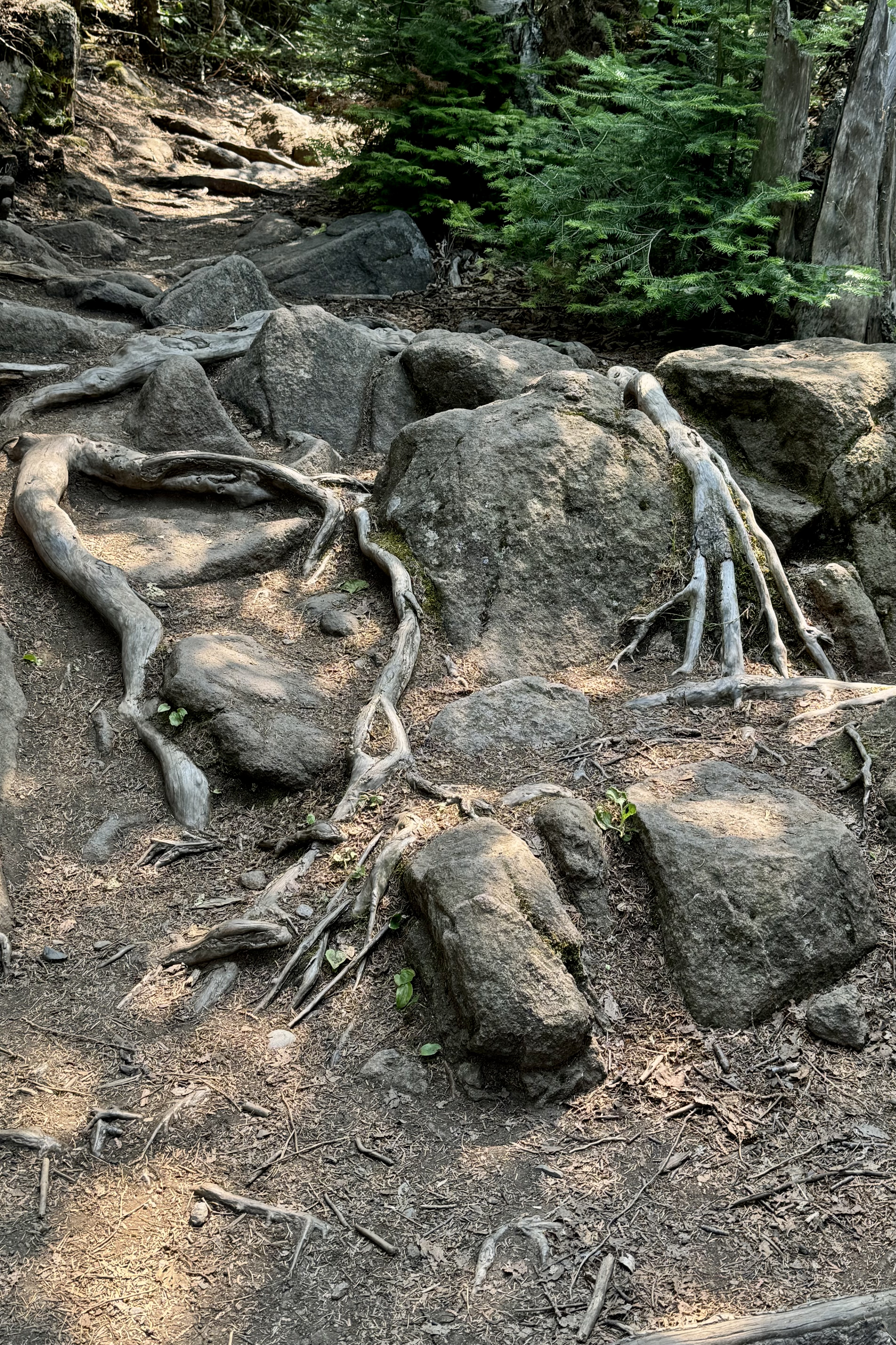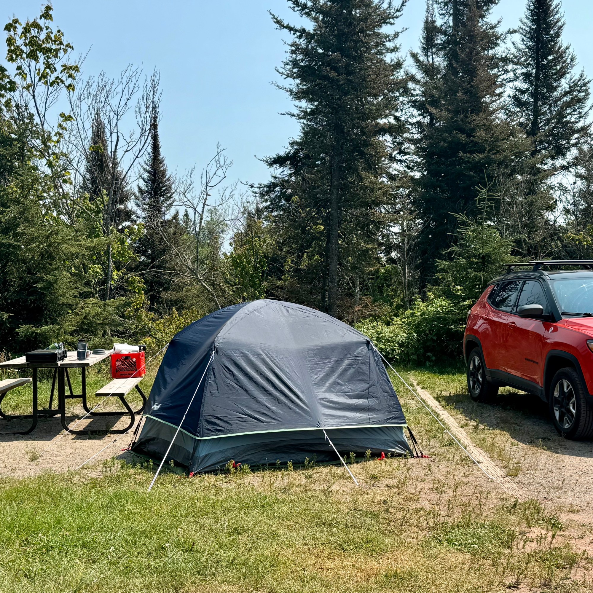 Once there and with no one camped out on my reserved site, I began the chore of drying everything out from the drenching storms at the last camp a couple days ago. I was even more certain that my choice to bail on Fitzroy of Canada was right, as even though the rain had diminished to a light drizzle and, given the real mess of mud and debris on the tent and the infamous leaking rain fly needing repair and still oozing water, I would probably have sat down in one of puddles in the campsite and cried. At least here it was dry, sunny and about 72 degrees with very few airborne pest at the campsite. The main insect to watch out for was tiny buzzing bees but they were mostly attract to my food and not me. Guess no sweetness oozing out of me. But the hot hood of the car did wonders on the rainfly and with the muddy underside the tent laid up over the picnic table I accomplished my household chores in no time.