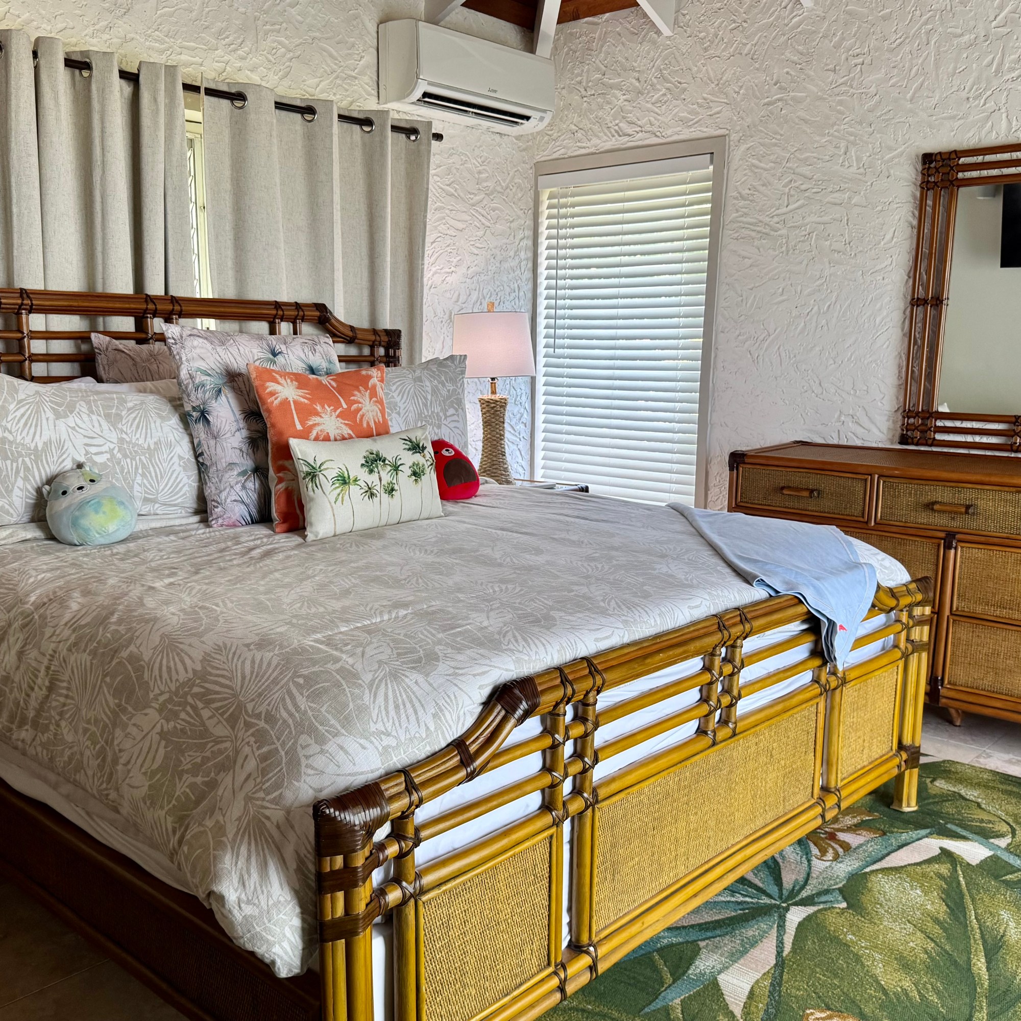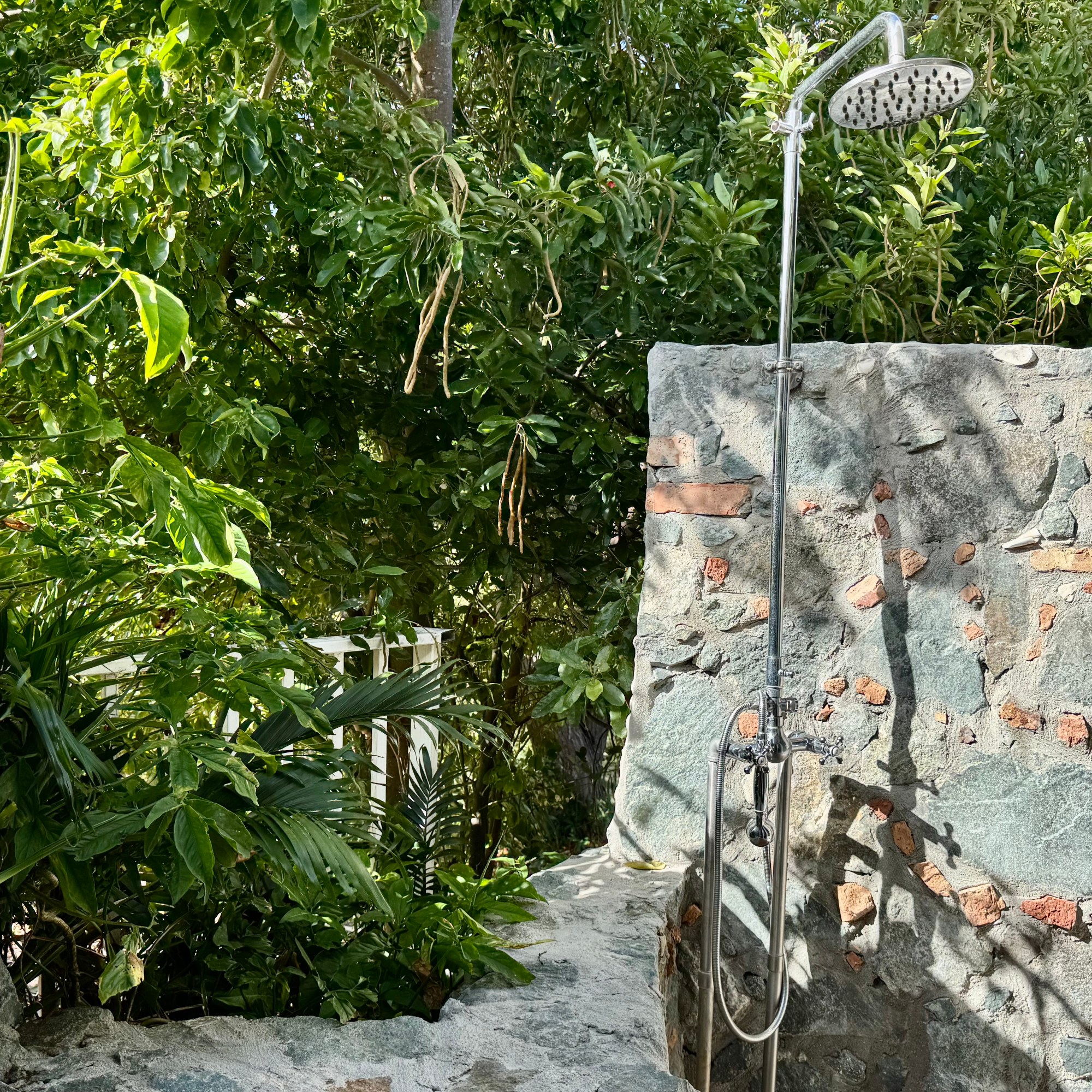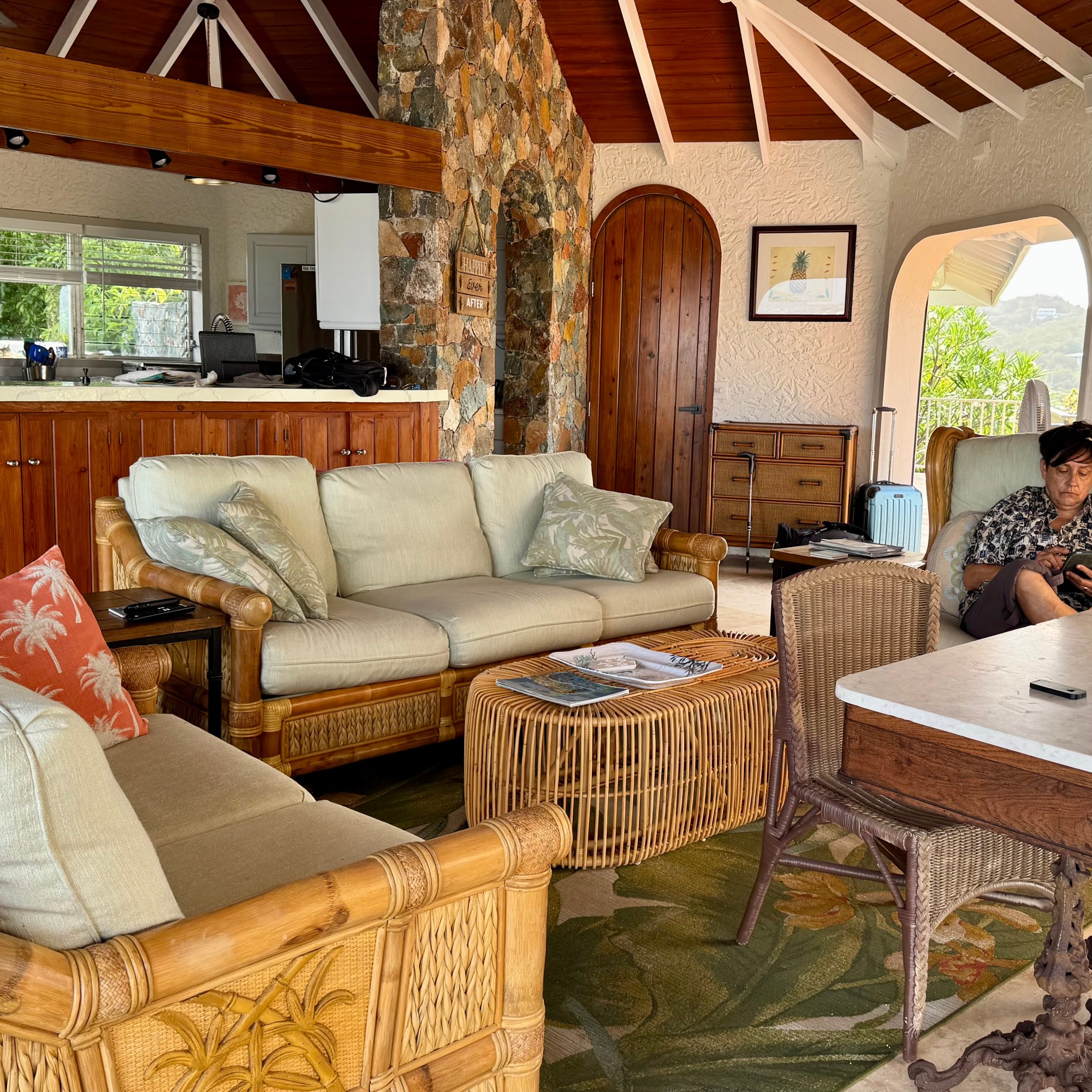This luxury villa had two bedrooms with king beds, and what they called a third bedroom (this is a questionable assignation) which was supposed to have a full-size pull-down bed. I found it more akin to an office area to be walked through to get to the other bedroom. Delightfully, both bedrooms had al fresco showers. As in St. Croix the open-air living room and kitchen and al fresco dining area blended the indoor and outdoor spaces thus allowing the topical breezes or the brisker trade winds to blow through.