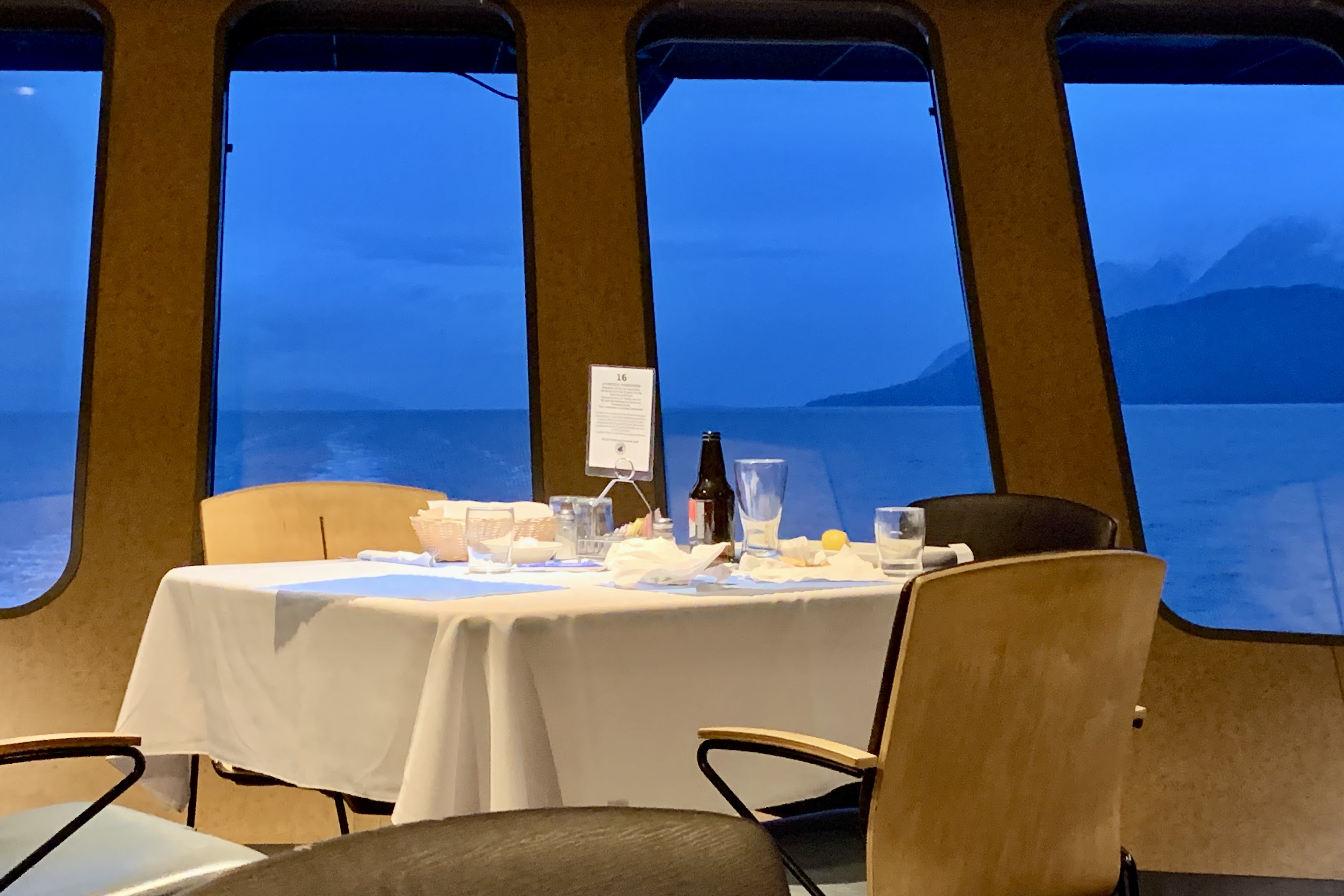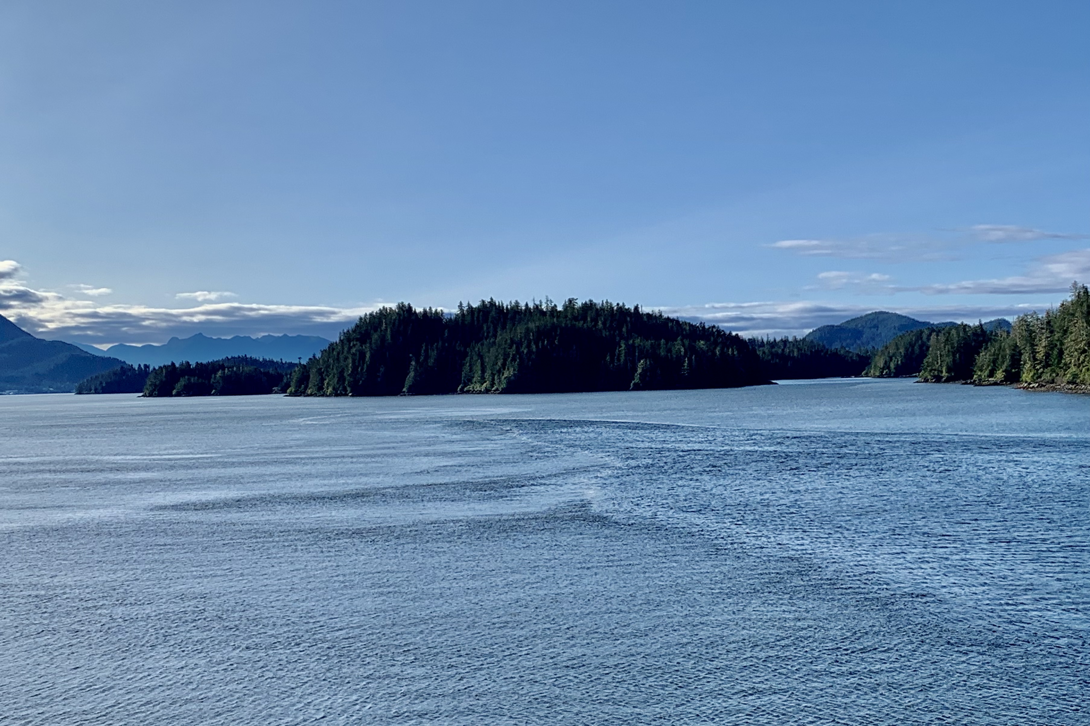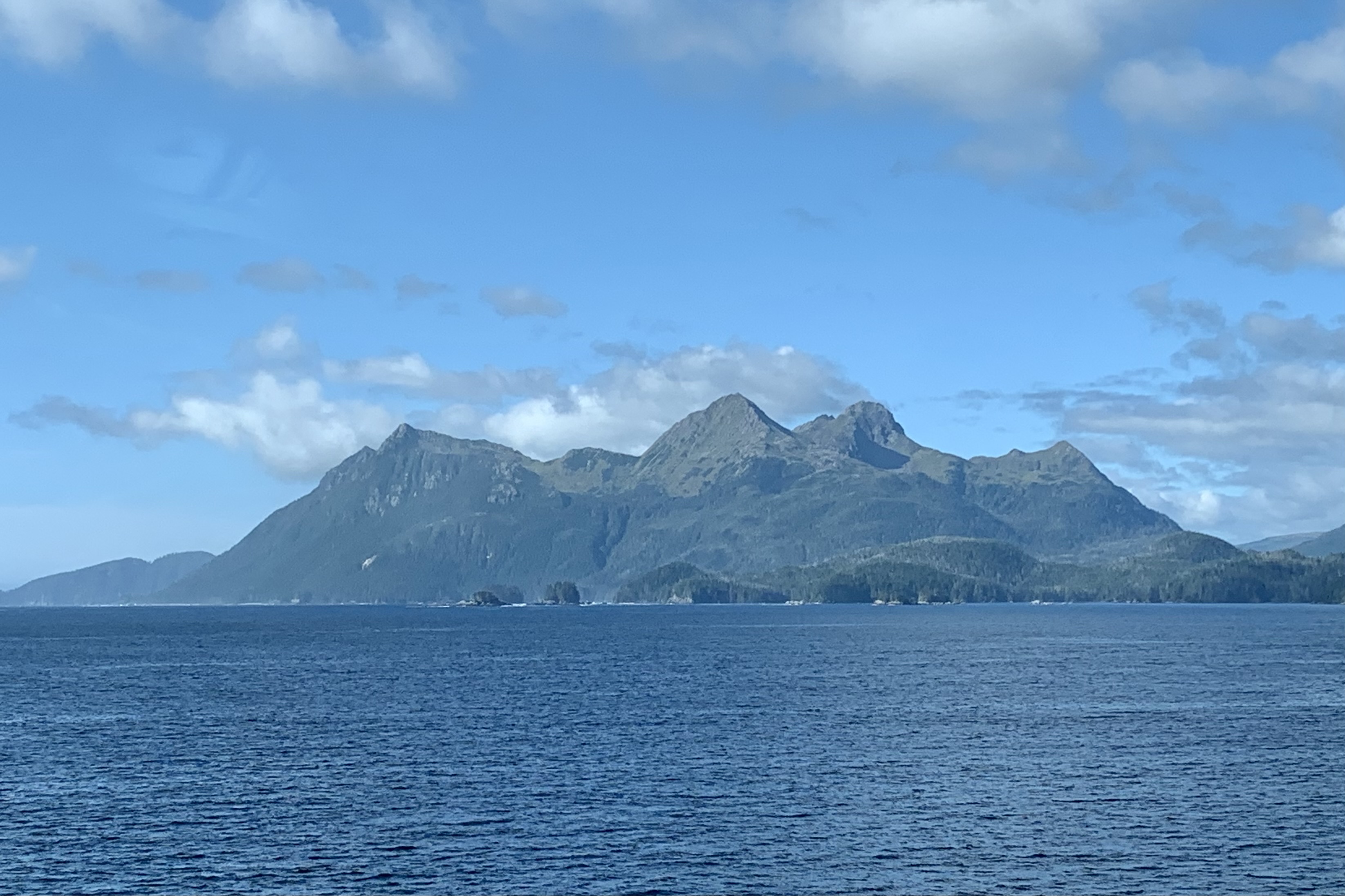 With fewer distractions, the following day was time to catch up on some reading and writing. Since there was no wi-fi available on the Alaska Maritime Ferries and very few spots with cell phone reception, it was a time for reflection, relaxing on deck as the day eventually turned out beautiful blue skies and scenery of forested islands and undulating mountain with rounded contours, an occasional jagged peak punched in between and shimmering ripples on the water. Overall the day’s journey was one of serene beauty and had calming hypnotic effect.