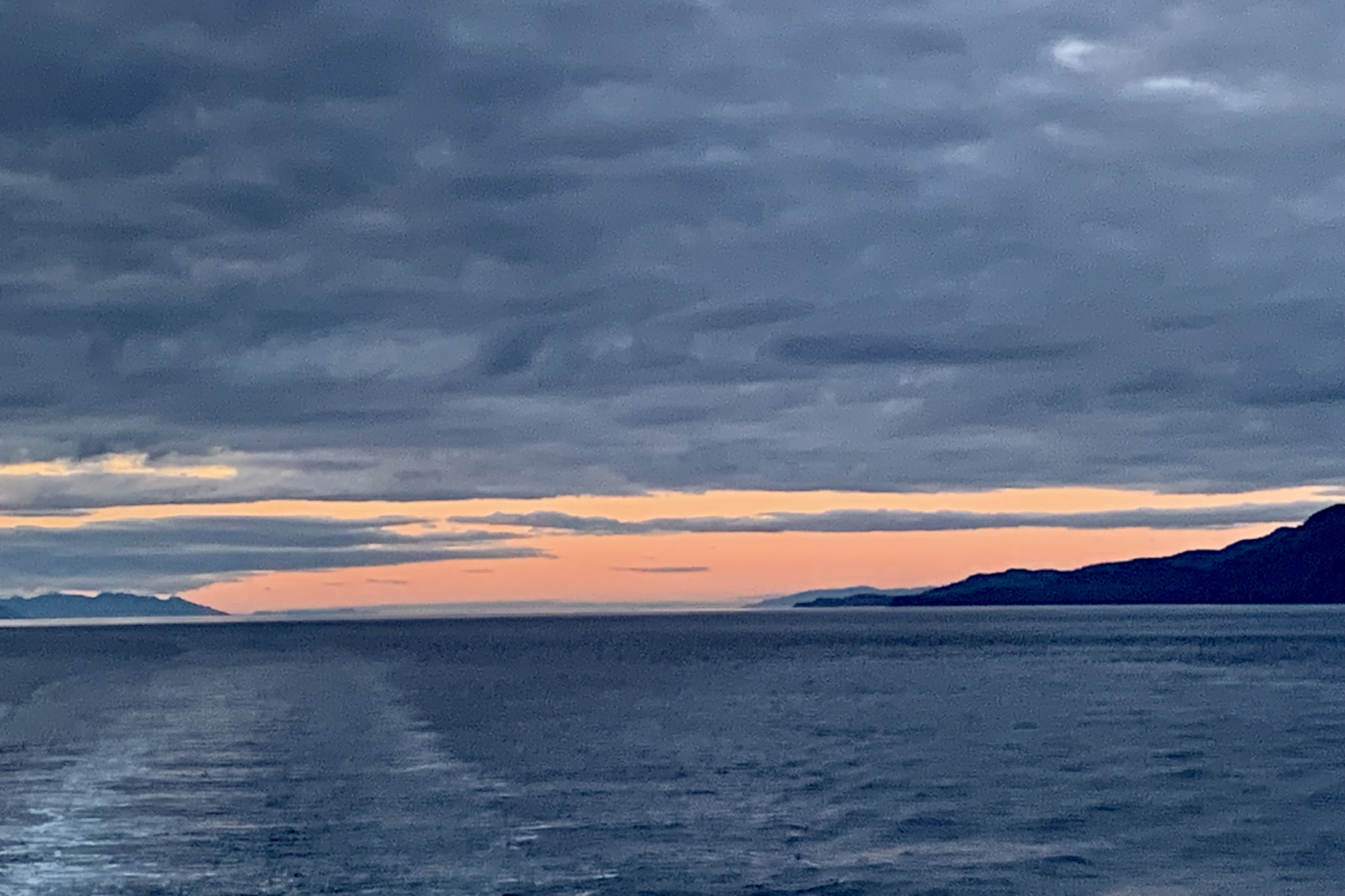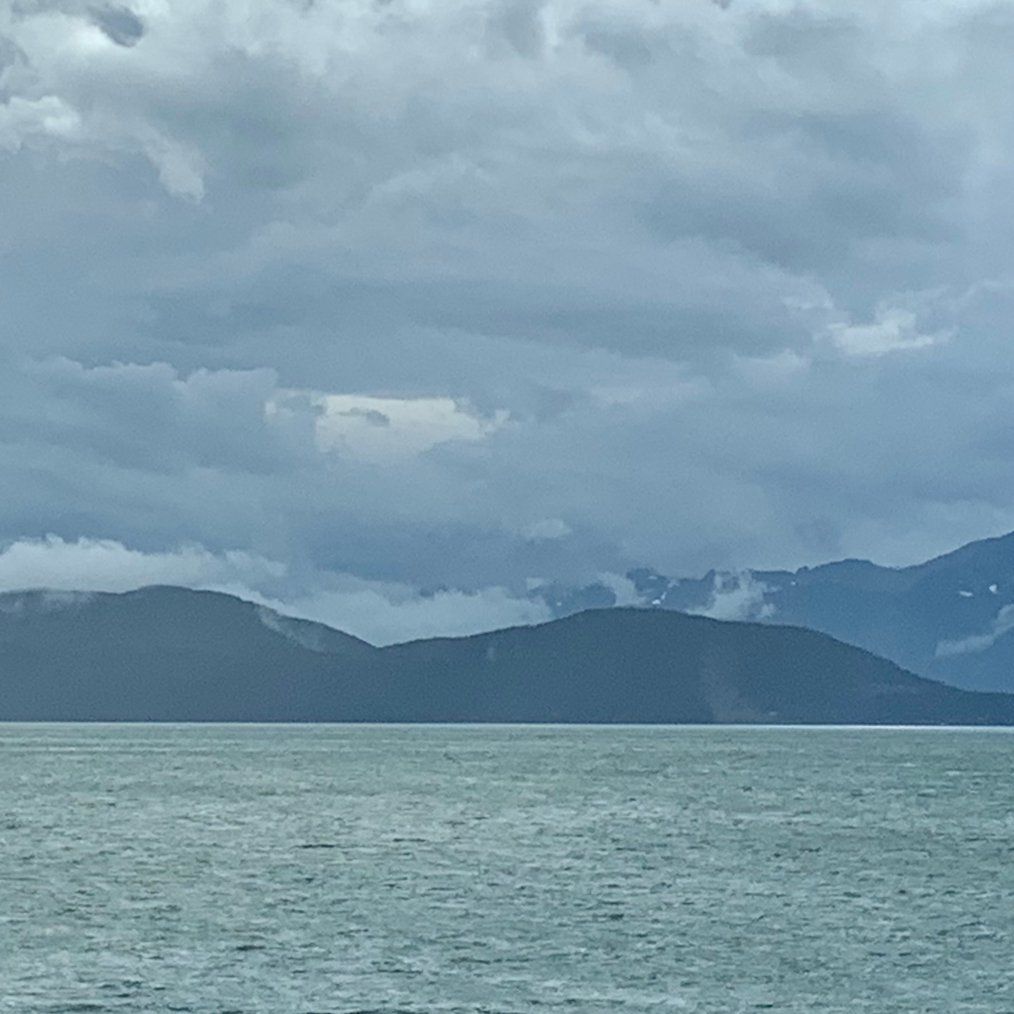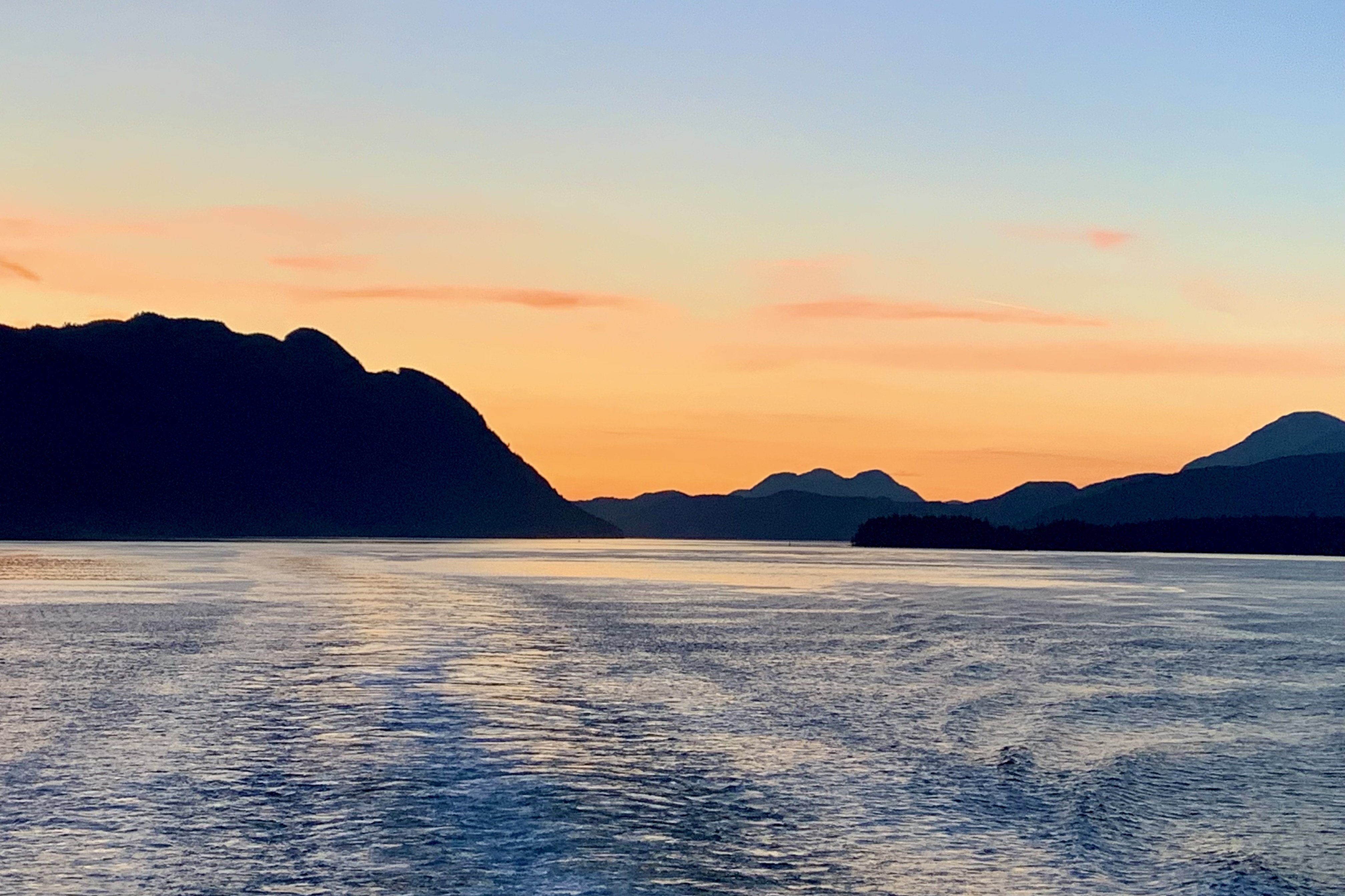Upon motoring out of Sitka around one pm, the waters remain tranquil for the rest of the day and the seaside views were an ongoing visual treat of a rolling landscape adorned with conifer forest , and clouds casting their mirrors image on the water. Towards days end while sitting at my window table in the restaurant, the sky became a pallet of orange and gold though it felt a bit ominous that the dense dark cloud banks did not take on any of the hues of the setting sun. I rested well having had a joyous day filled with eye candy.