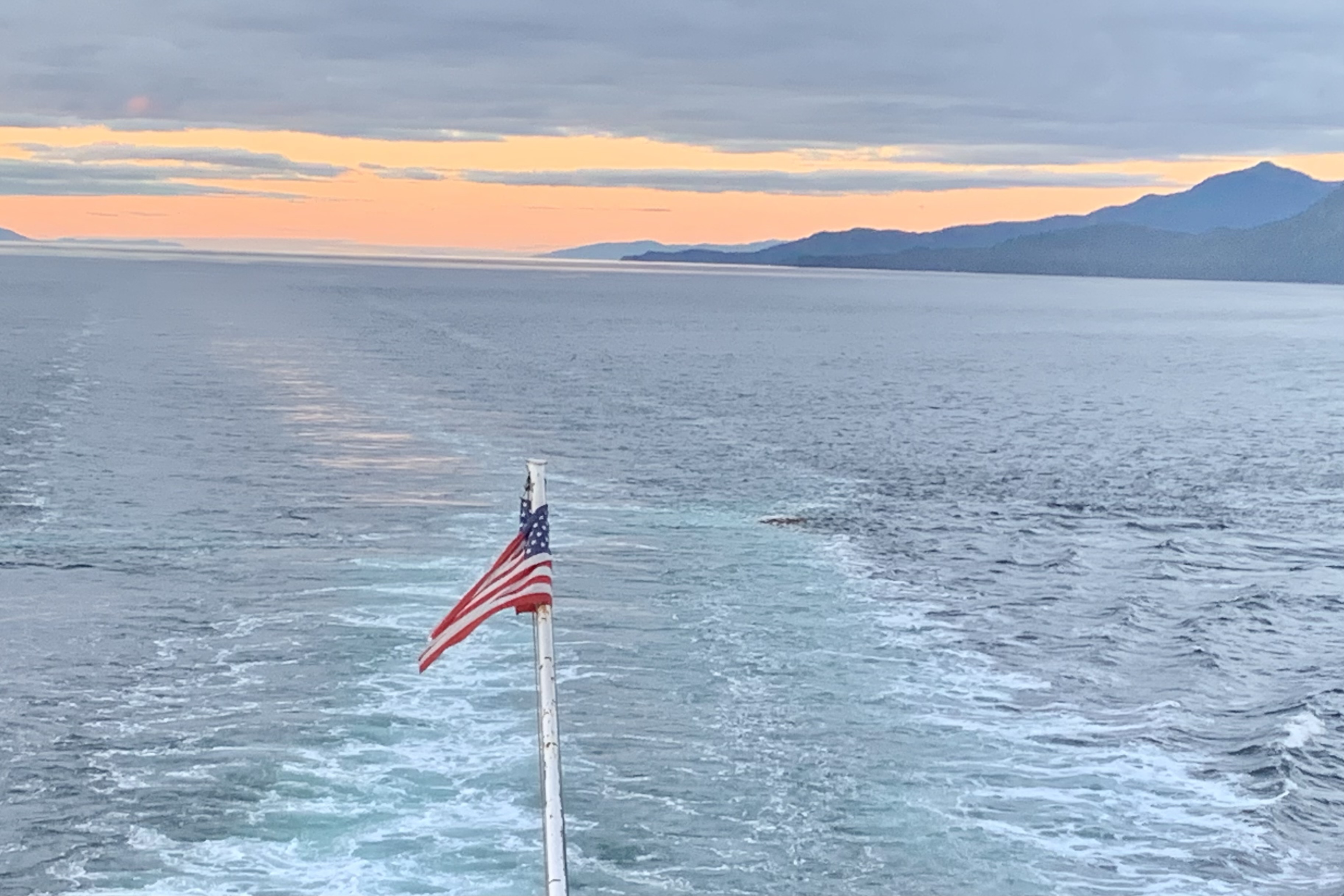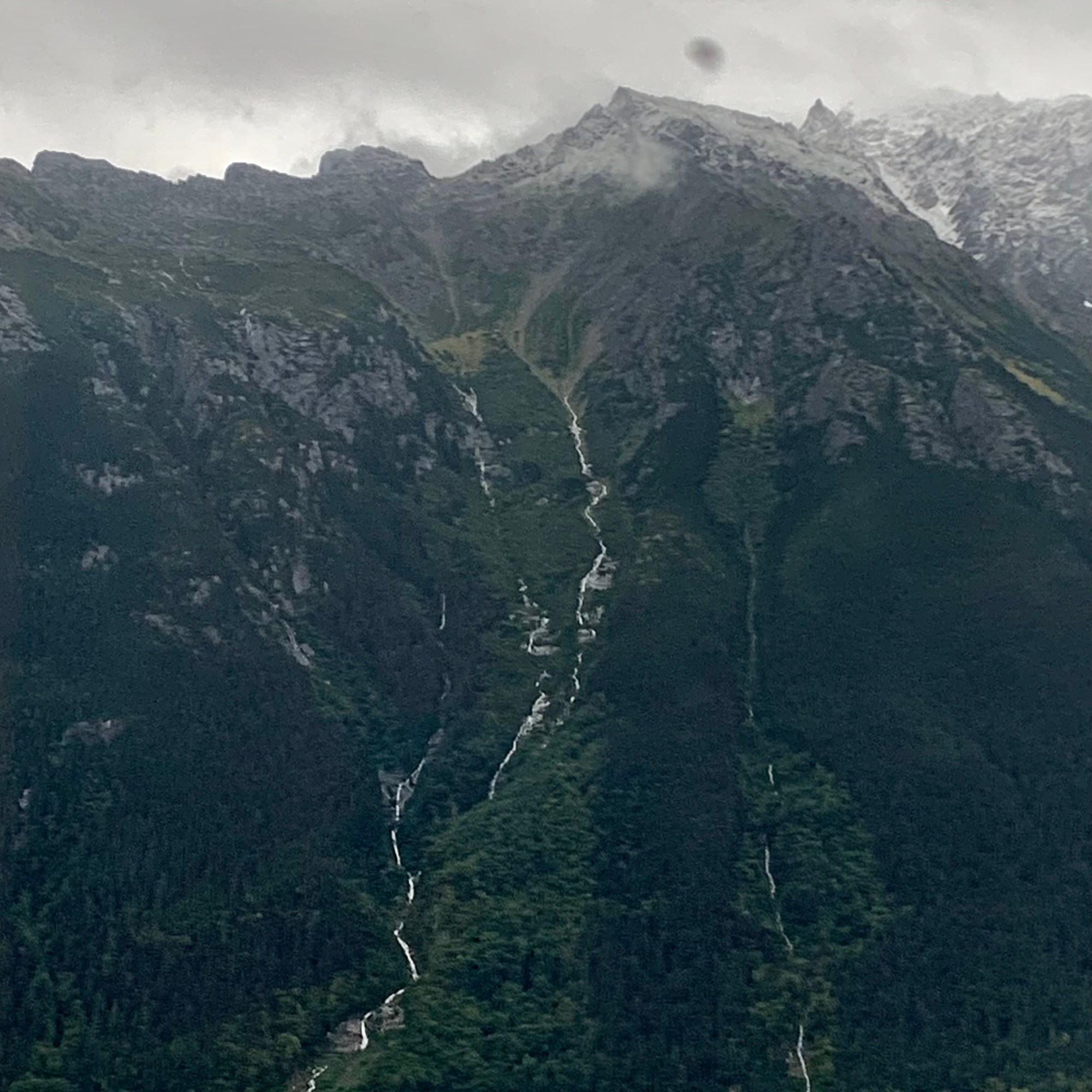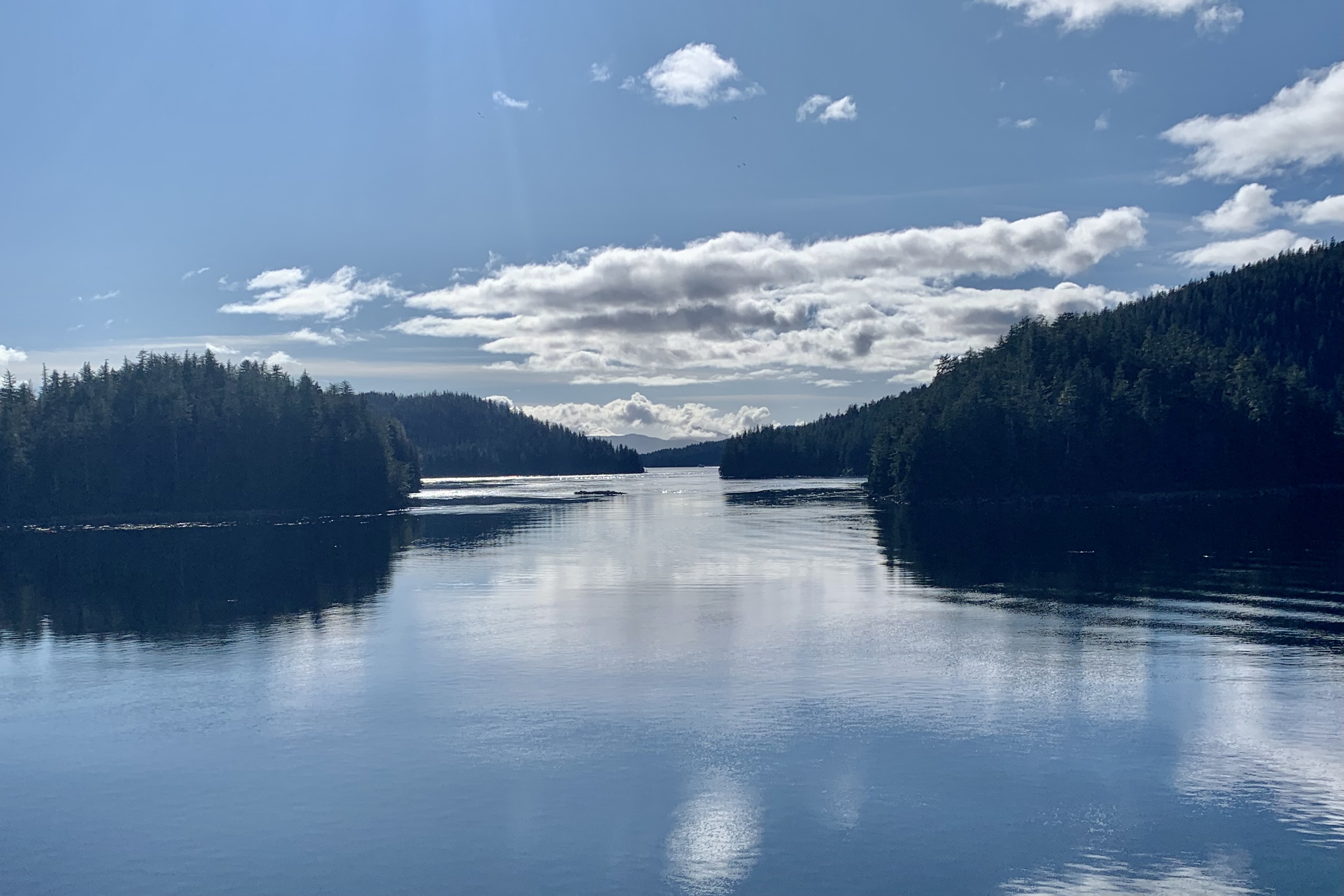 Upon motoring out of Sitka around one pm, the waters remain tranquil for the rest of the day and the seaside views were an ongoing visual treat of a rolling landscape adorned with conifer forest , and clouds casting their mirrors image on the water. Towards days end while sitting at my window table in the restaurant, the sky became a pallet of orange and gold though it felt a bit ominous that the dense dark cloud banks did not take on any of the hues of the setting sun. I rested well having had a joyous day filled with eye candy.
