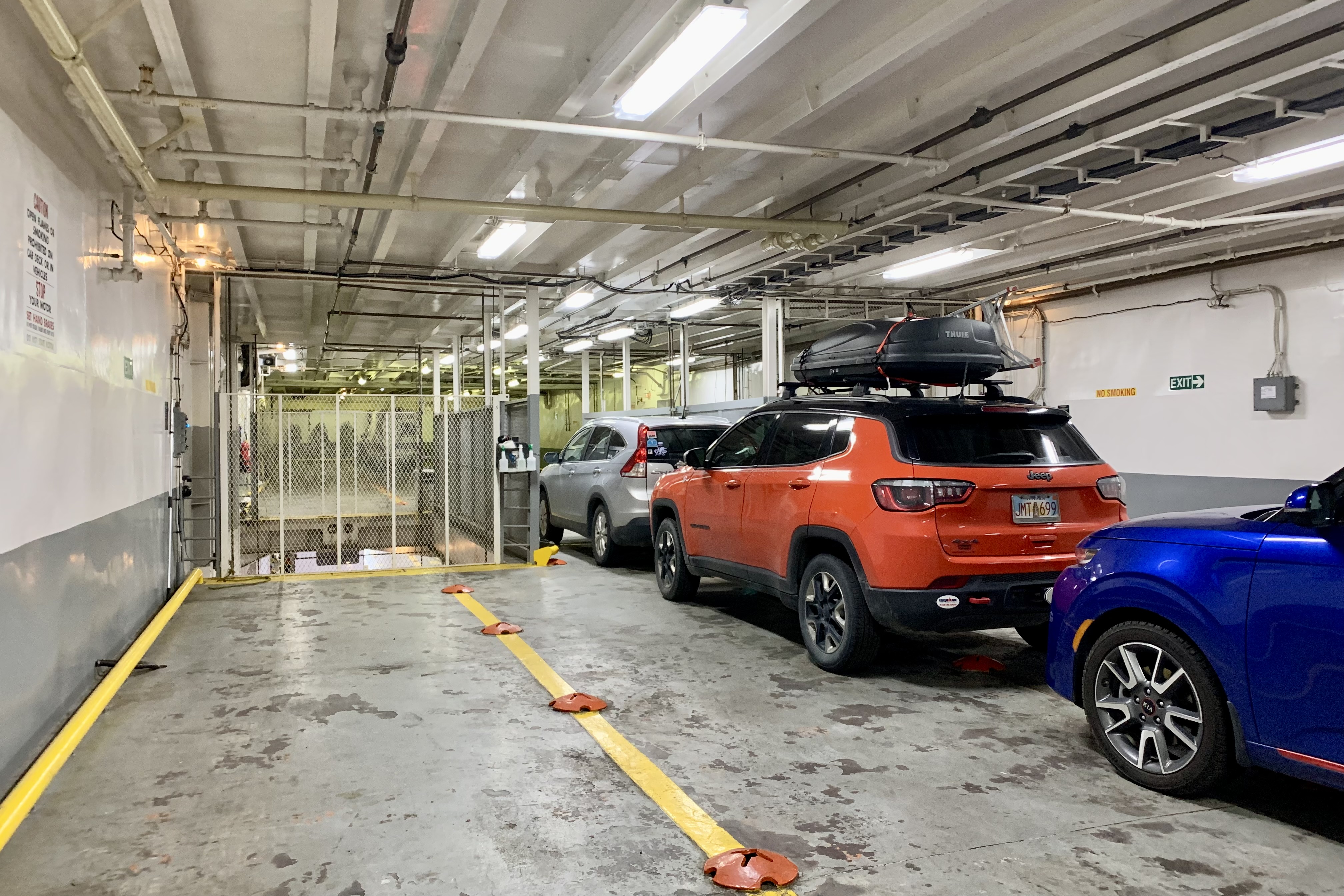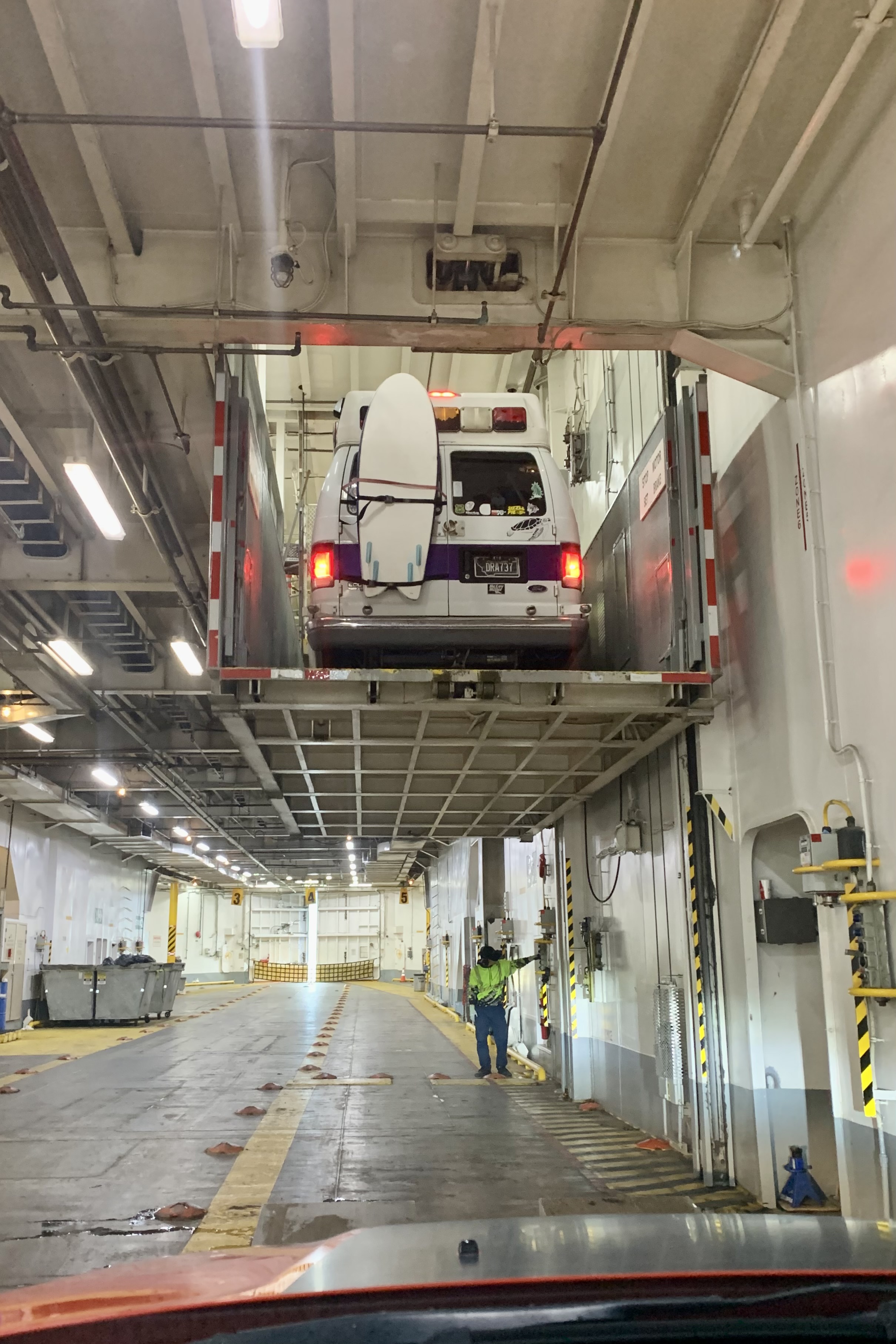My “Lady” had a “berth” on the Upper Deck as did I. However my quarters were a very spare sort of “stateroom” and hers was a tight space in vehicle stowage. I am not familiar with the terminology of decks on a ship. But the upper deck was far from the being the upper deck and actually was the lowest passenger deck. I was assigned cabin #119 which was quite close to the pursers desk, the elevator, but most importantly Lady Spitfires assigned spot. Why is this important? It may seem like I have personified this car, but actually it was quite easy to unload the luggage initially and then access the car (at appointed times or when in port) if there was something in there that I desired to move to my “stateroom.” The contents of said vehicle was a jumble of anything leftover from the move that didn’t get into the U-box, miscellaneous food items, clean and dirty clothes, maps, and a tall ladder.