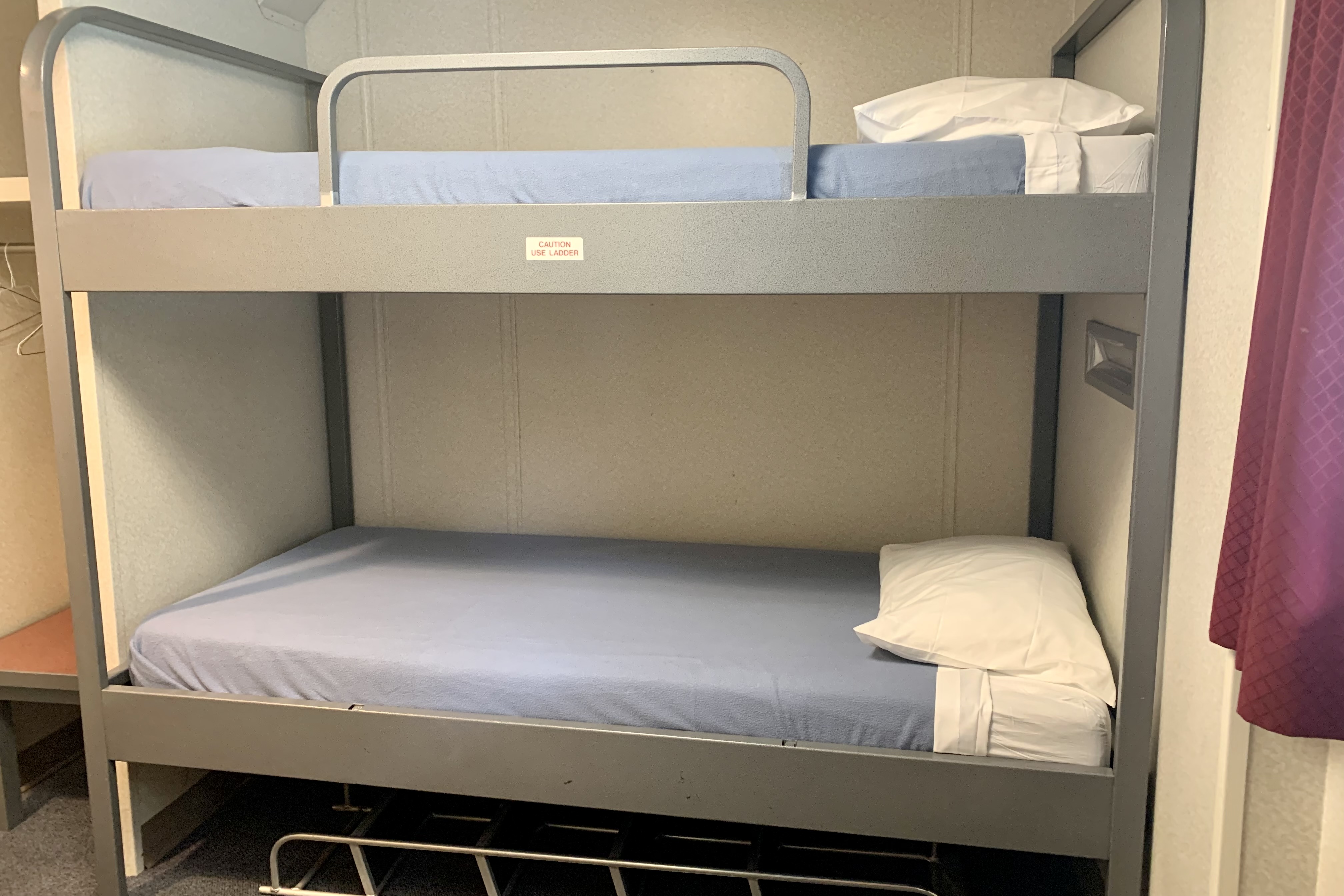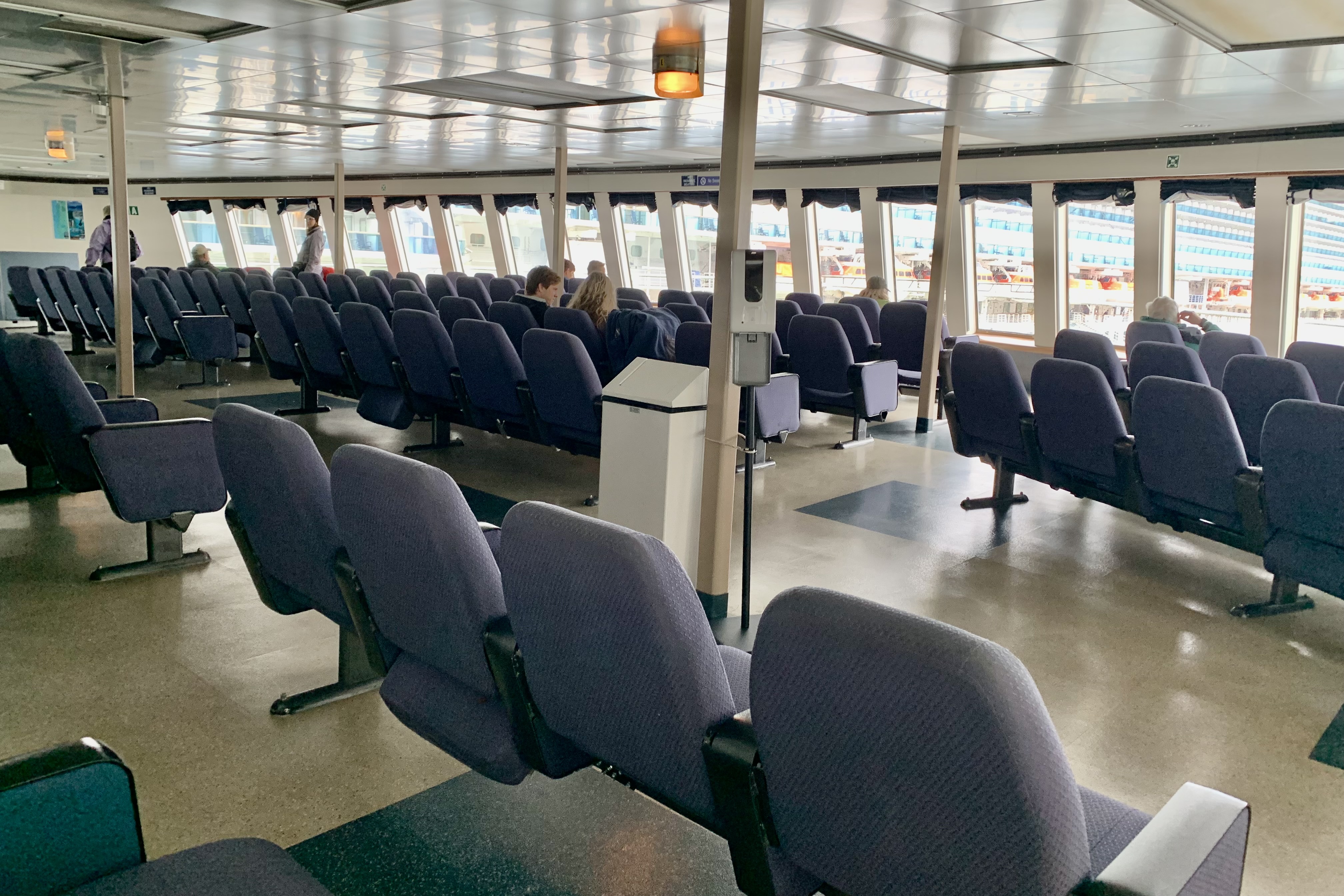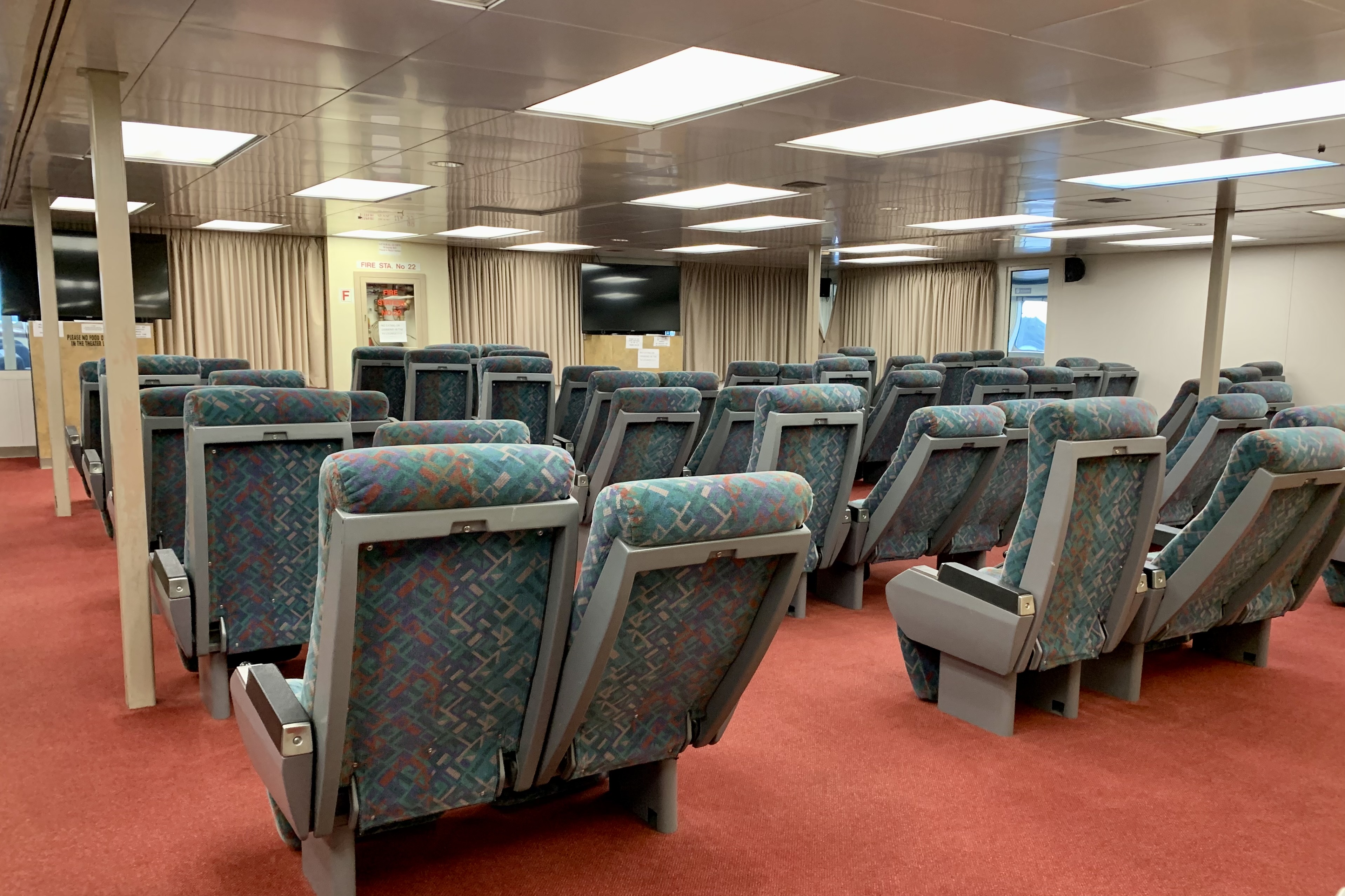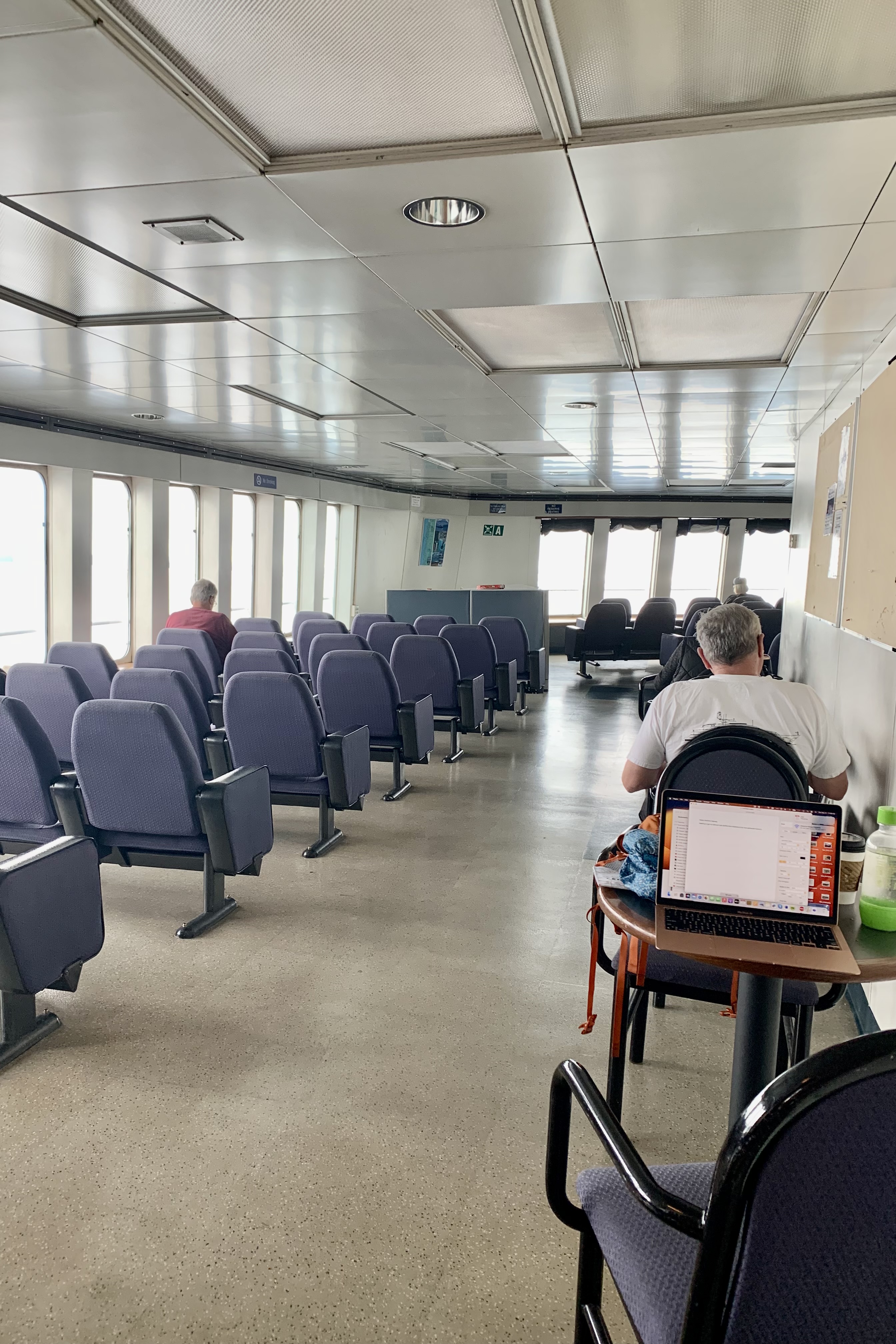 The ferry cabins are quite spare having minimal amenities. A real upside of the ferry is that one need not book a room but can opt to sleep most everywhere — in the observation lounges, on deck chairs in the covered heated solarium, in a pitched tent on the solarium deck, the movie lounge (which actually has only a large screen broken television). For the “un-cabined” there are lockers and showers available to use.