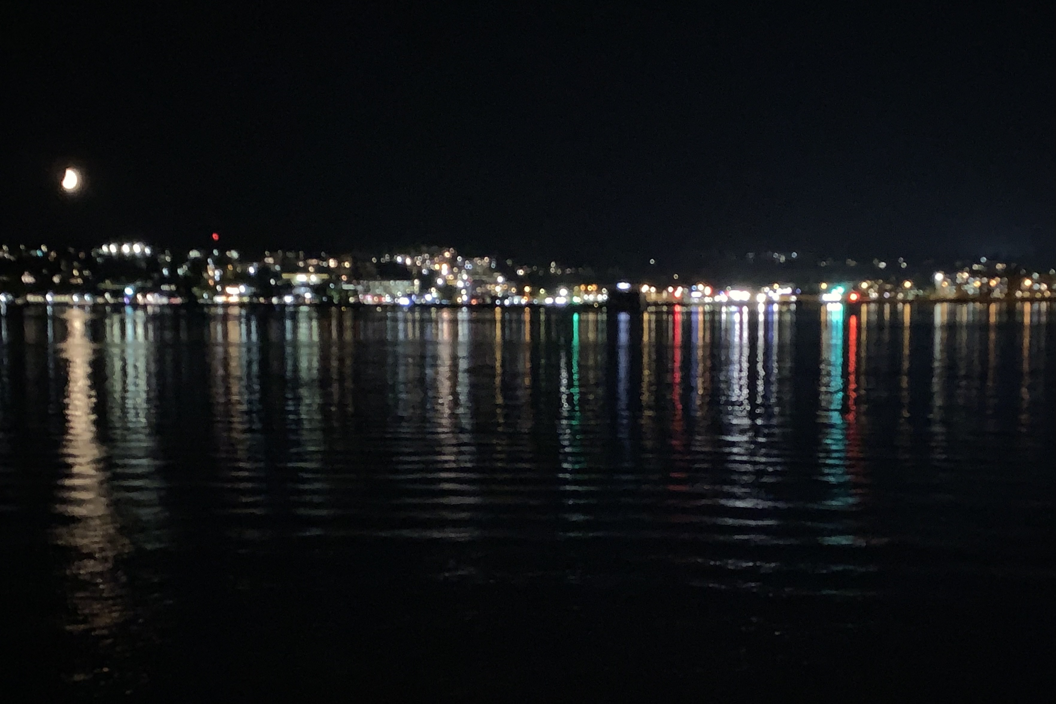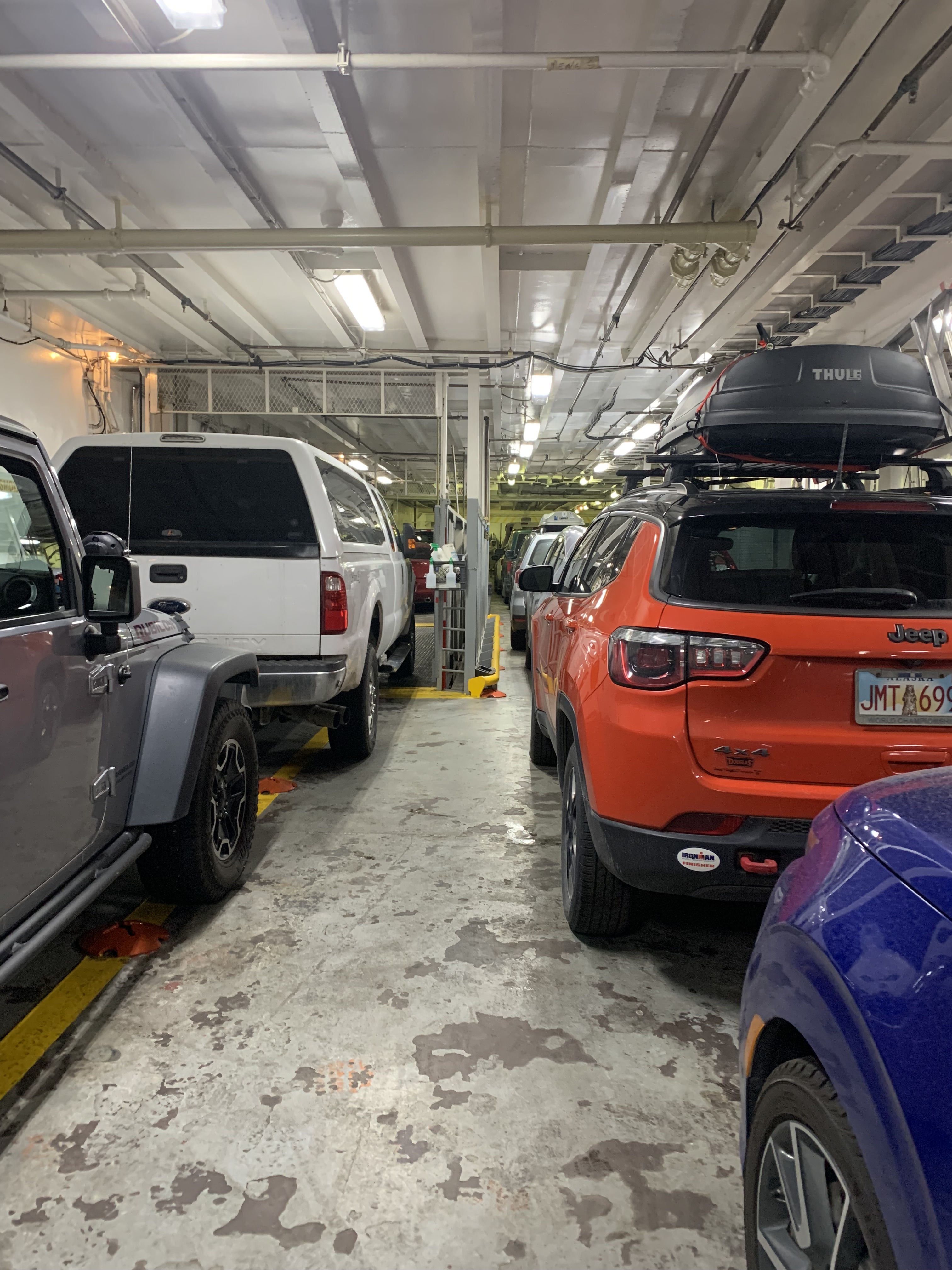 The tranquility of the evening was enhanced by a sky artistically painted with hues of tangerine, gold and orange, the moon’s reflection on the water , and the lights of the cities dancing along the shore. But it was time to get down to the business of preparing for the off-loading the following morning. The evening car deck call was an opportunity to start transferring all of the not essential items that had mysteriously accumulated in the cabin, so as to facilitate the exit of the myriad of motorized vehicles the following morning. Being quite near Miss Priss’ maritime domicile was a huge advantage as lines of people were traipsing down the stairs or waiting for the elevator with there massive suitcases, coolers, backpacks, and made in China treasures from the ports …