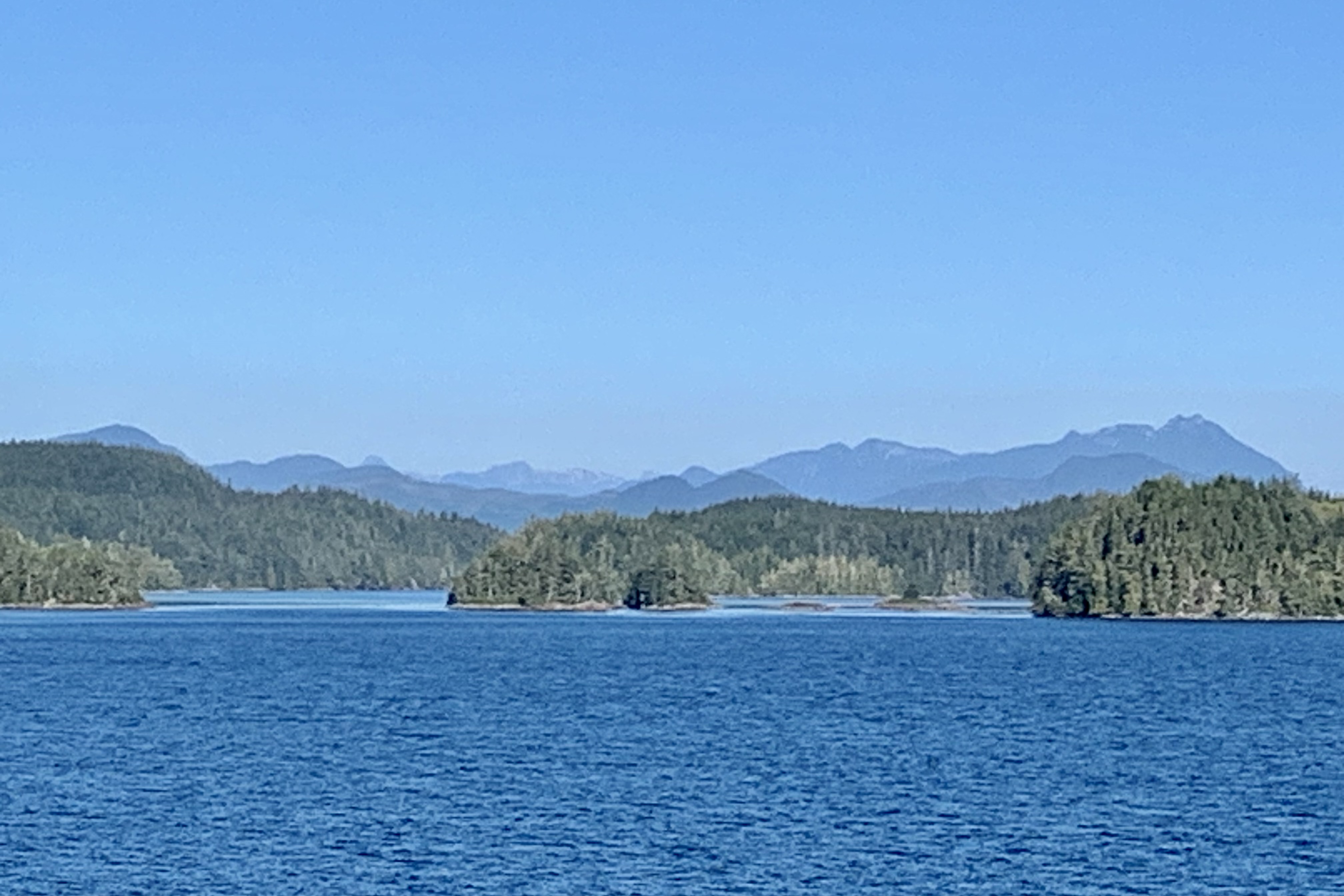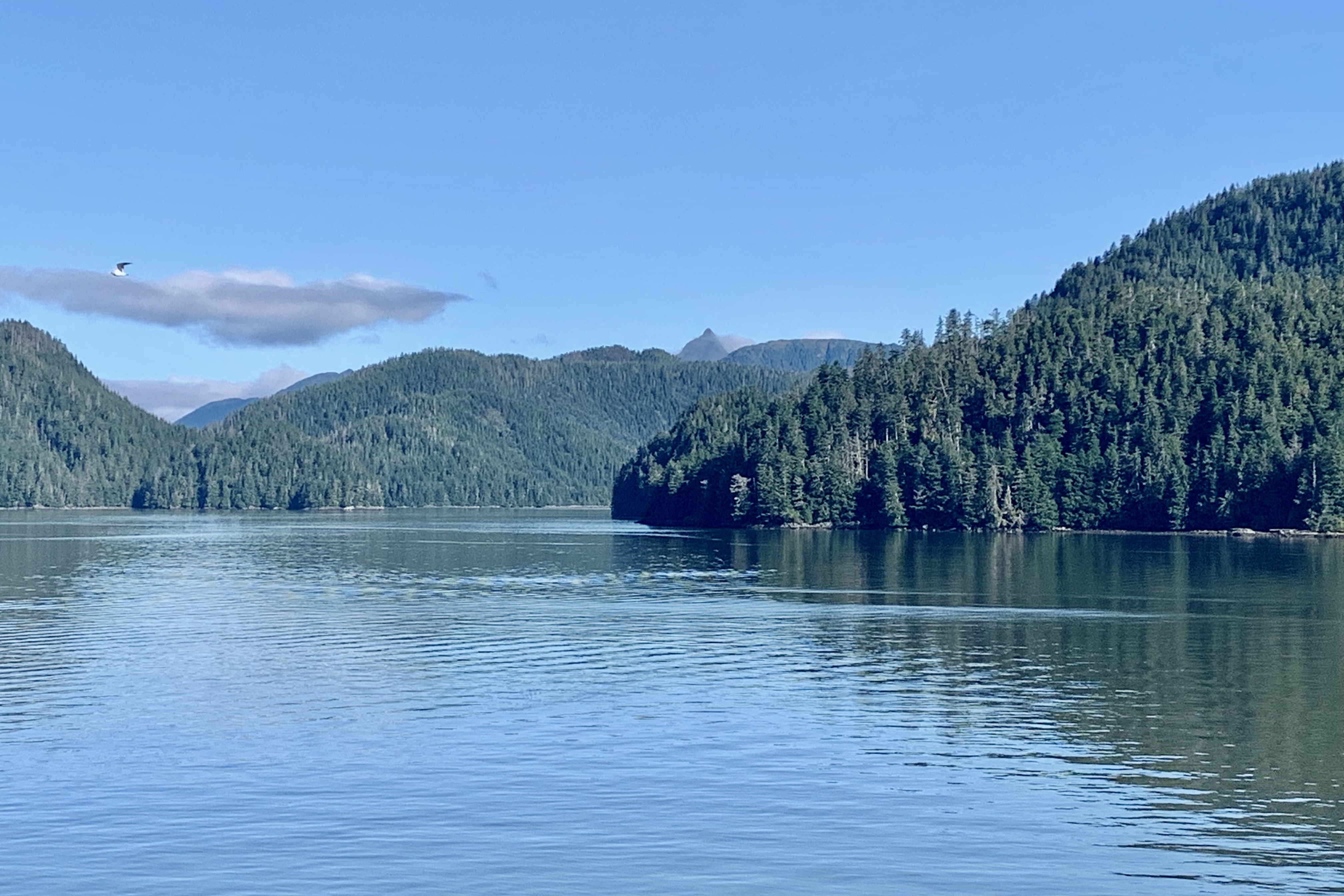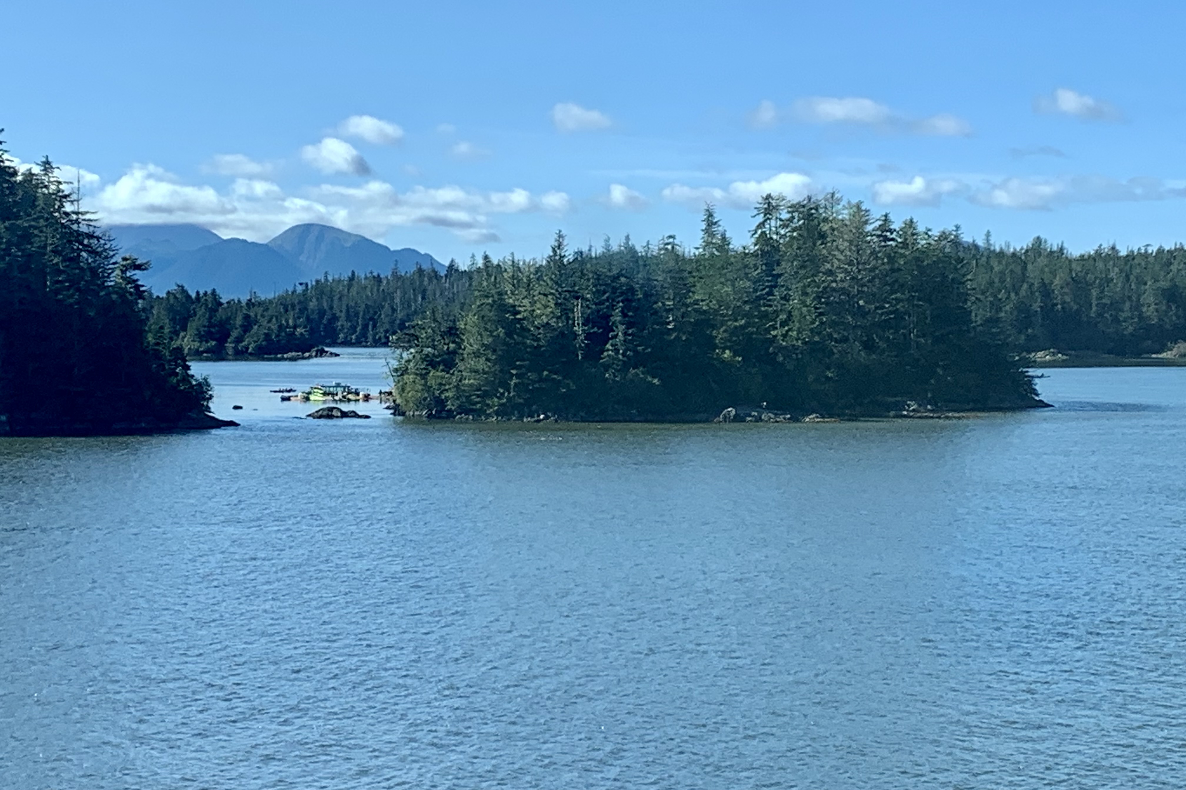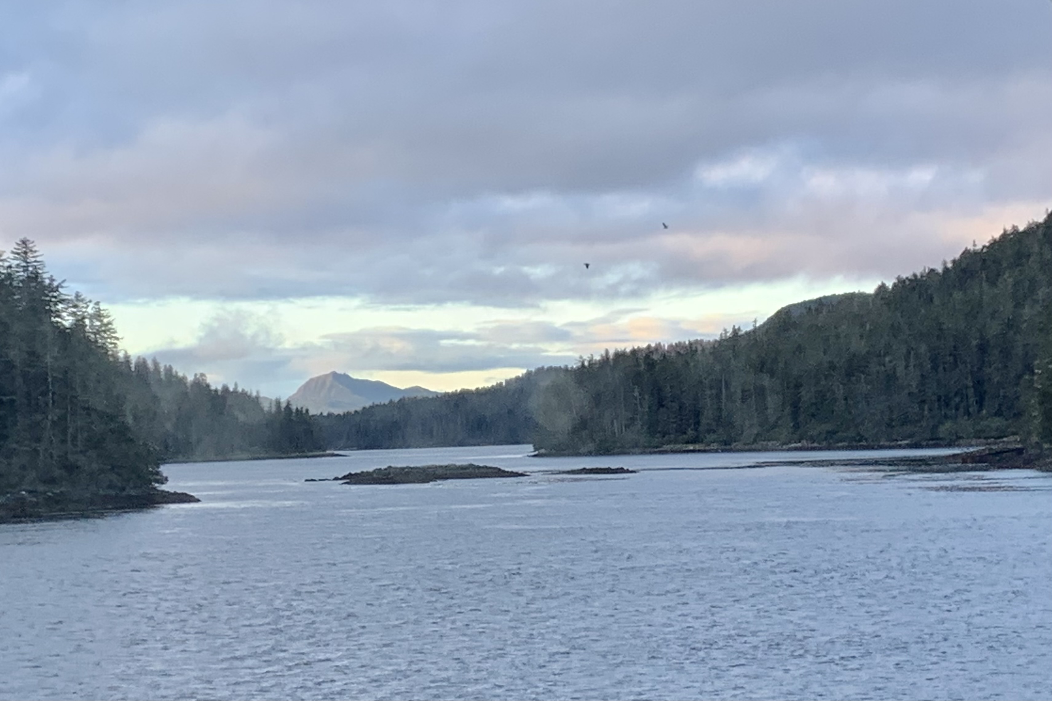 After arising and a K- cup of coffee, I found the early morning splendor of lush foliage, serene waters, a blushing sky and veils of mist over the islands was truly mesmerizing. Though we were now south of the higher jagged peaks and most of the mountains now lacked the ragged edges and snowy crowns of their northern sisters, I found them nonetheless captivating and elegant with the softer undulating shapes, the verdancy of forest-clad mountains, the rugged coastal reaches of Tongass National Forest,