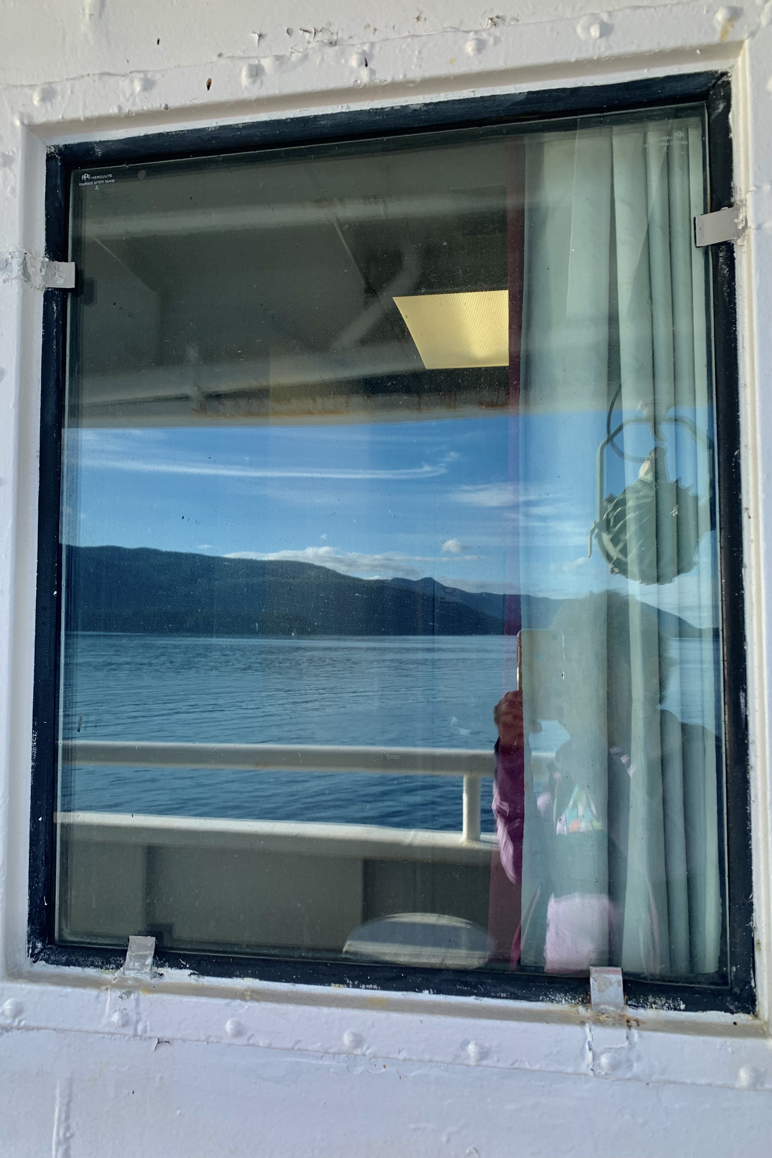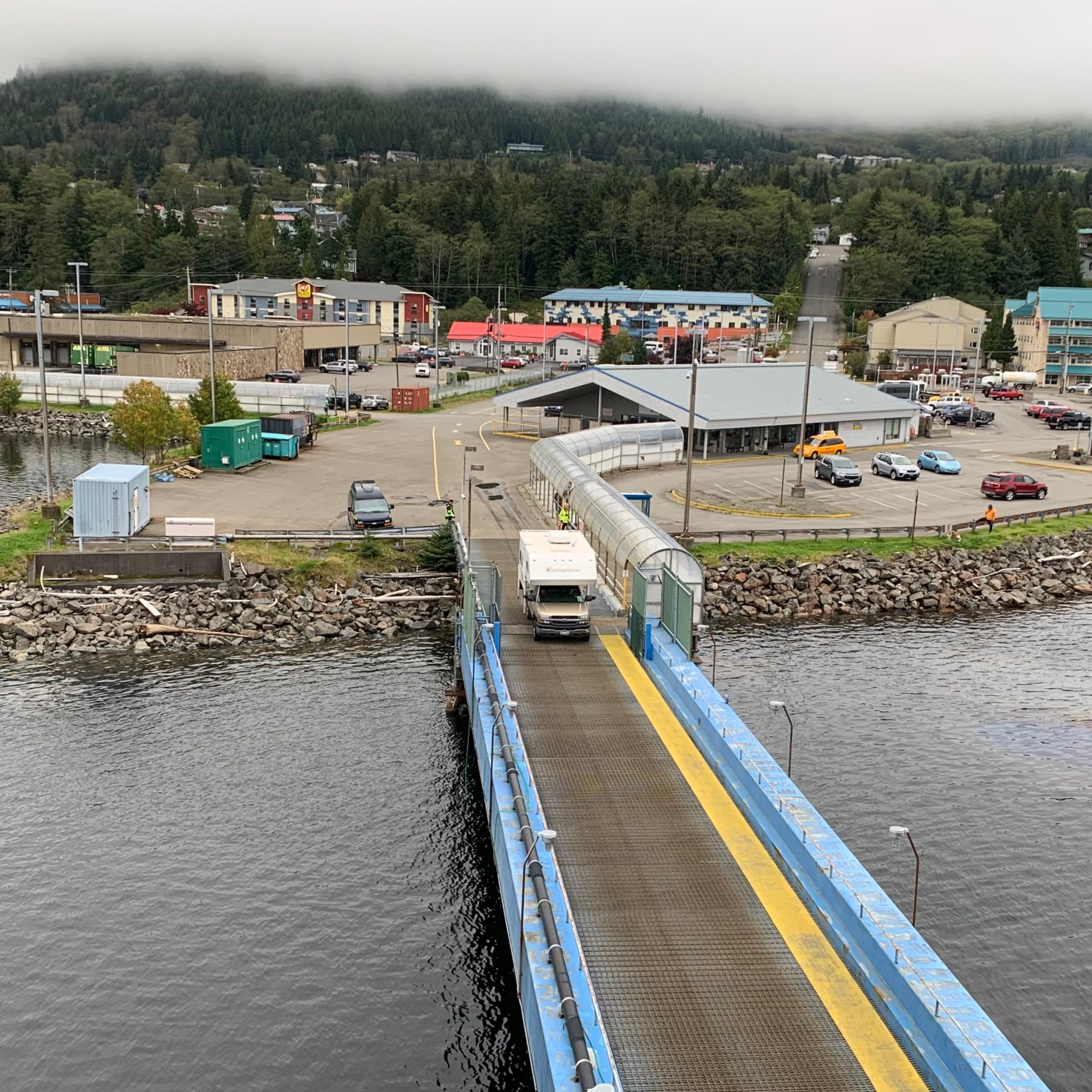 The Columbia was definitely dwarfed by the Ruby Princess as they were moored adjacent to each other in Skagway. The cruise ships follow the ferry route or is it that the ferry route follows the cruise ships. There are eight ports of call including Skagway where I embarked, Haines, Juneau, Sitka, Petersburg. Wrangell, Ketchikan and finally Bellingham. At every port there is the laborious time consuming process of off-loading and then on-loading of vehicles. When I loaded, 2nd in line as I arrived early, I drove onto an elevator and was lifted to the cabin deck and had to back trough a narrow passage way between the car elevators to my assigned spot- which I assume would facilitate the exit process. I will add right now it did NOT…I had to go back through that narrow passage and back onto the elevator. Since I was the 2nd car to be loaded in Skagway I naturally was the 2nd to last off, waiting an hour to be sprung free . I definitely had a lot of time to ponder the windshield and steering wheel in Lady Spitfire as we had to remain in our car.